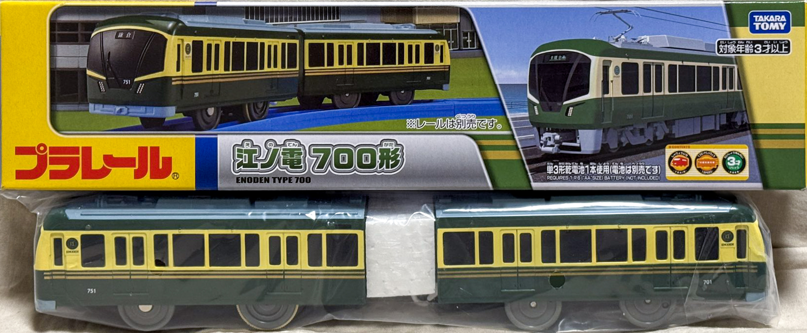 江ノ電も1999年にプラレールの限定発売に参入。「ちんちんでんしゃ」の塗り替えでしたが人気が高かったらしく、翌2000年に屋根を塗装を施し車輪をグレーに変えたグレードアップ品として再販されました。「えのでん」は無窓箱ですが、箱の色の濃淡でいつの製品か判断できます。濃い緑が1999年版、薄い緑が2000年版です。