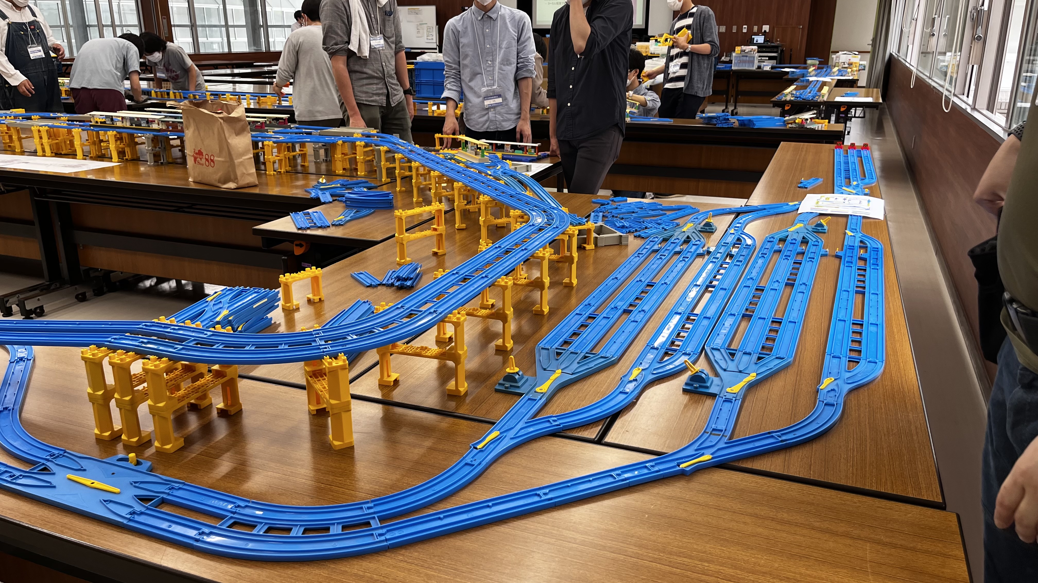 ぶっつけ本番というわけにも行かないので、まずは練習ダイヤなるもので流れを把握。参加者全員が全員プラレールのスペシャリストというわけではないので、駅やポイントの操作もこの練習時に慣れておく必要があります。