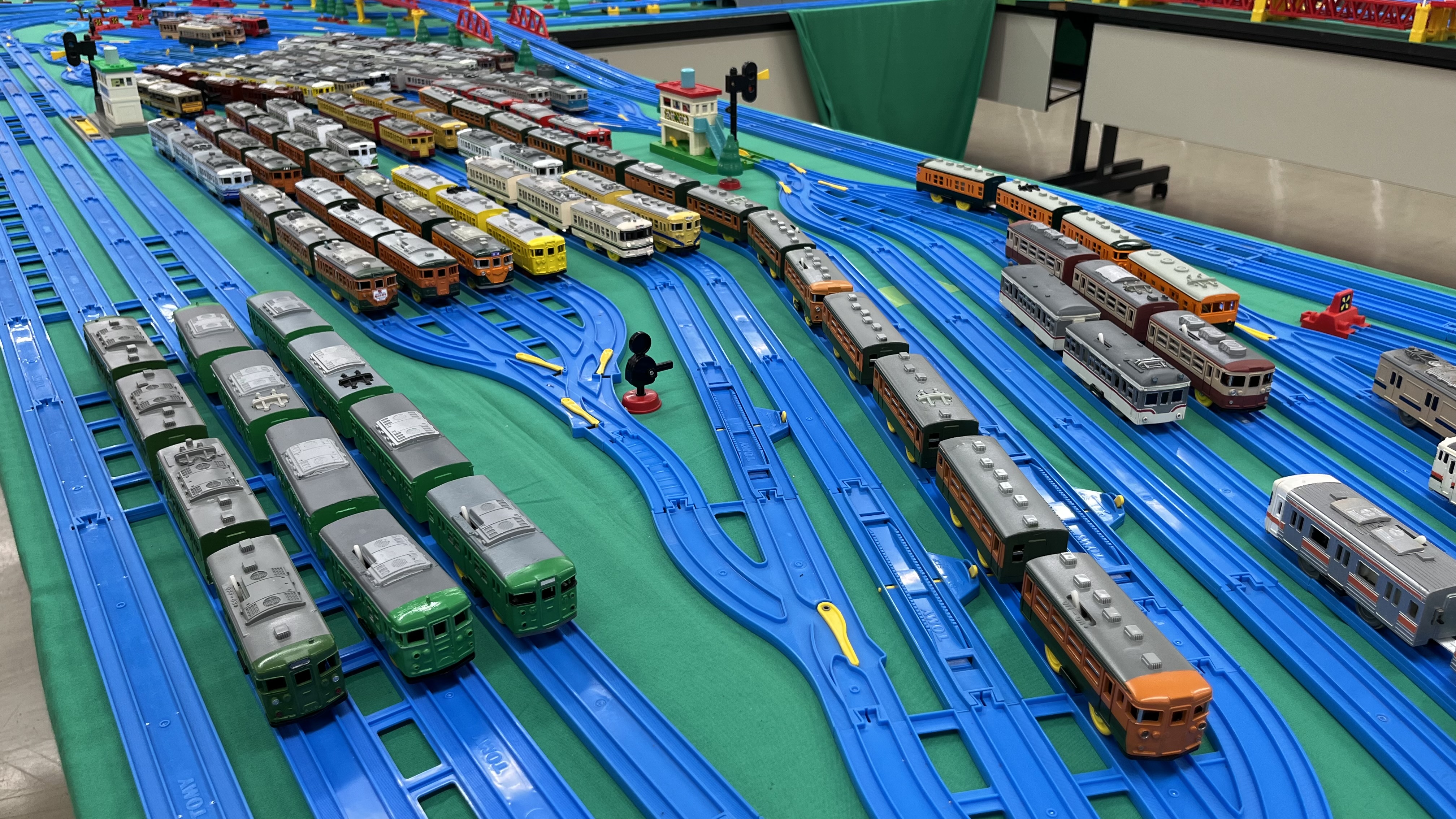お馴染みの東海型急行電車165系から、451系、153系、717系、113系、455系、401系など、同じ顔でも色が違う車両がズラッと並ぶ様子は圧巻です。