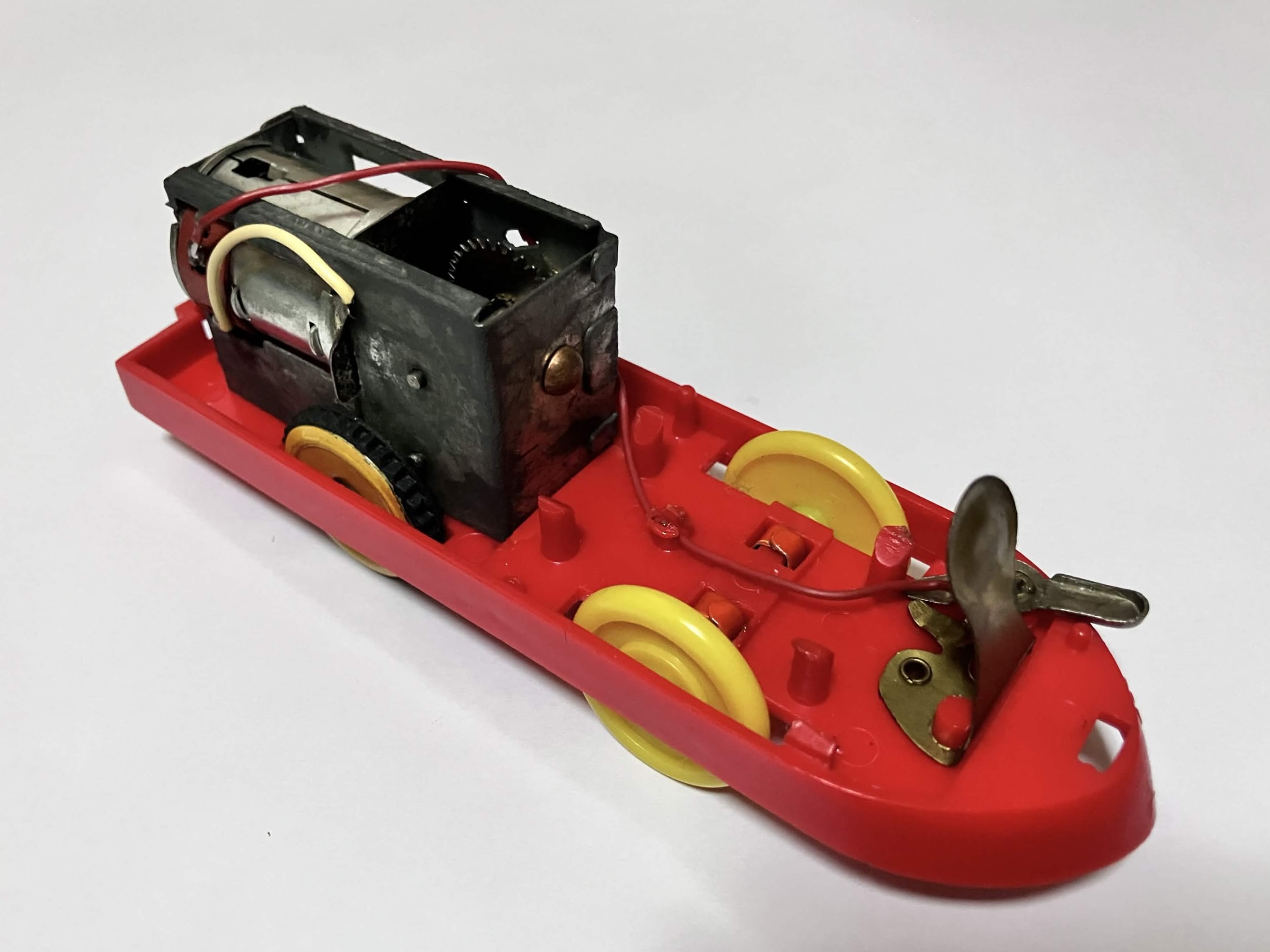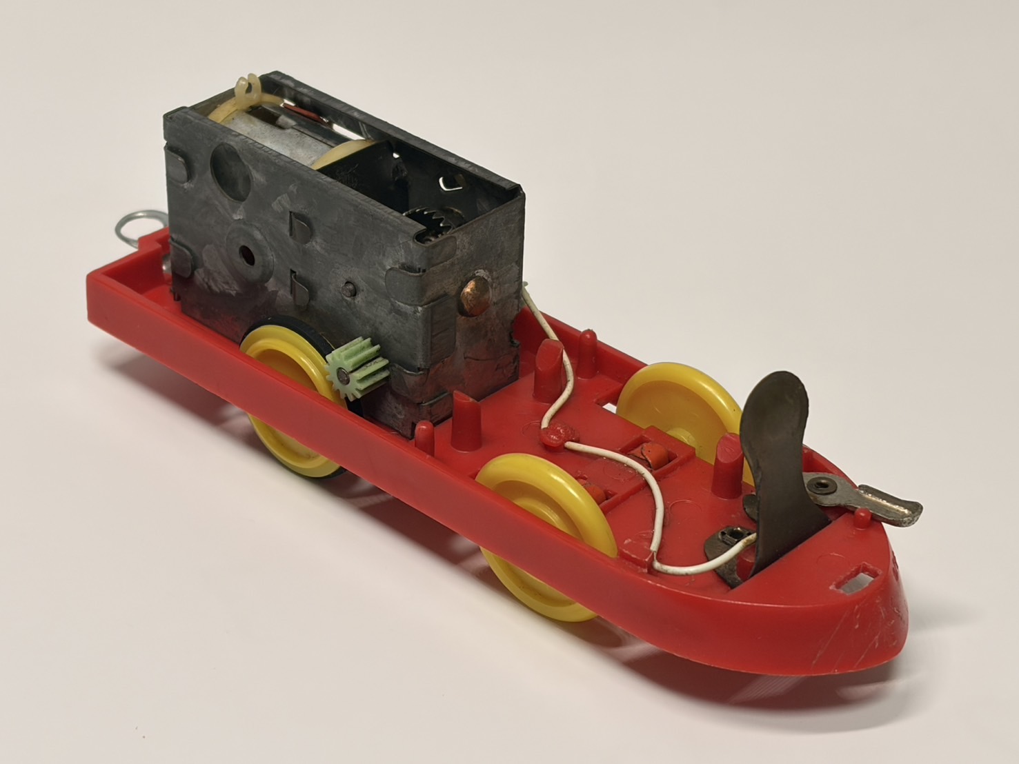 「電動超特急ひかり号」の動力シャーシ。モーターユニットは「電動プラ汽車」のものと同様。スイッチは先頭部に付いており、車輪はブリキ製。