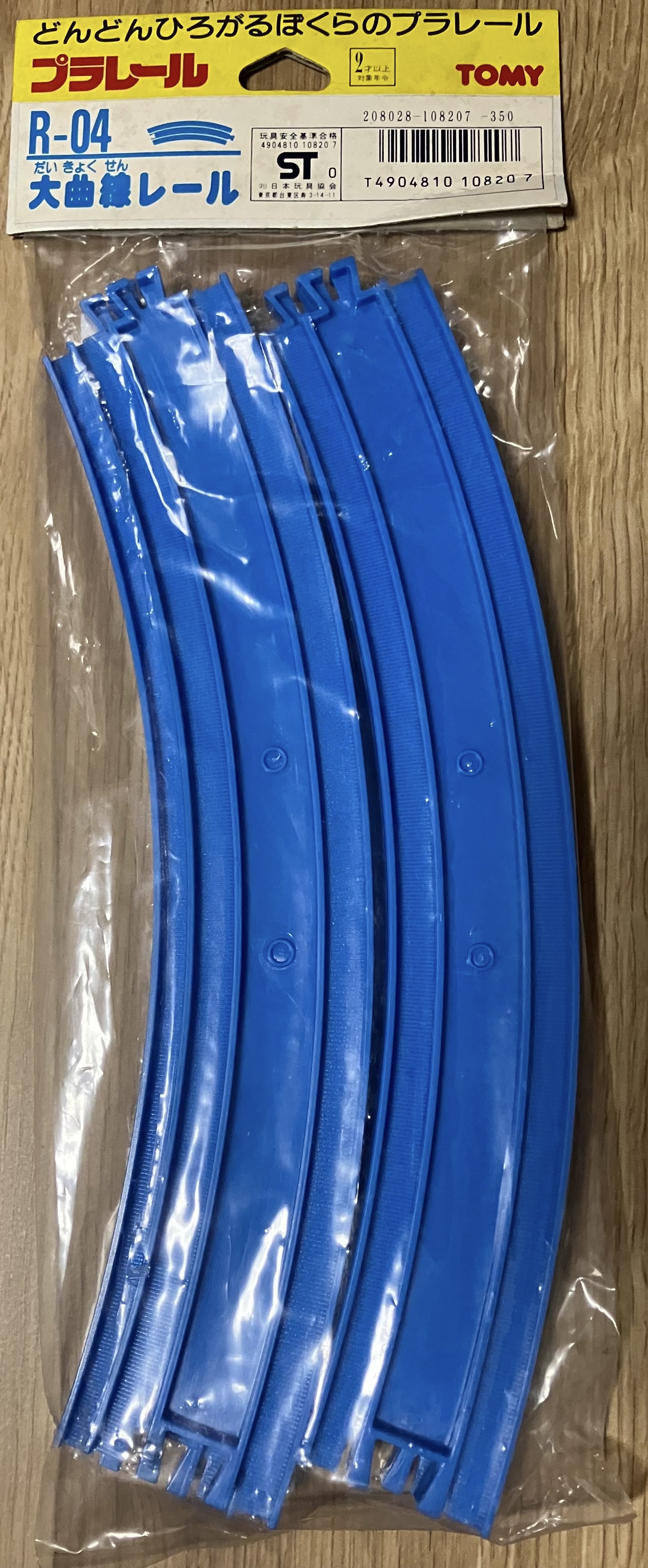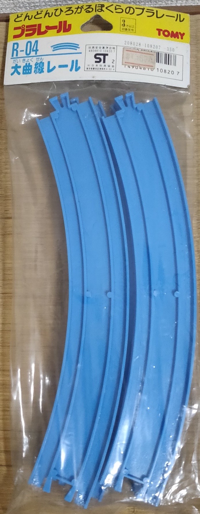 曲線はともかく、直線は単線レールで敷けるだろという判断があったのかもしれませんね。1998年に大曲線レールの欠番を埋める形で「R-04」として再発売、現在に至ります。