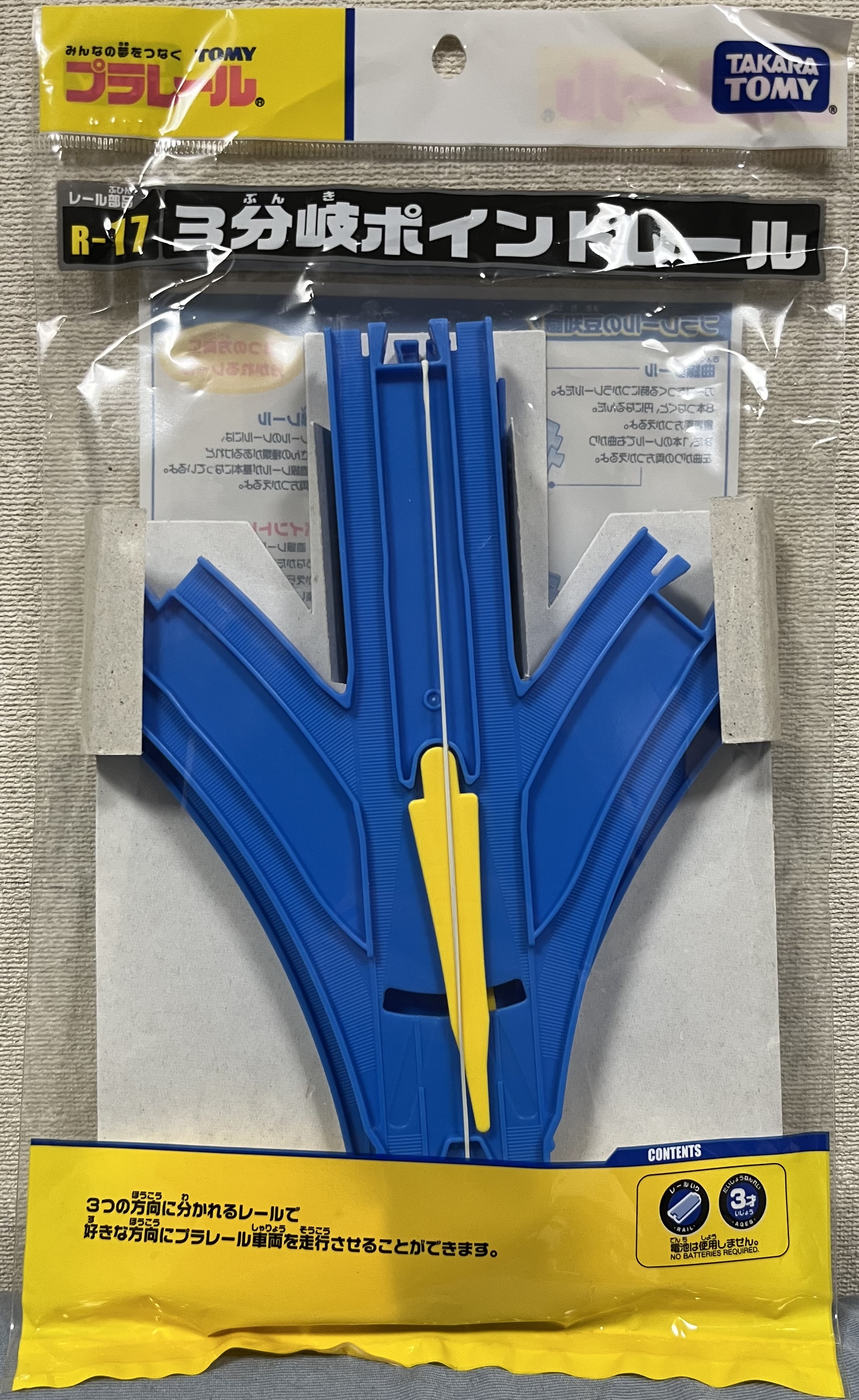 4線に分岐し、レバーが2本もある重厚な印象を受けるレールです。車庫や操車場をもってこいで、事実「おうふくプラレールそうしゃじょうセット(1975年)」にセット内容として含まれています。