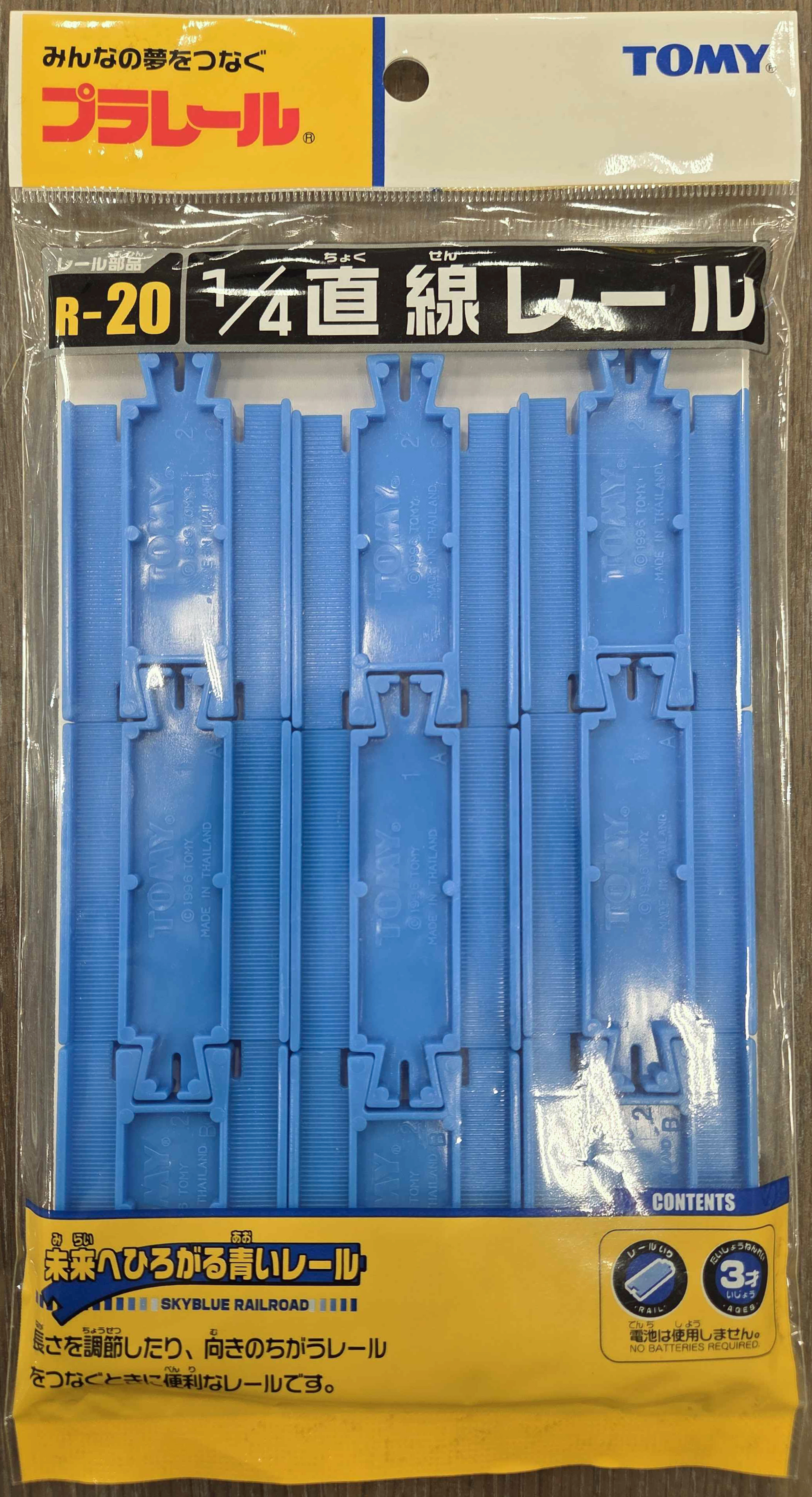 プラレールの初期から現在まで販売され続けている定番のレール。発売当初から一貫して車止めが2個付属します。1988年以降はR-08が付番されています。
