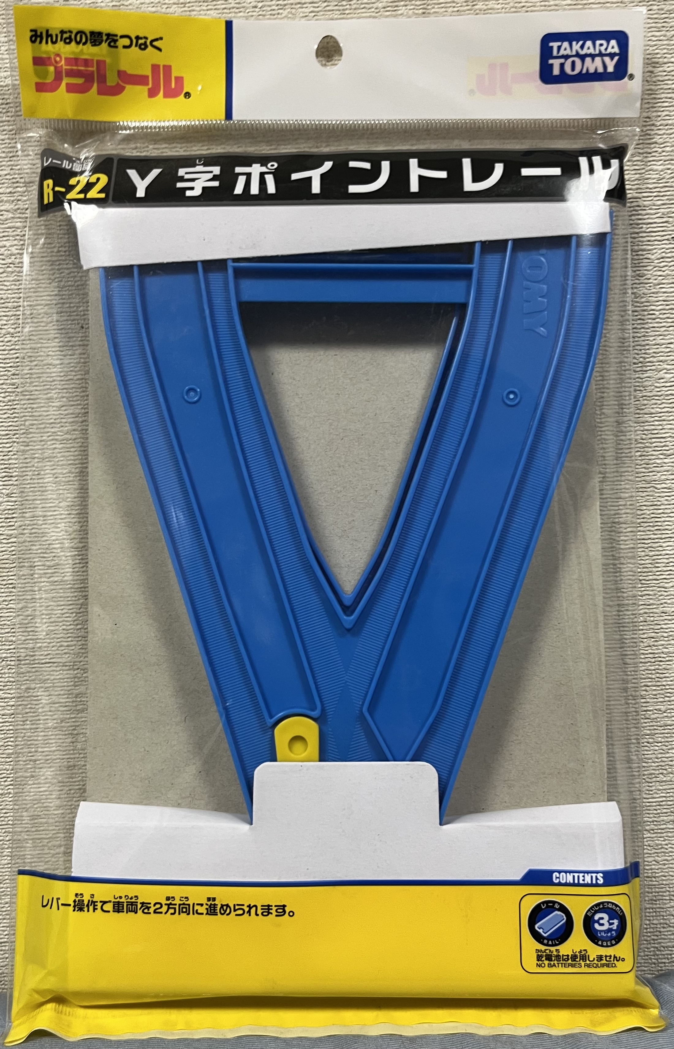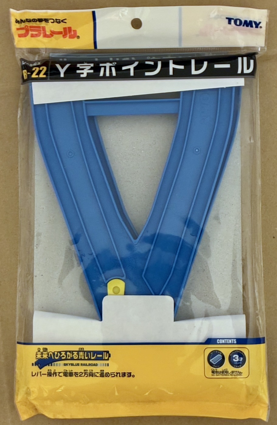 2005年に発売された、単線から駅幅の複線に間隔を広げるためのポイントレール。プラレールでは過去、同じく駅幅をレールで挟むかつ大曲線と通常曲線で複線を構成することが出来た「Y型レール」(1961〜76年)と、一部では変則単複と呼ばれている単線の軌道中心から分岐して複線レール幅に変換する「Y字ポイントレール」(1997年)の、Y字(型)を称するレールが2つ登場しており、こちらは名称だけで言えば事実上3代目です。