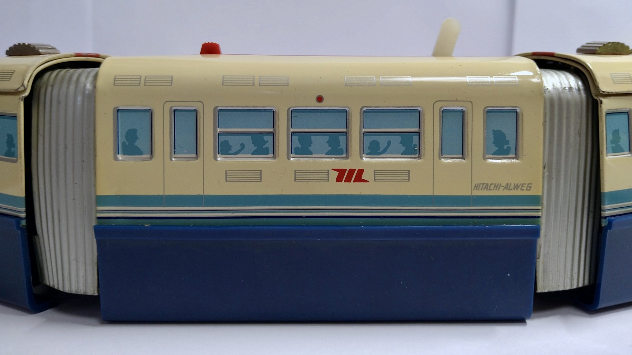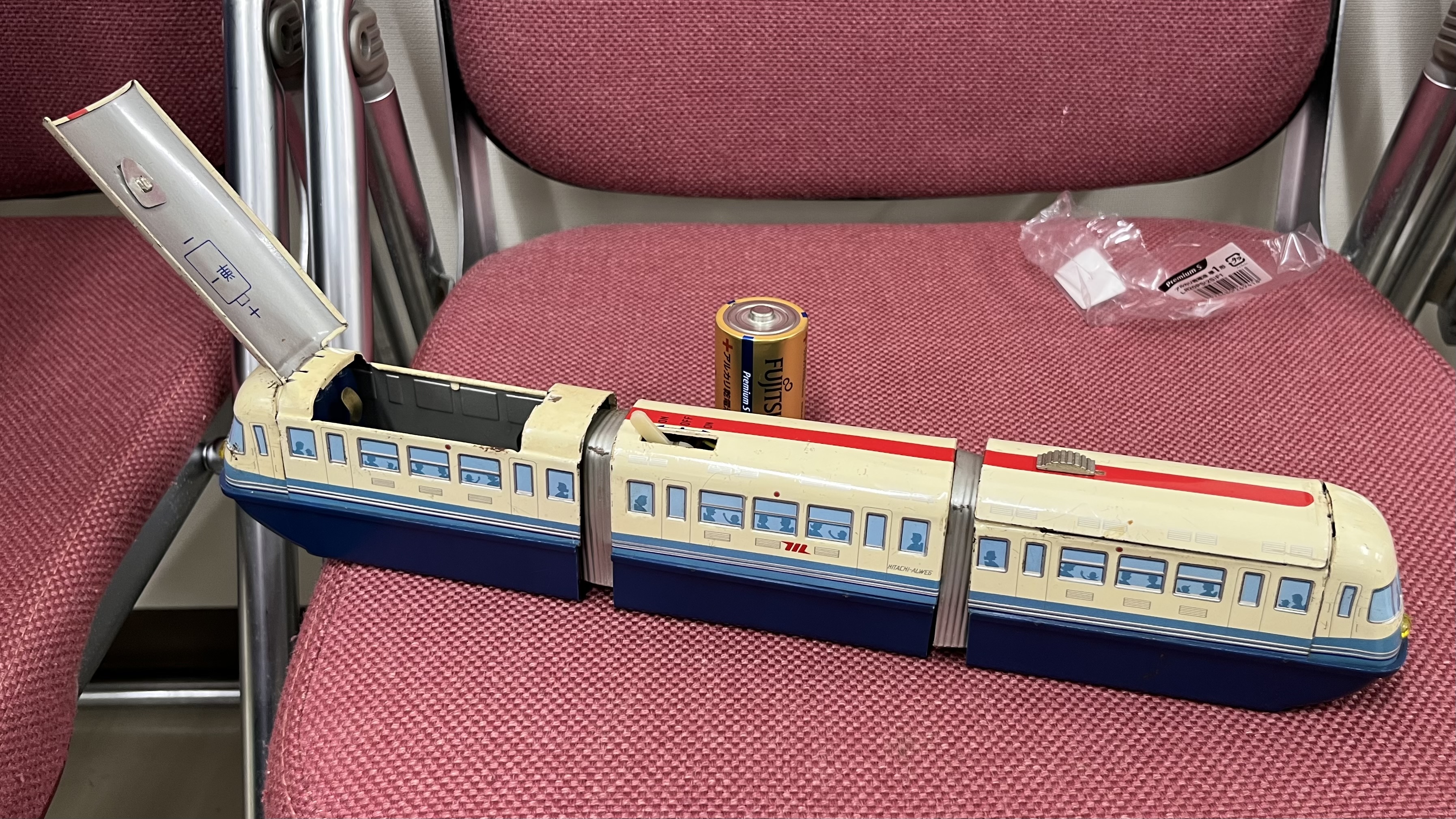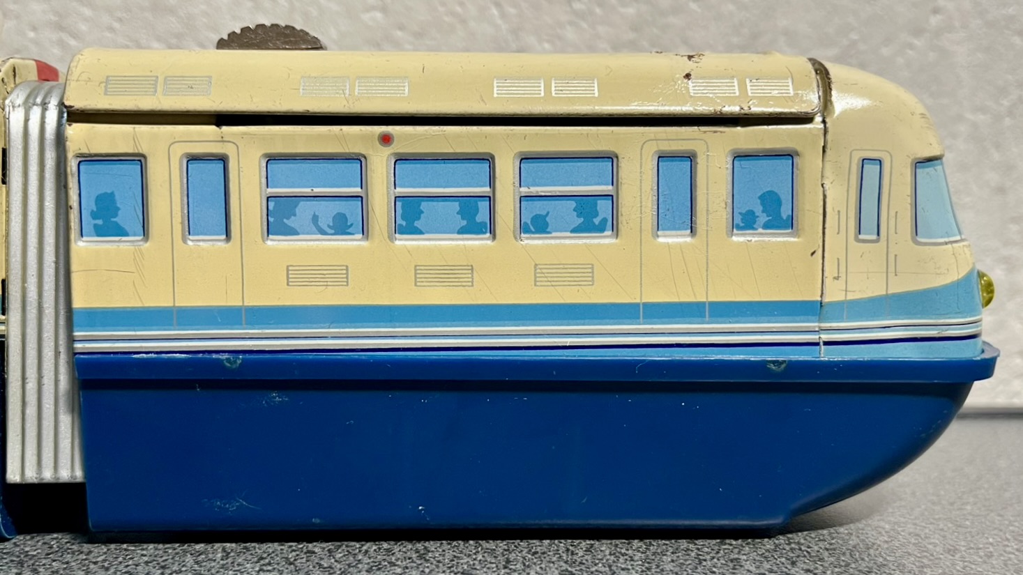 車両は車体がブリキ製、足回りはプラスチック製です。当時のブリキ鉄道玩具に倣い、窓には乗客の姿も描かれていますが、ハイウェイバスのように一人ずつ表情を付けているわけではなく、シルエットで表現されています。動力は中間車に積まれており、単1形乾電池2本を使用するというなかなかの高コスト仕様です。先頭・後尾が電池ボックスとなっています。