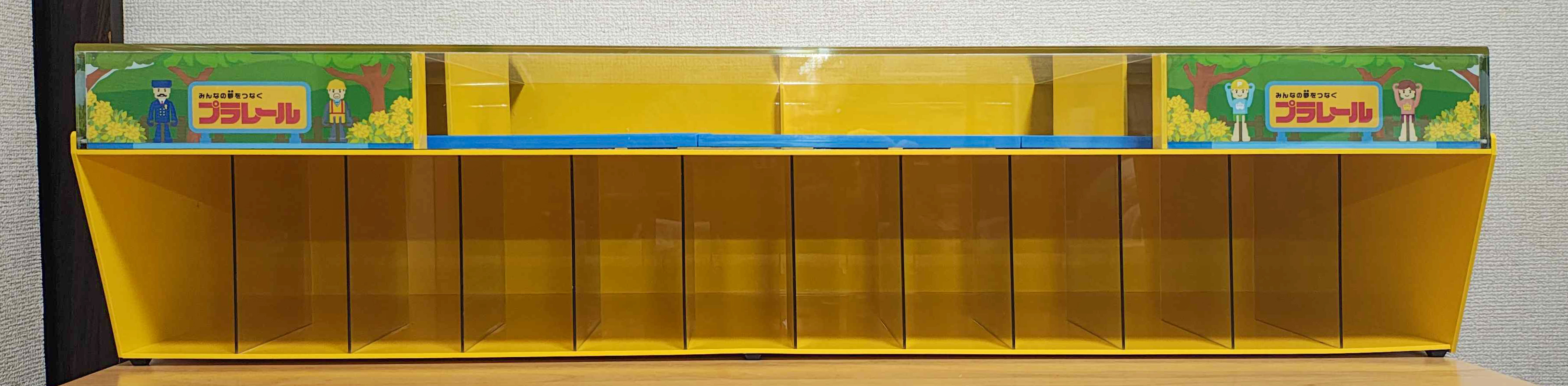玩具店、おもちゃ売り場の店頭用に用意された単品車両用のディスプレイケース。並べ方は特に決まっていないようです。