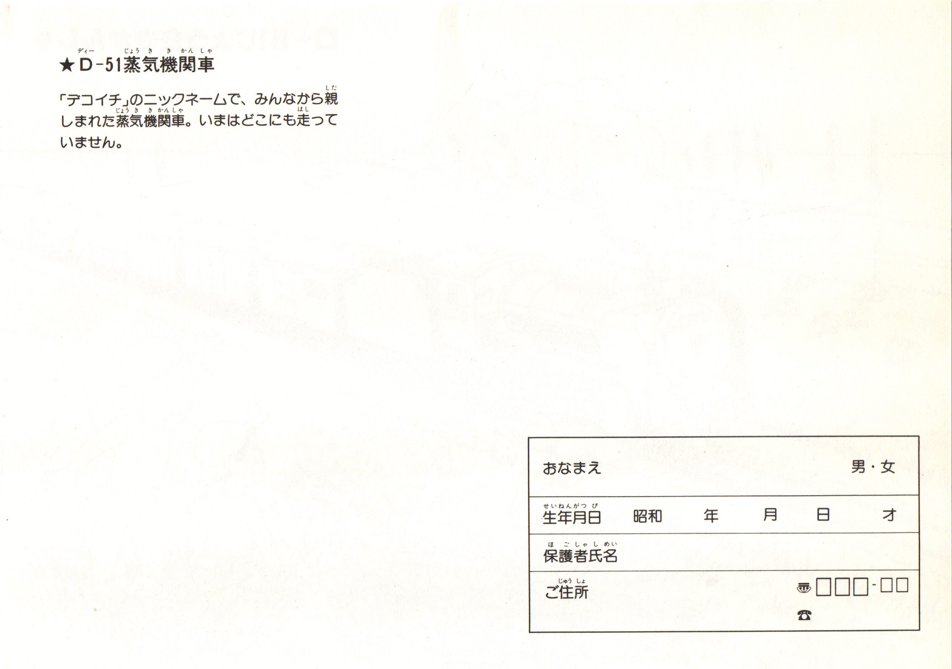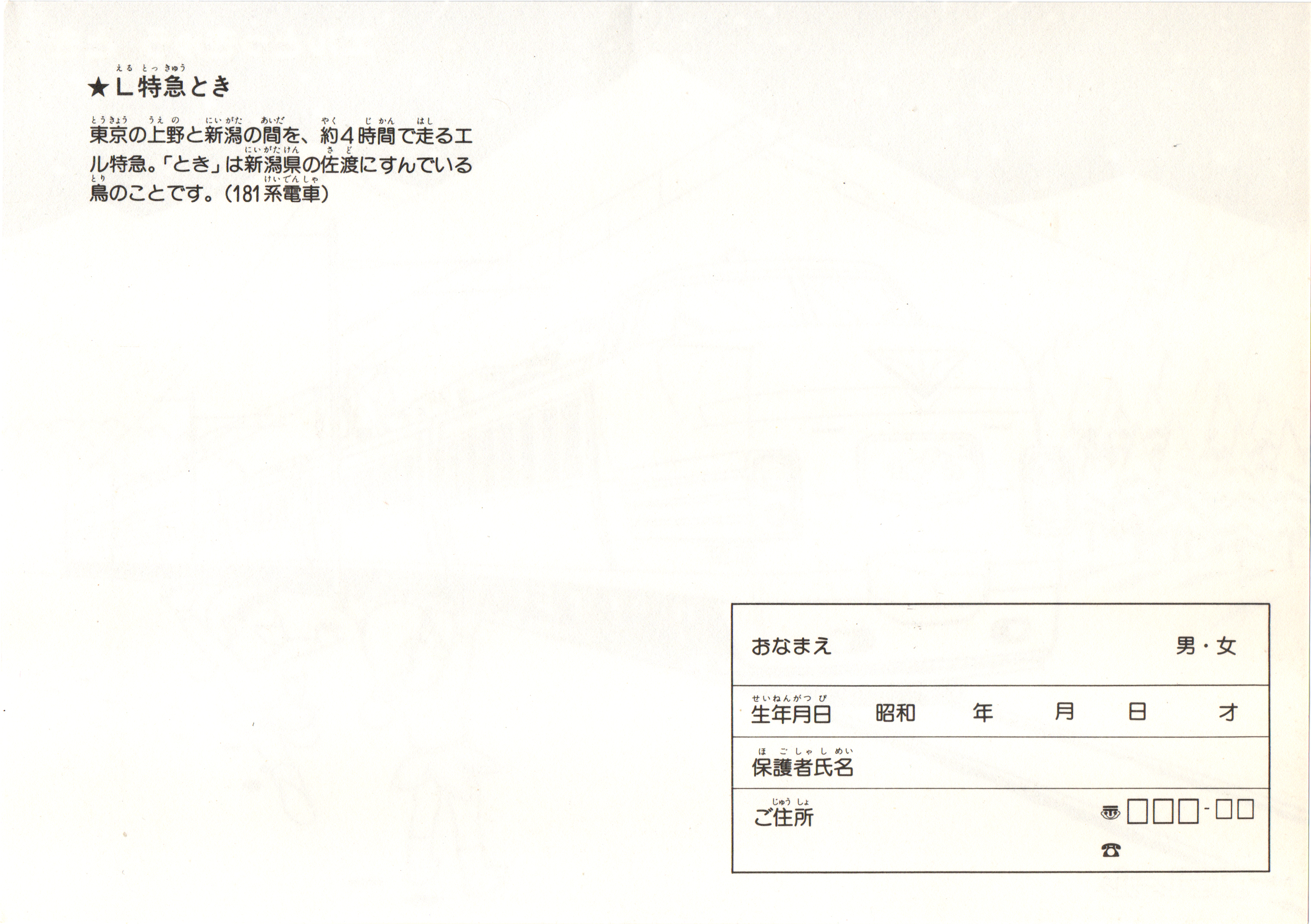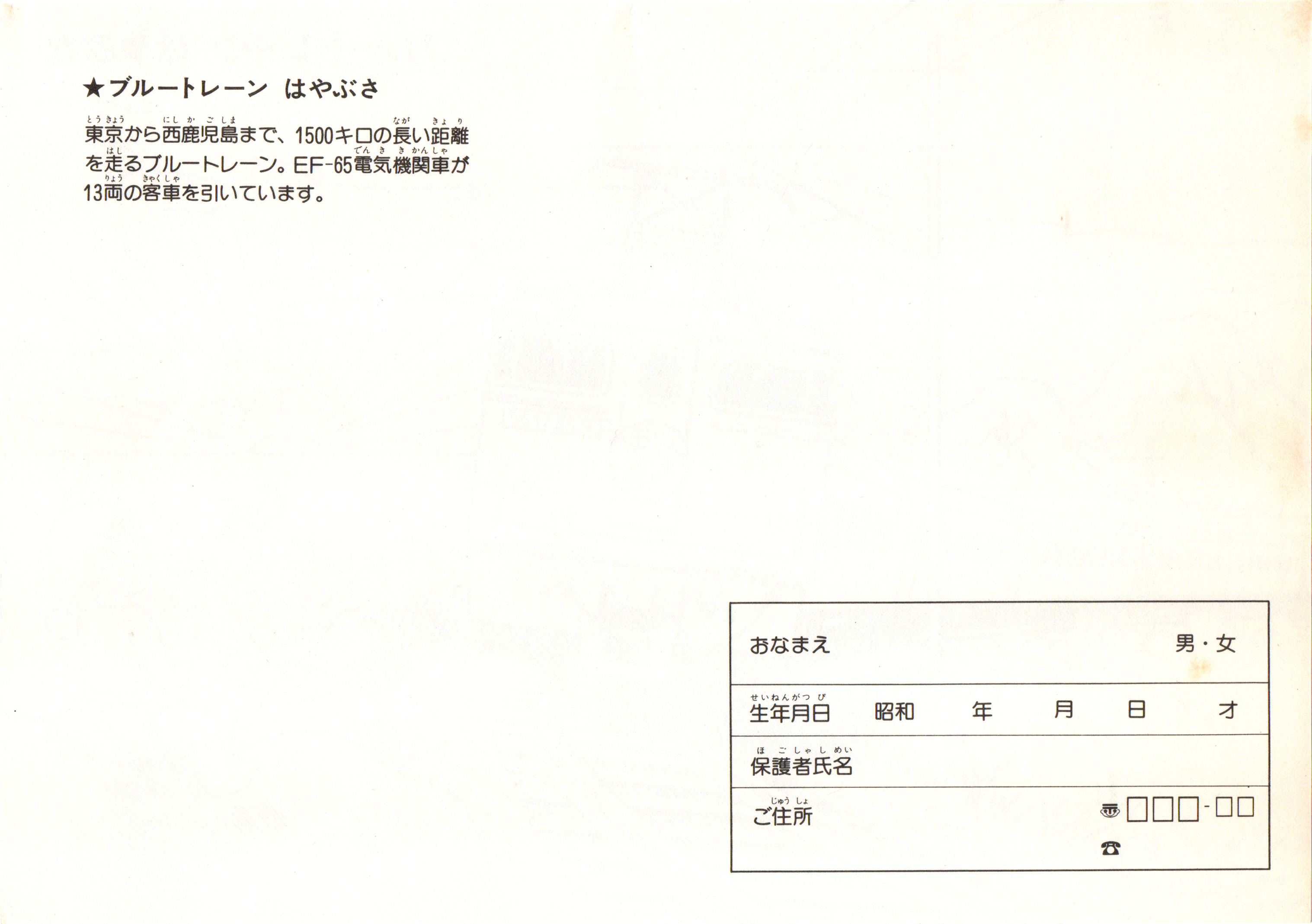 上の塗り絵と同時に配布されたと思われる下敷き。表にはブルートレイン「さくら」の写真がデカデカと載っています。ブルートレインさくら、懐かしい響きですね。東京を発着するブルートレインの一つという印象が今なお強いですが、廃止から約20年が経過し、「さくら」の愛称も九州新幹線の列車名になってから既に10年以上です。