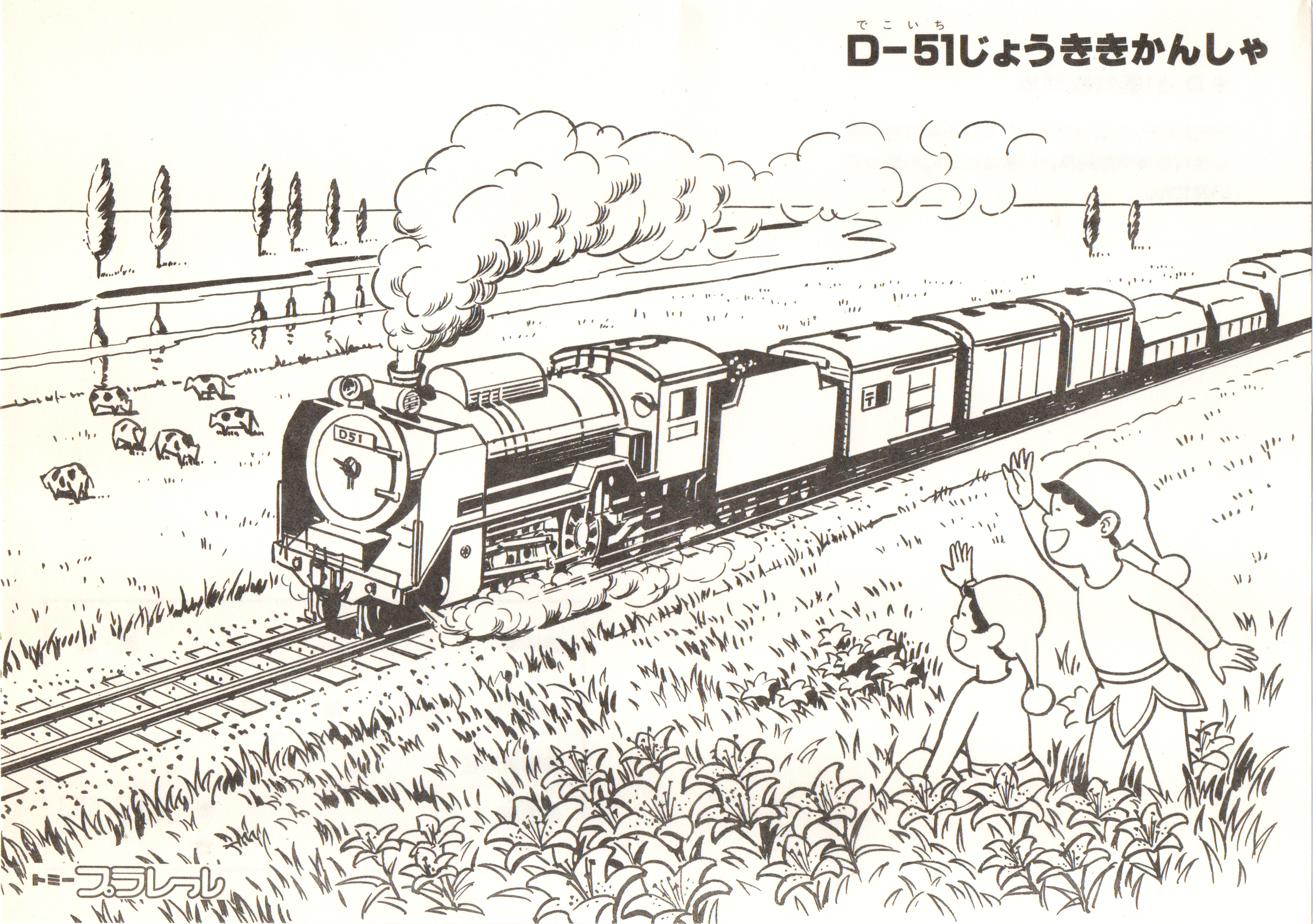 プラレール20周年を記念し、玩具店等で配布された塗り絵。ブルトレブームの頃のものですね。どれも過去の車両...のはずですが、EF65もD51もなんだかんだで走ってますね。