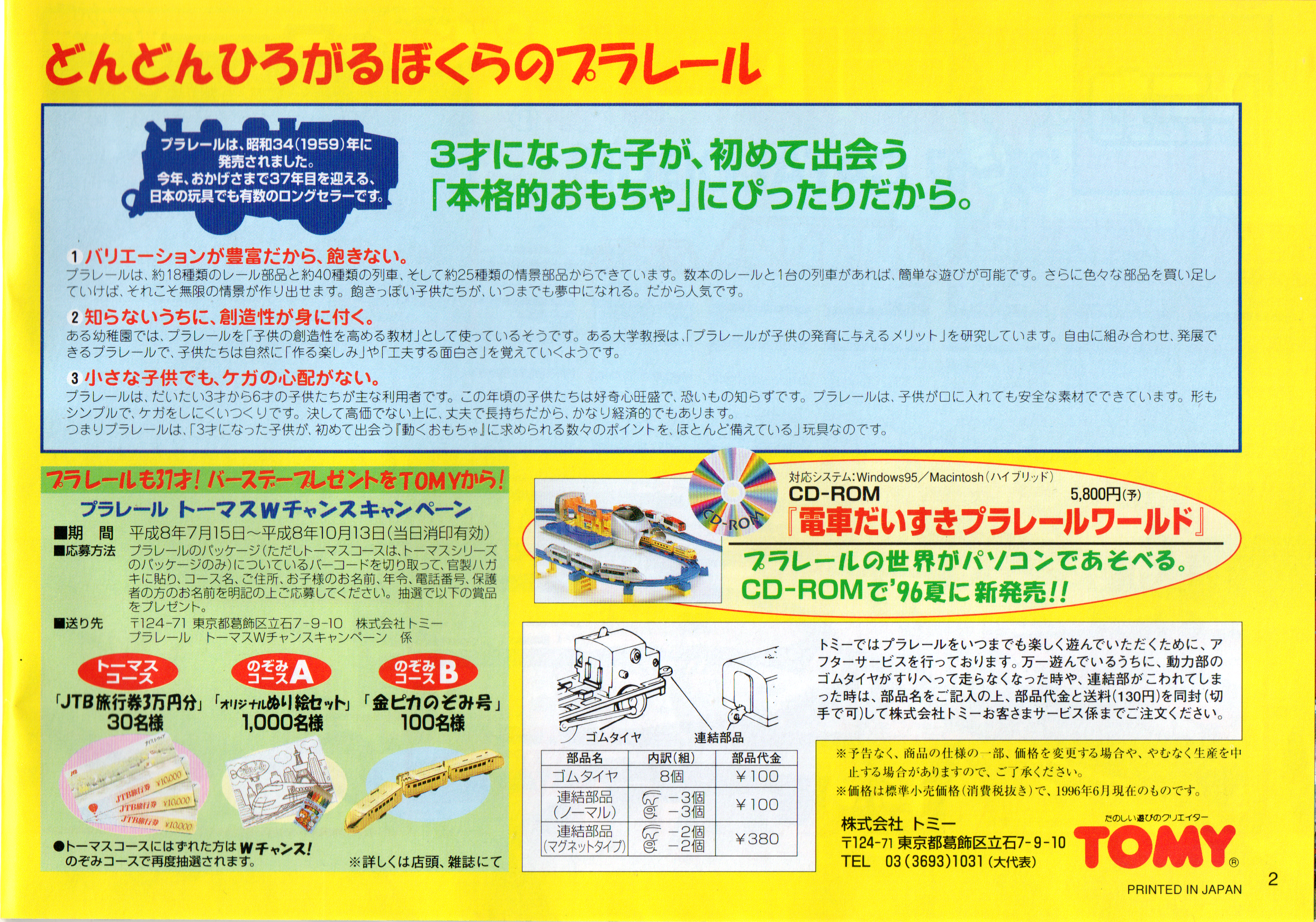 1996年版のカタログです。トミカと合同のカタログとなっています。大型情景「ビッグつばさ号」、車両単品「ゆふいんの森」などが新製品として紹介されています。