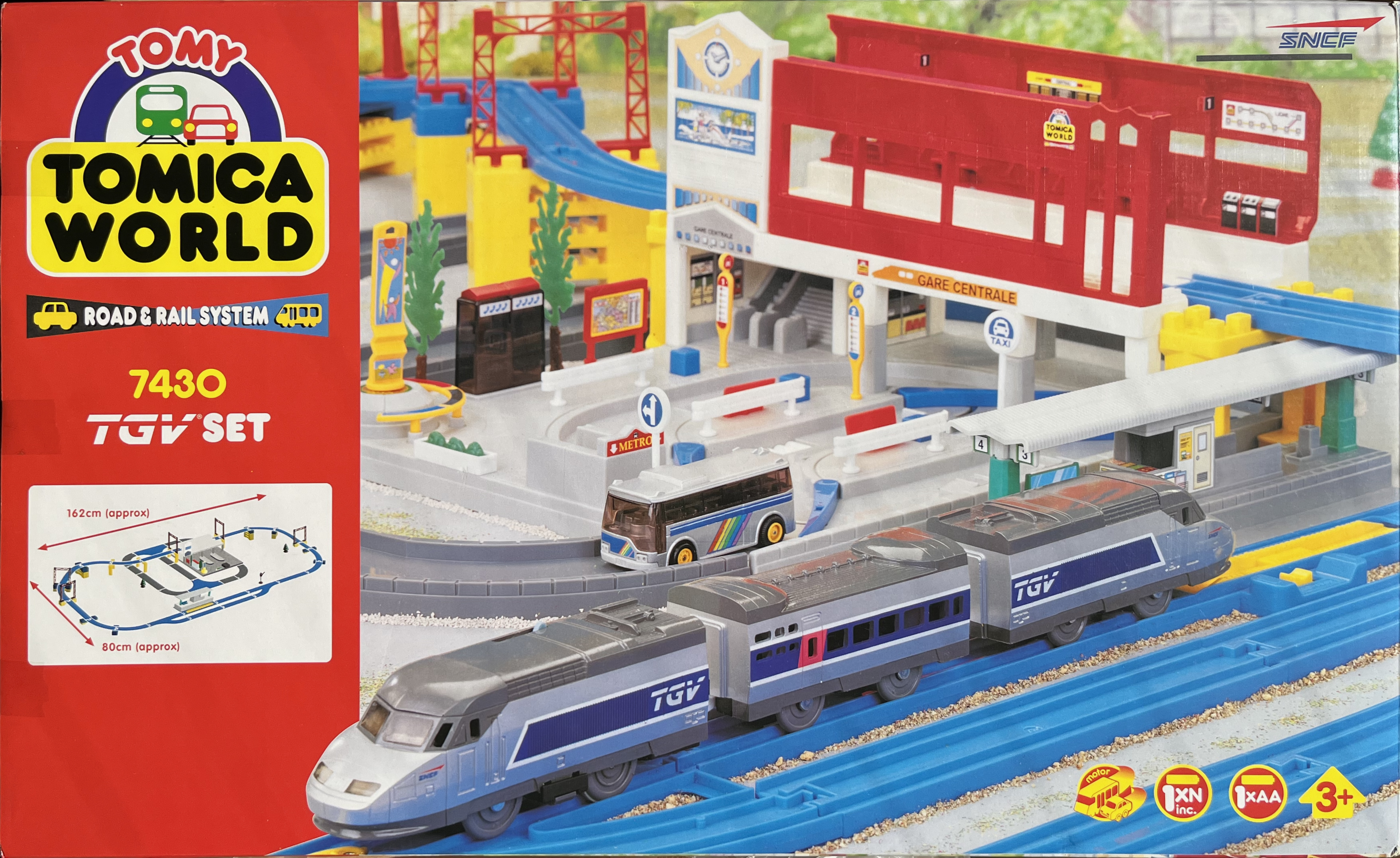 俗に言う「銀TGV」のセット。TOMICA WORLD仕様のニュータウン駅「GARE CENTRALE(中央駅)」が特徴的です。単純なエンドレスにせず、少し膨らんだ区間を設けているのがポイント。地上部分には「街の駅」が置かれ、通過線をイメージしたのか、単線・複線ポイントレールを使って駅部だけ複線にしてあります。