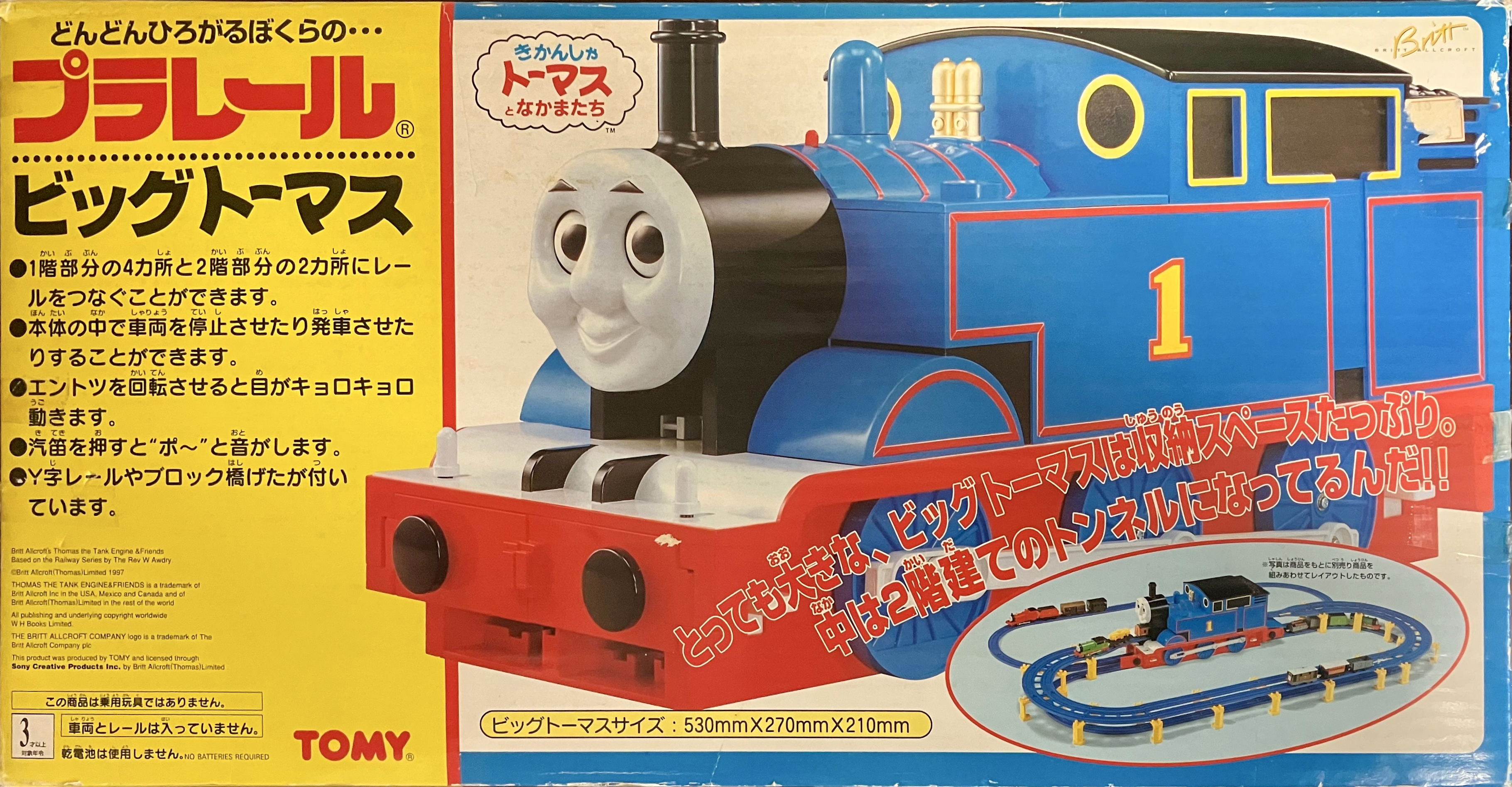側面タンク上部とキャブの屋根は開けられるようになっており、内部に車両を16両分収納できるスペースがあります。拡張セットとして「ビッグトーマス対応レールセット」が同時に発売されています。(