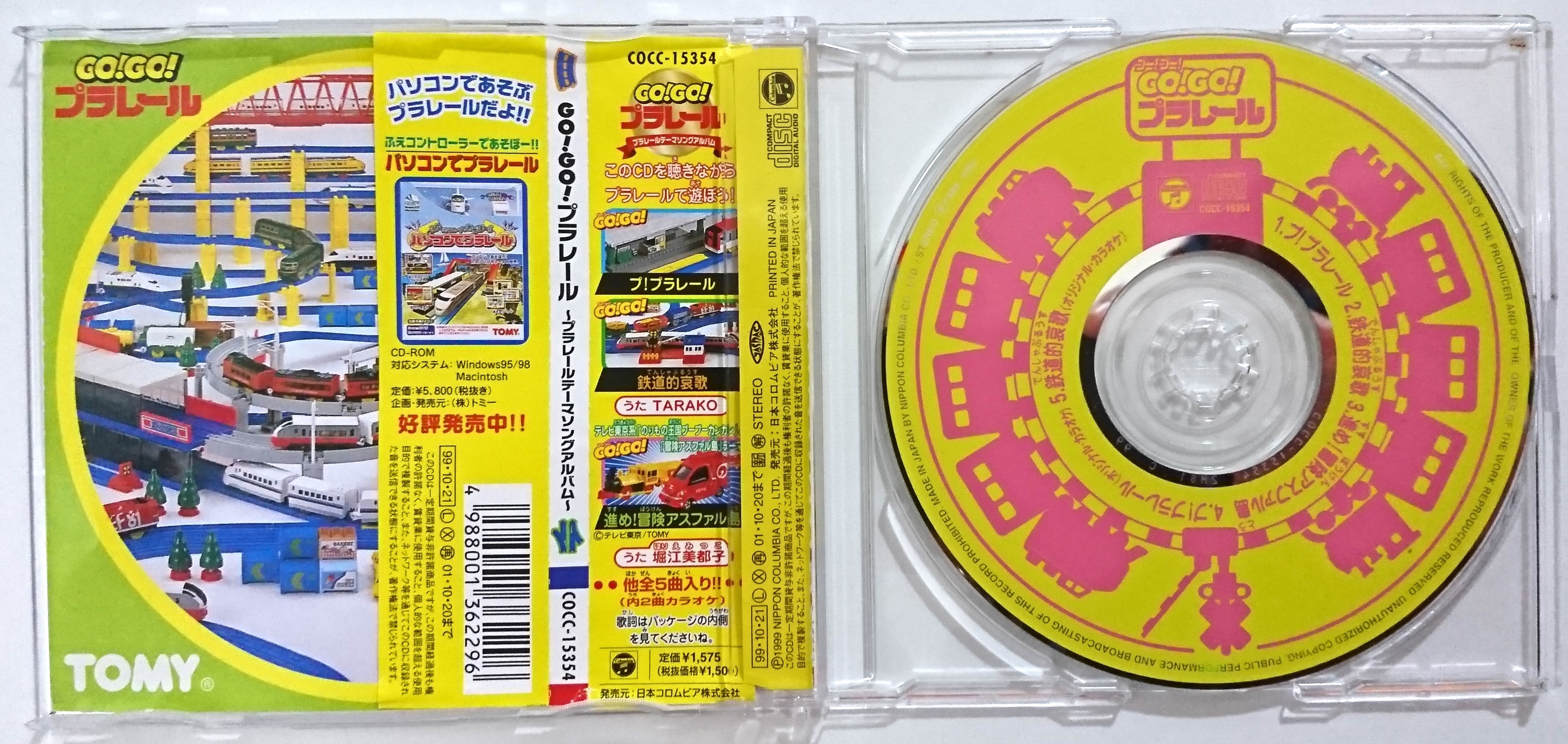 「プラレールテーマソングアルバム」と称されるCD。TARAKO歌唱の「プ!プラレール」「鉄道的哀歌(でんしゃぶうるす)」のボーカル版・カラオケ版と、堀江美都子歌唱の「進め!冒険アスファル島」の5曲が収録されています。しかし「鉄道的哀歌(でんしゃぶうるす)」とは、子供向けにしては渋すぎるタイトルですね。ジャケットの「対象年令0歳以上」というのもそれはそうだろうという感じで面白いです。