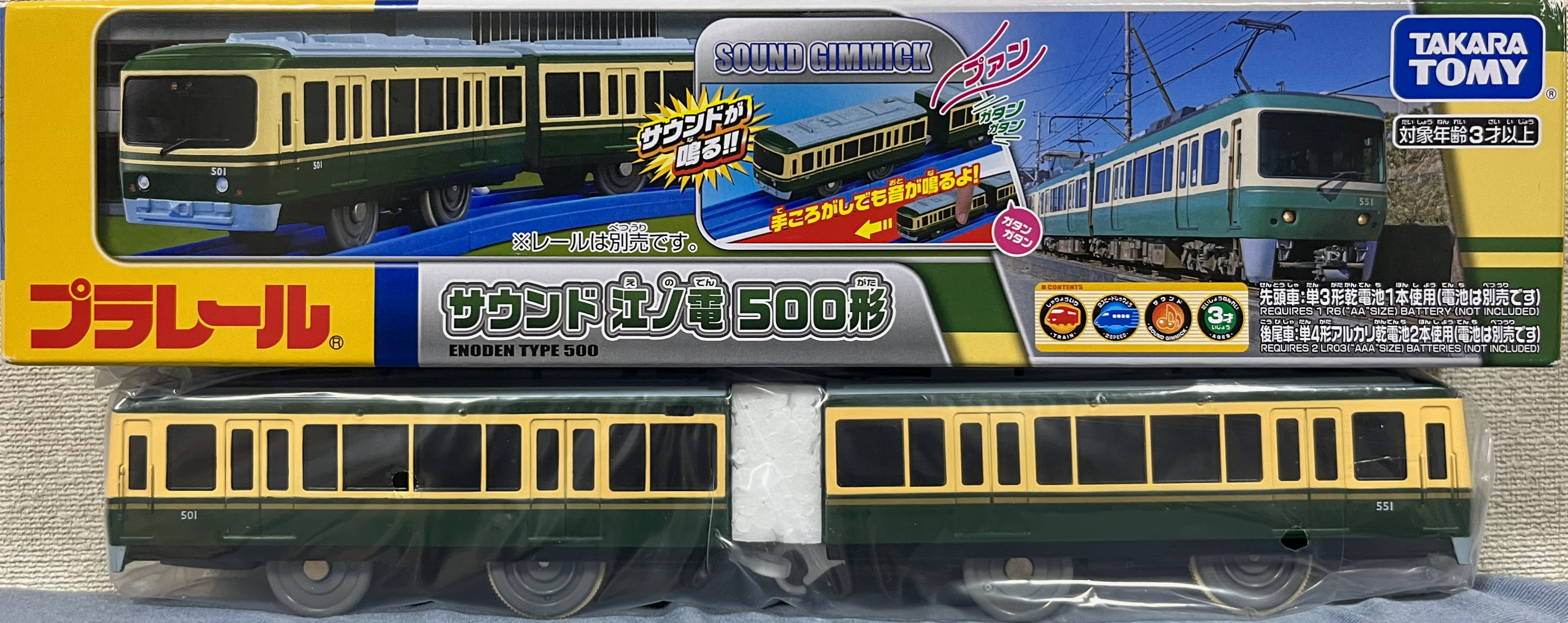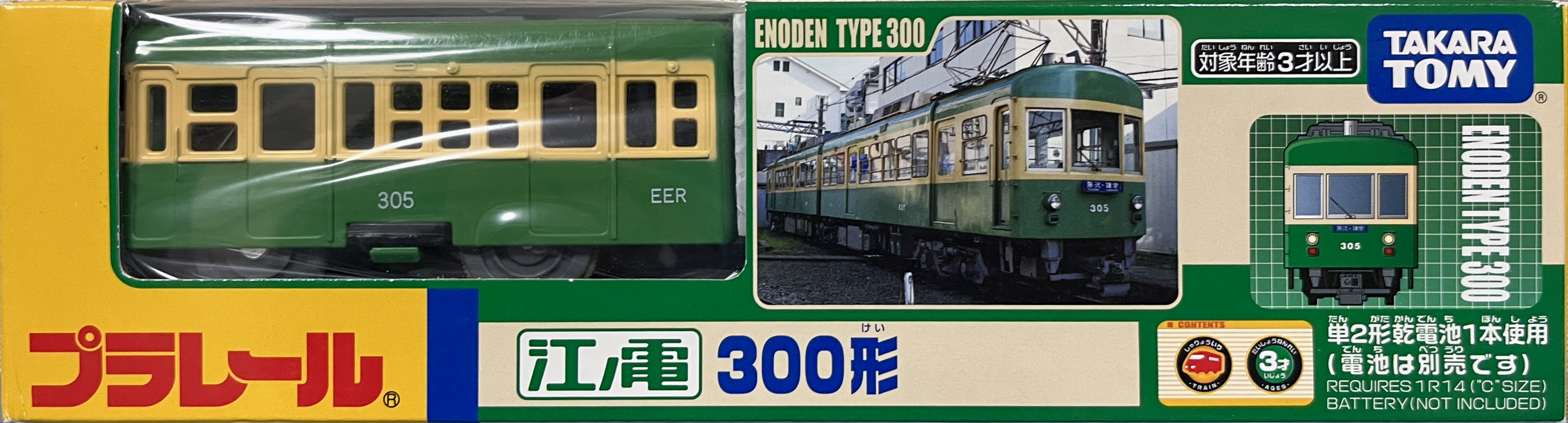 江ノ電も1999年にプラレールの限定発売に参入。「ちんちんでんしゃ」の塗り替えでしたが人気が高かったらしく、翌2000年に屋根を塗装を施し車輪をグレーに変えたグレードアップ品として再販されました。「えのでん」は無窓箱ですが、箱の色の濃淡でいつの製品か判断できます。濃い緑が1999年版、薄い緑が2000年版です。