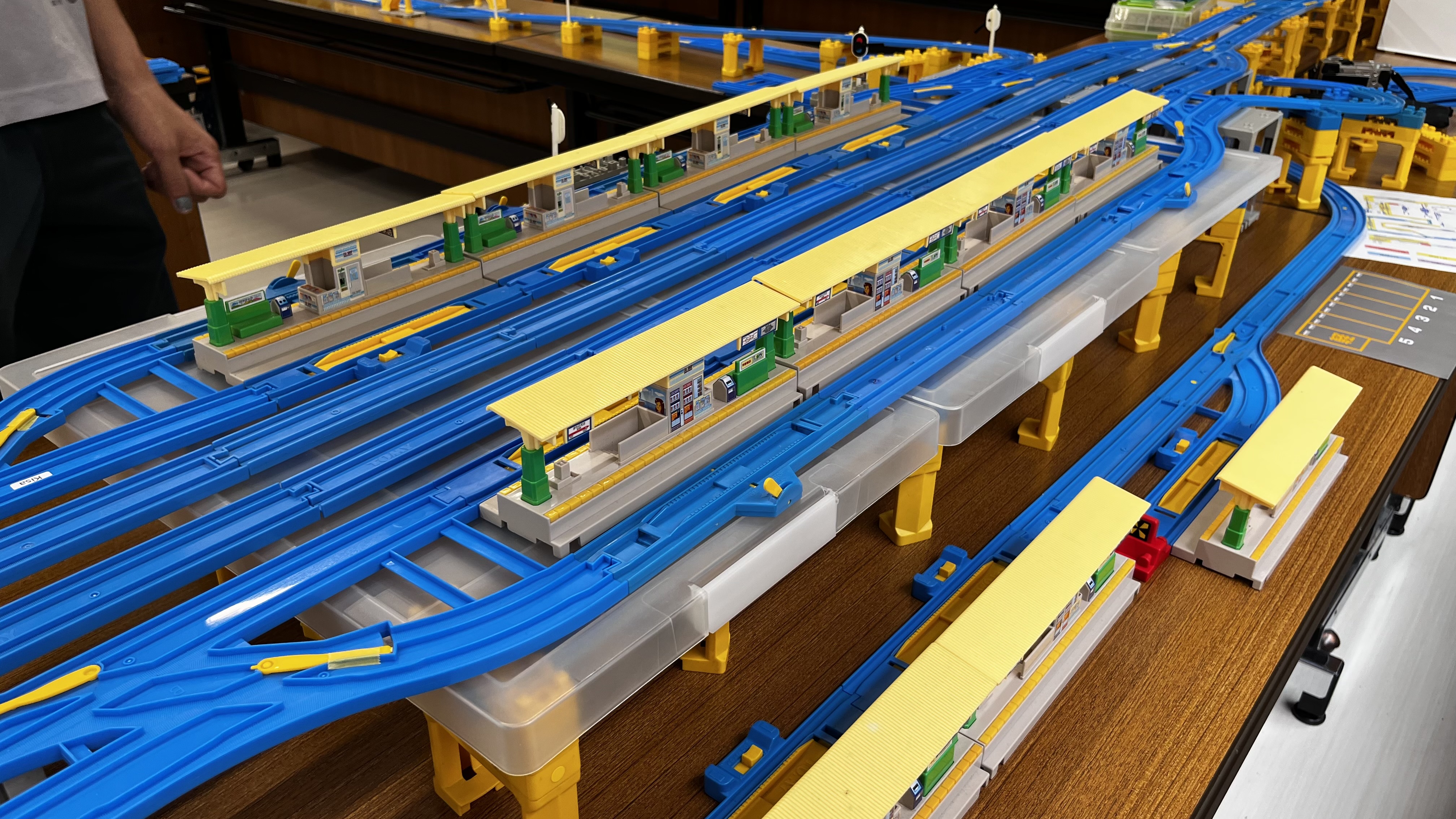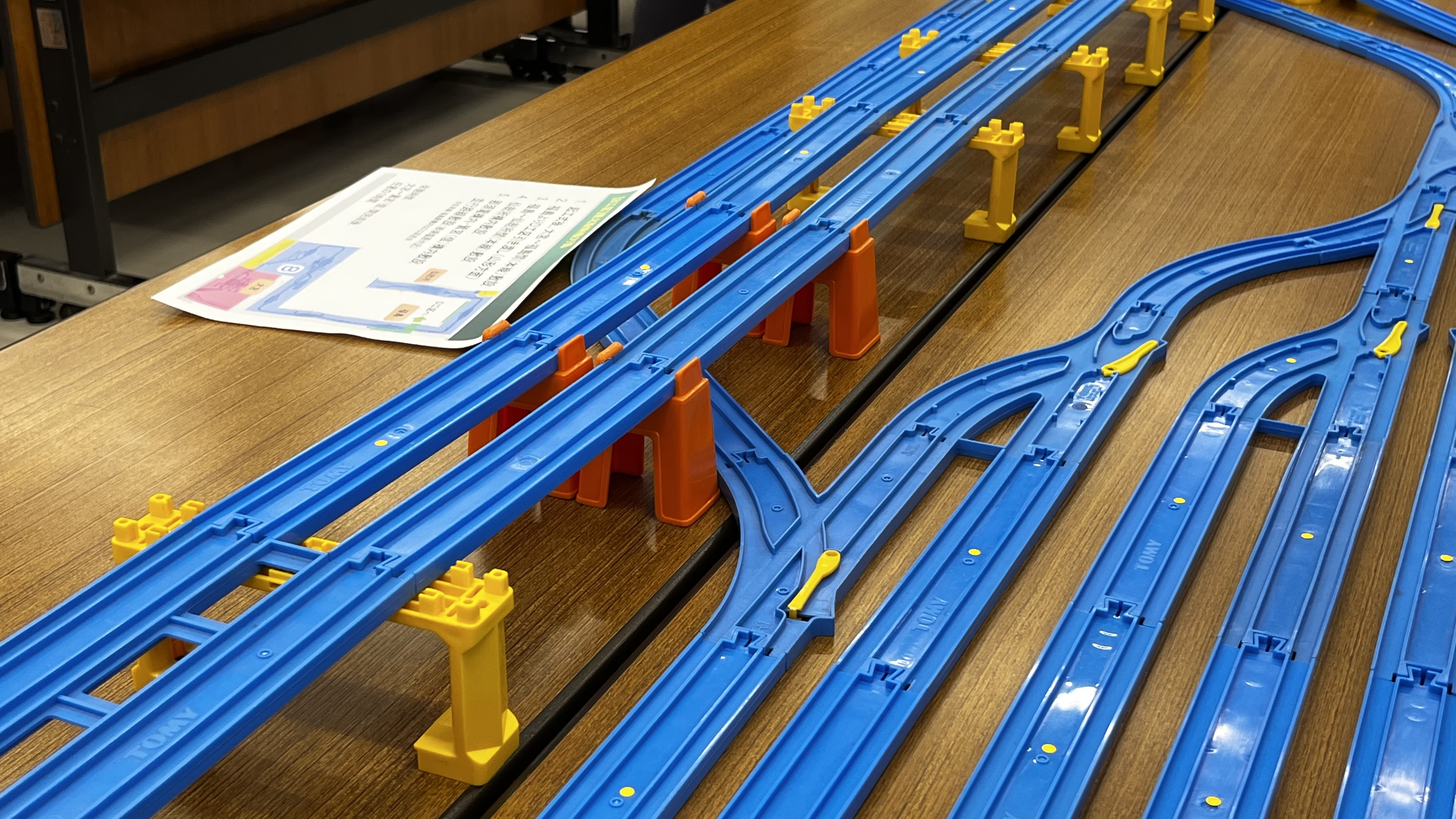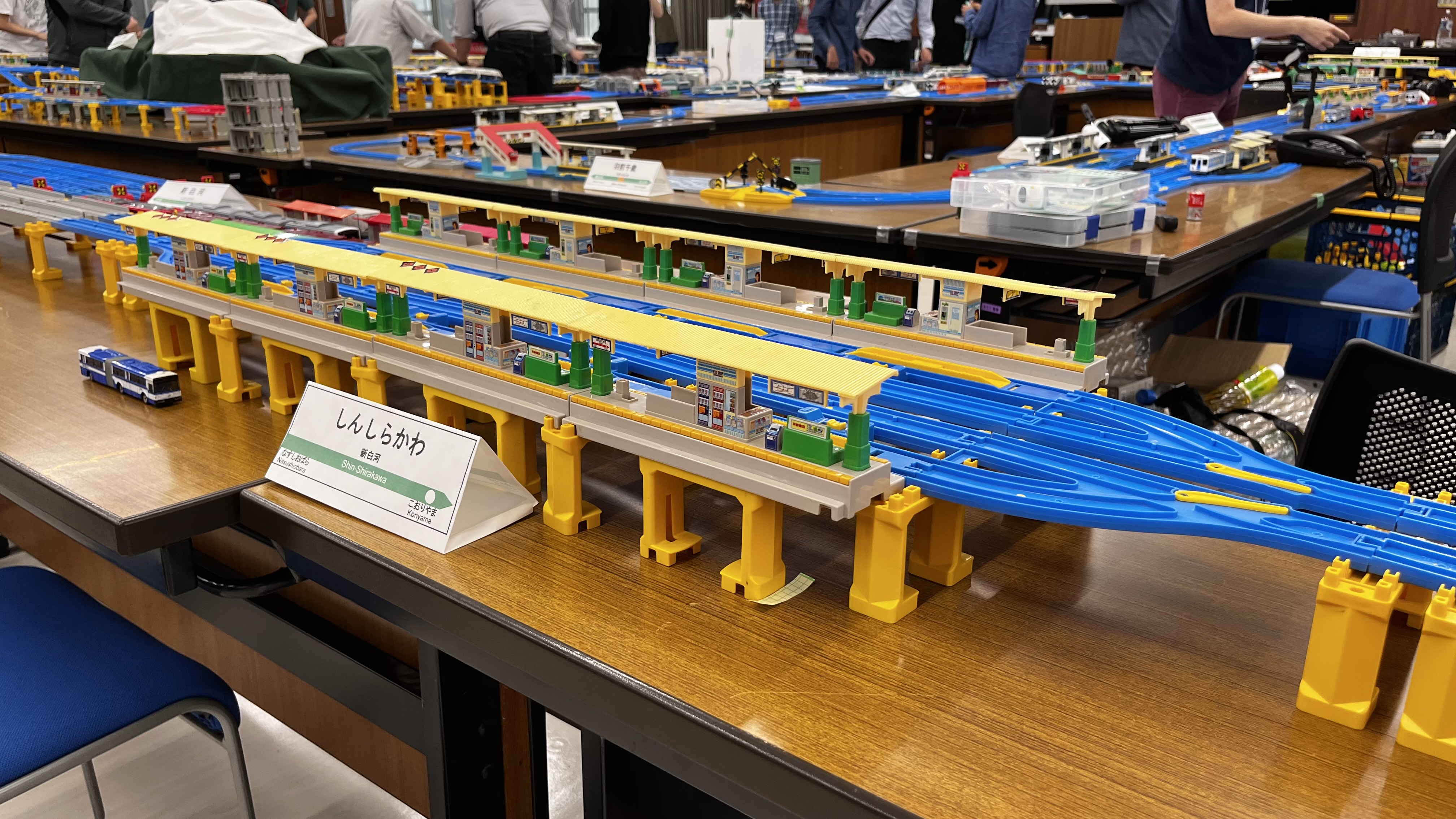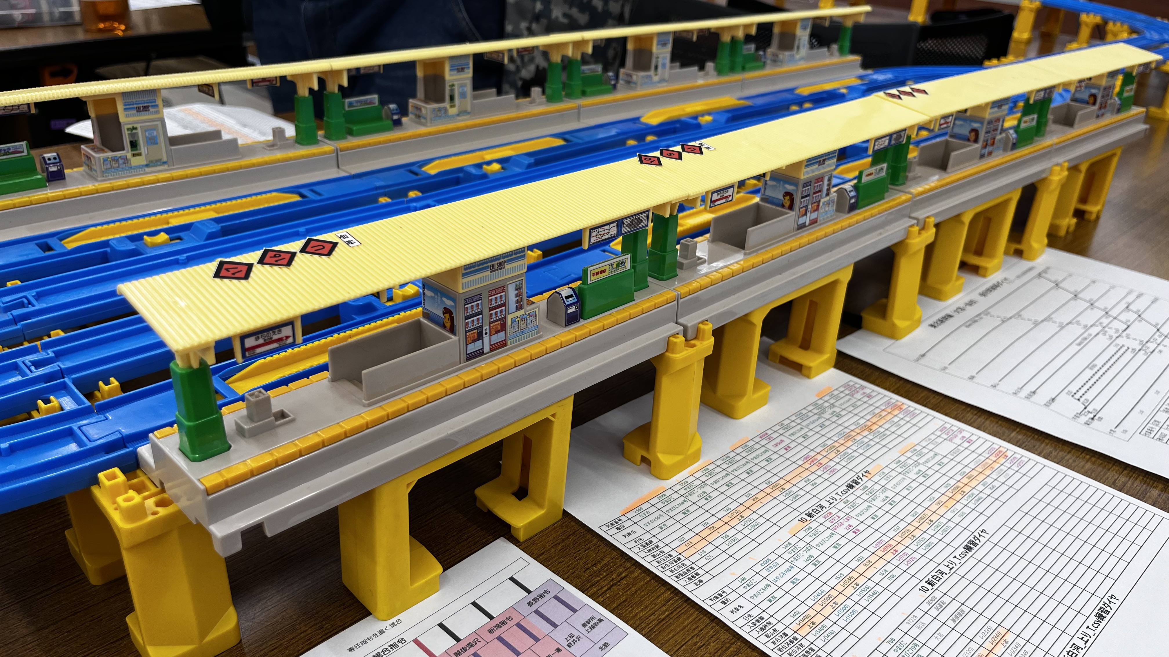 ぶっつけ本番というわけにも行かないので、まずは練習ダイヤなるもので流れを把握。参加者全員が全員プラレールのスペシャリストというわけではないので、駅やポイントの操作もこの練習時に慣れておく必要があります。