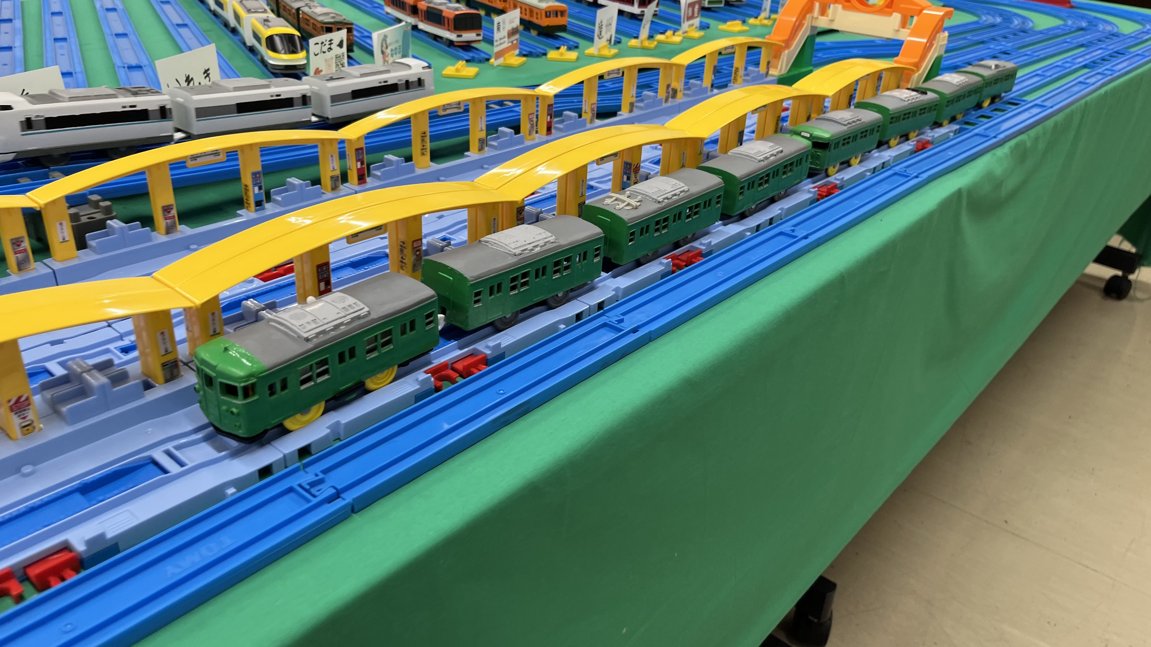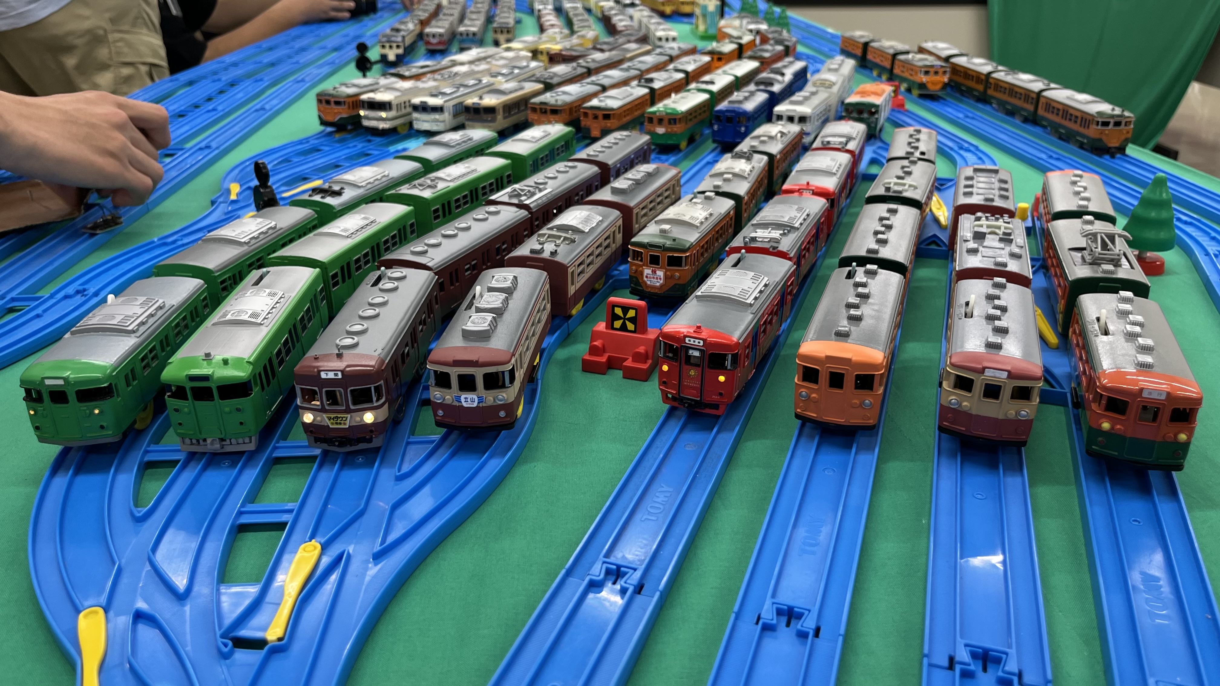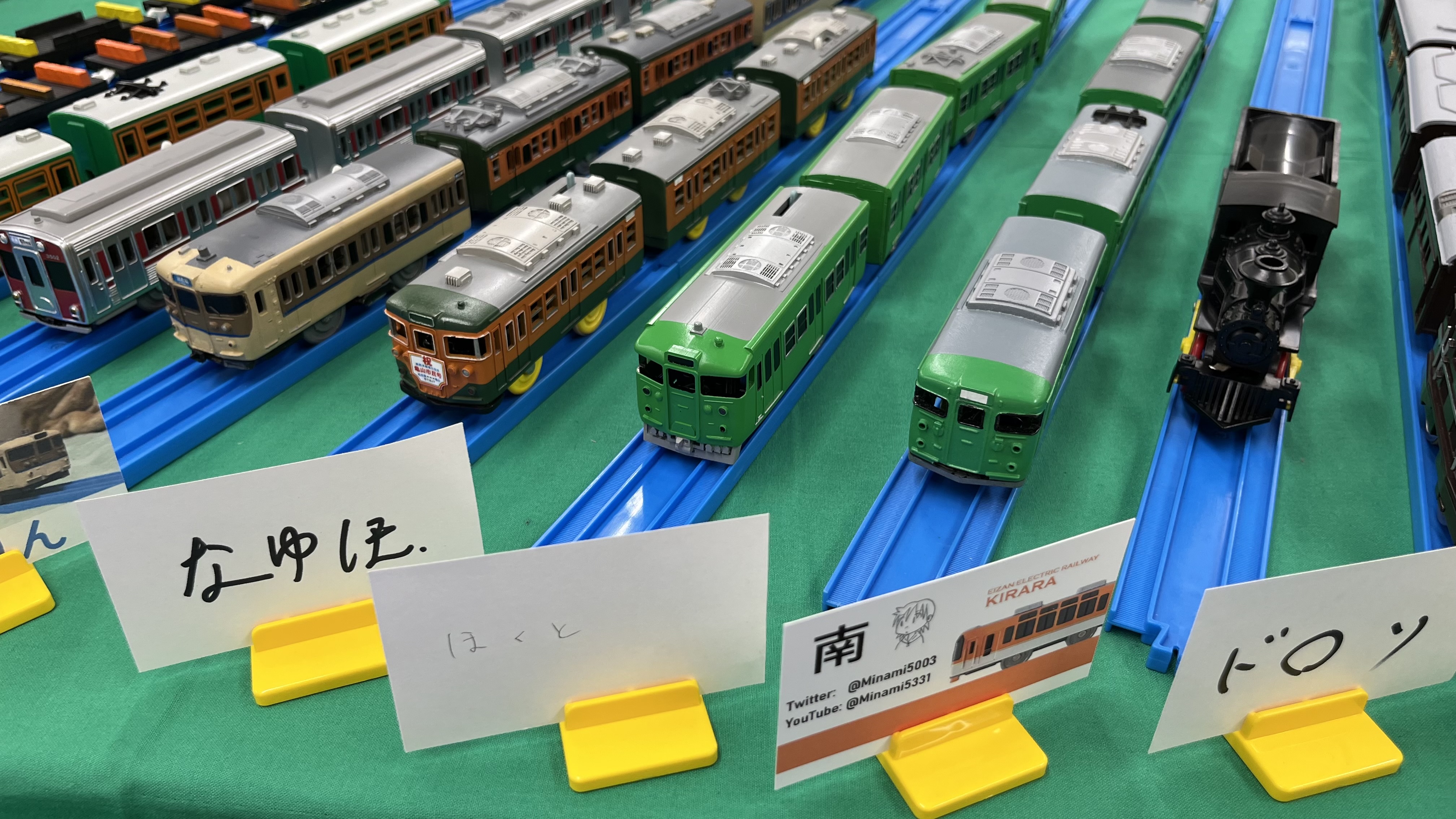お昼頃になると展示スペースがご自慢の車両たちで埋まっていきます。館長は頂いたガレージキットから作った113系「亀山市民号」を展示。体質改善113系に挟まれて肩身の狭い国鉄仕様です。ドボンさんは「僕は改造しない人だからさ」と弁慶号を展示。