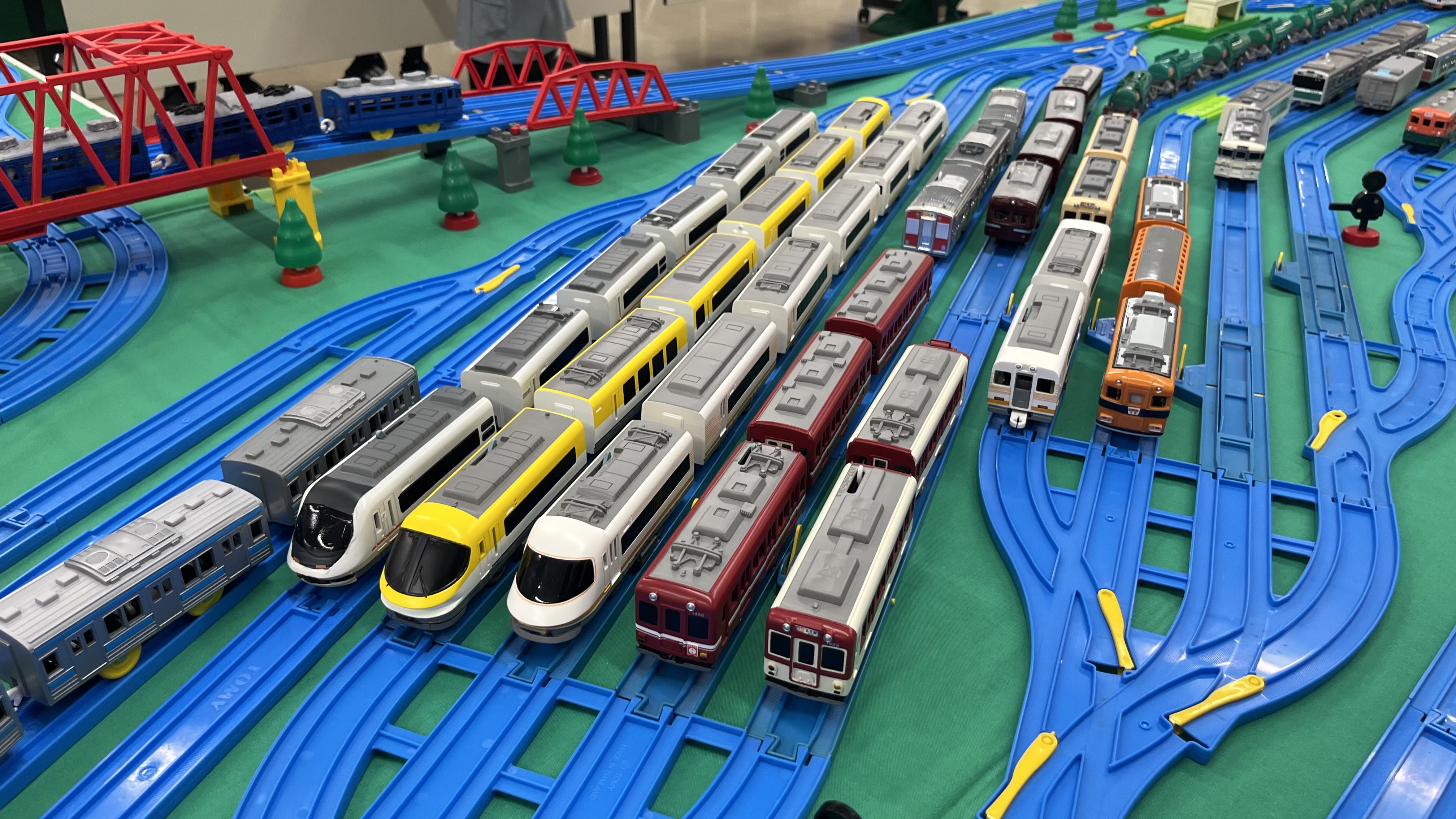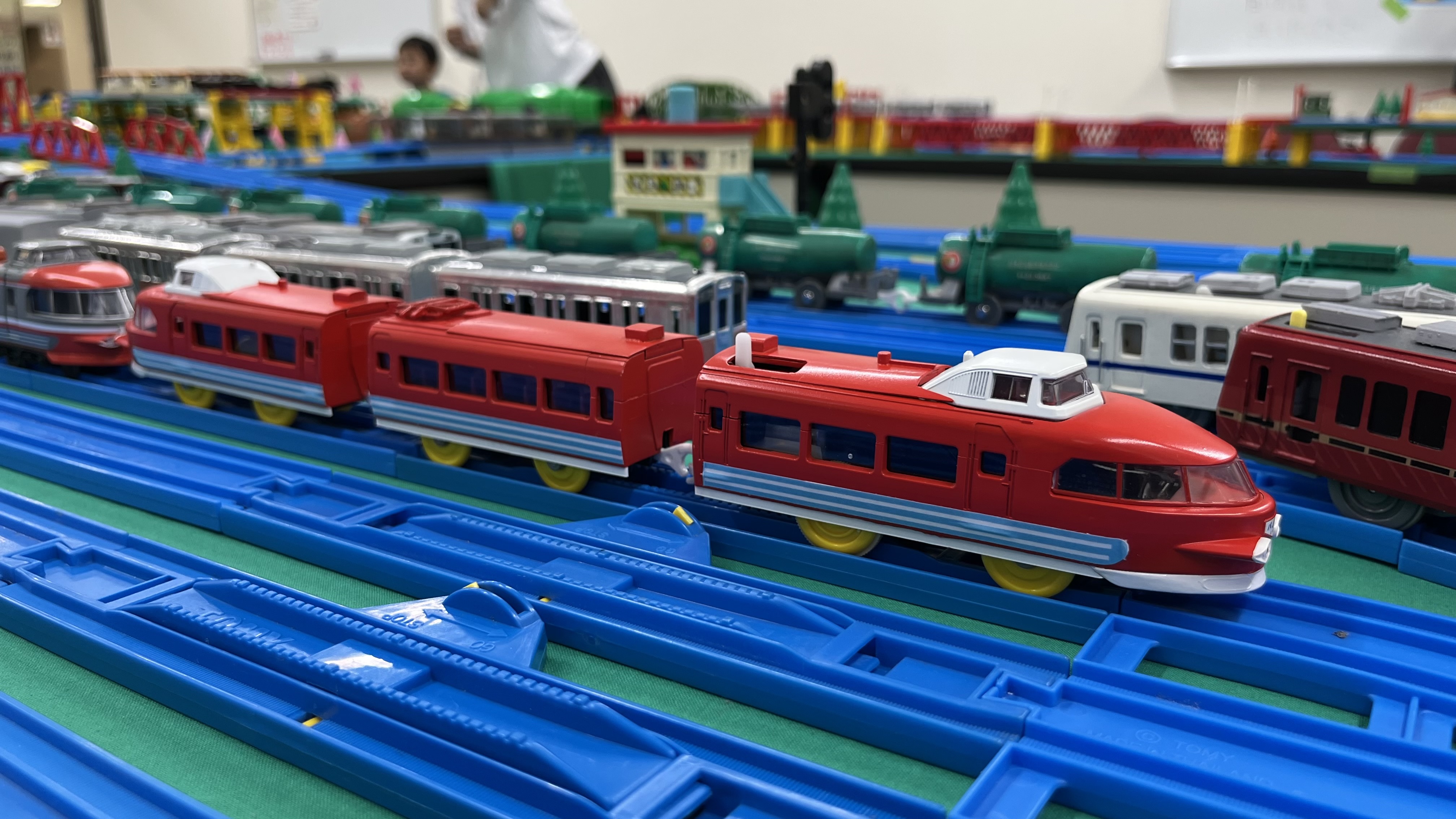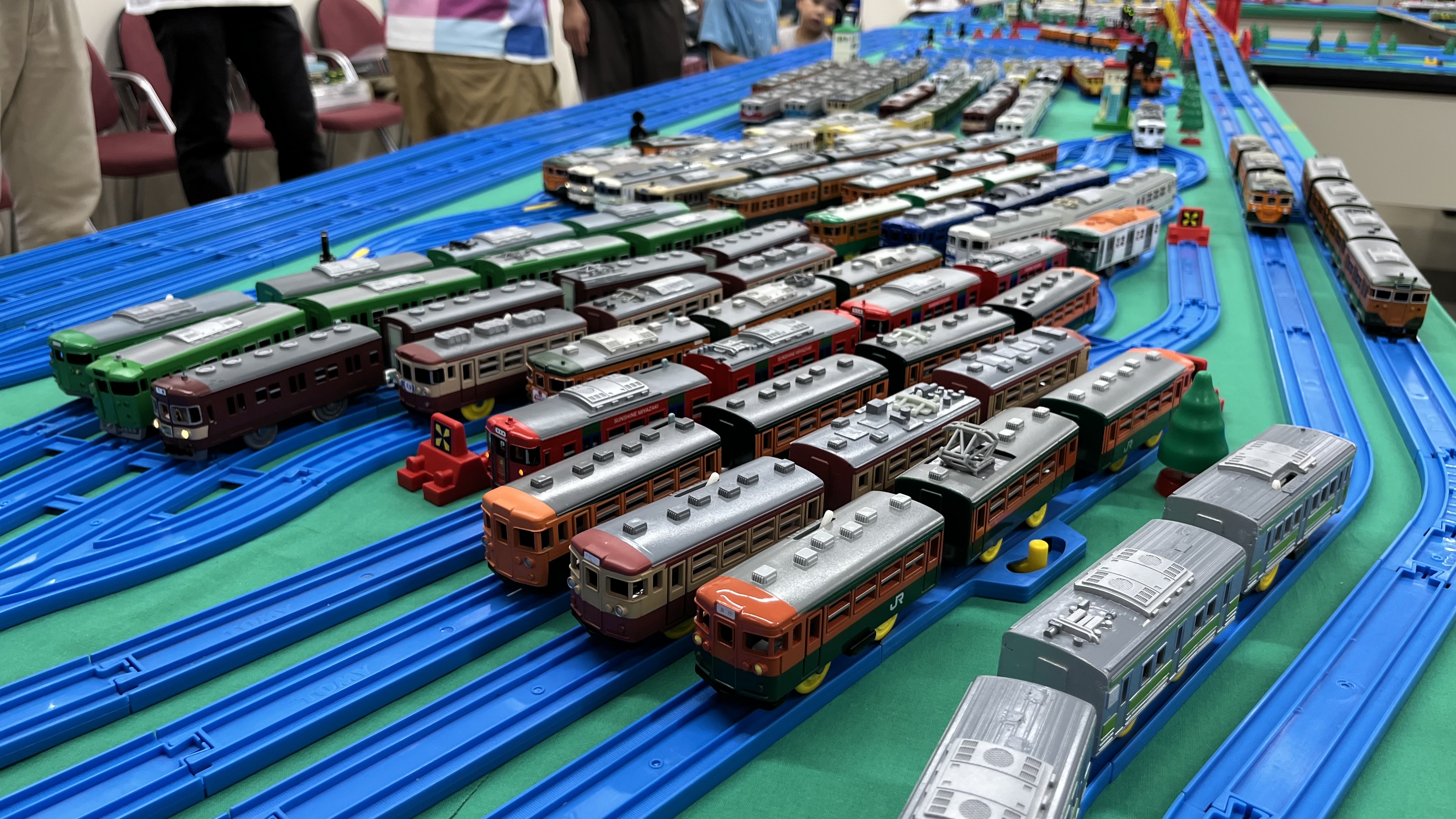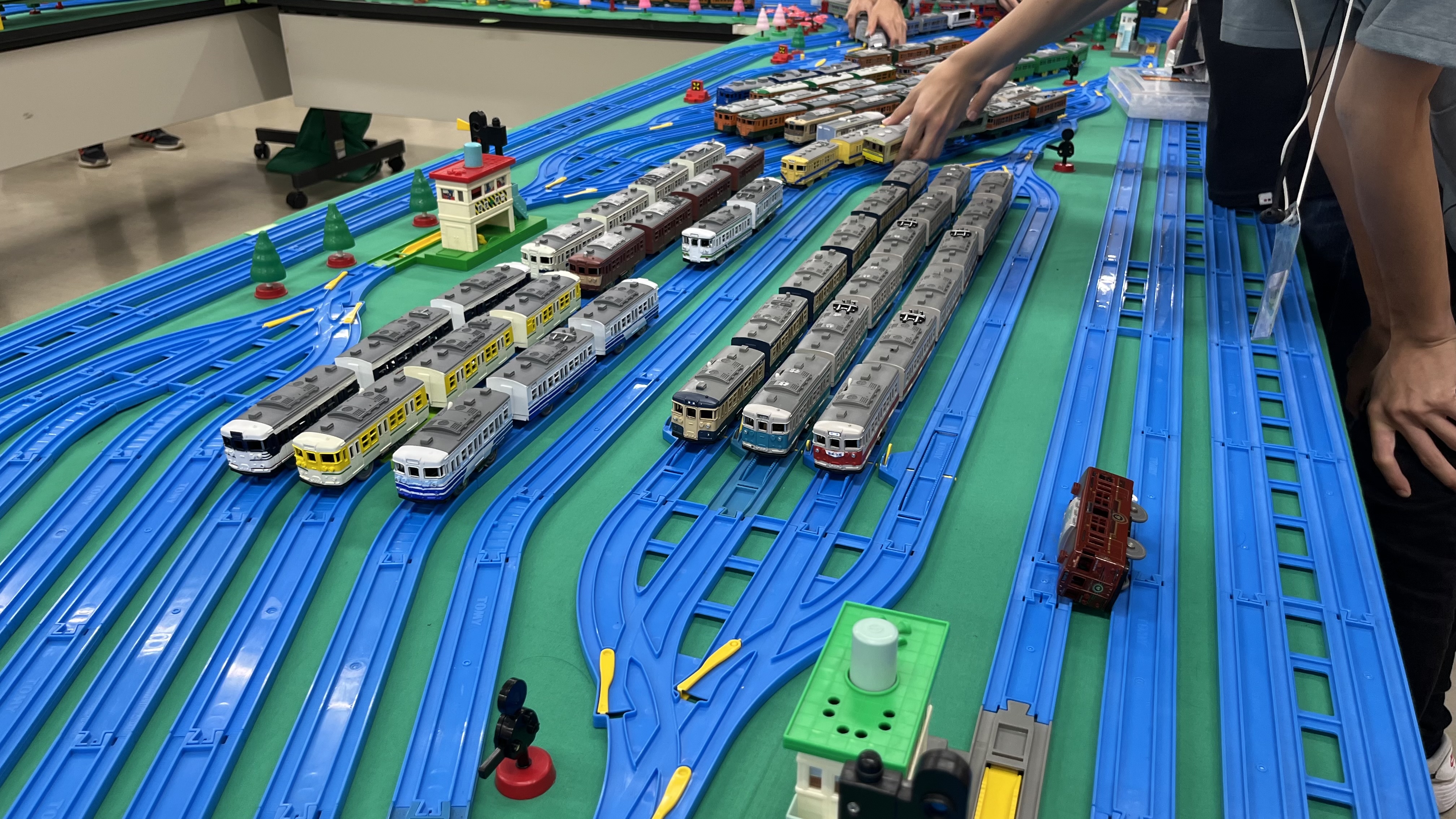 お昼頃になると展示スペースがご自慢の車両たちで埋まっていきます。館長は頂いたガレージキットから作った113系「亀山市民号」を展示。体質改善113系に挟まれて肩身の狭い国鉄仕様です。ドボンさんは「僕は改造しない人だからさ」と弁慶号を展示。