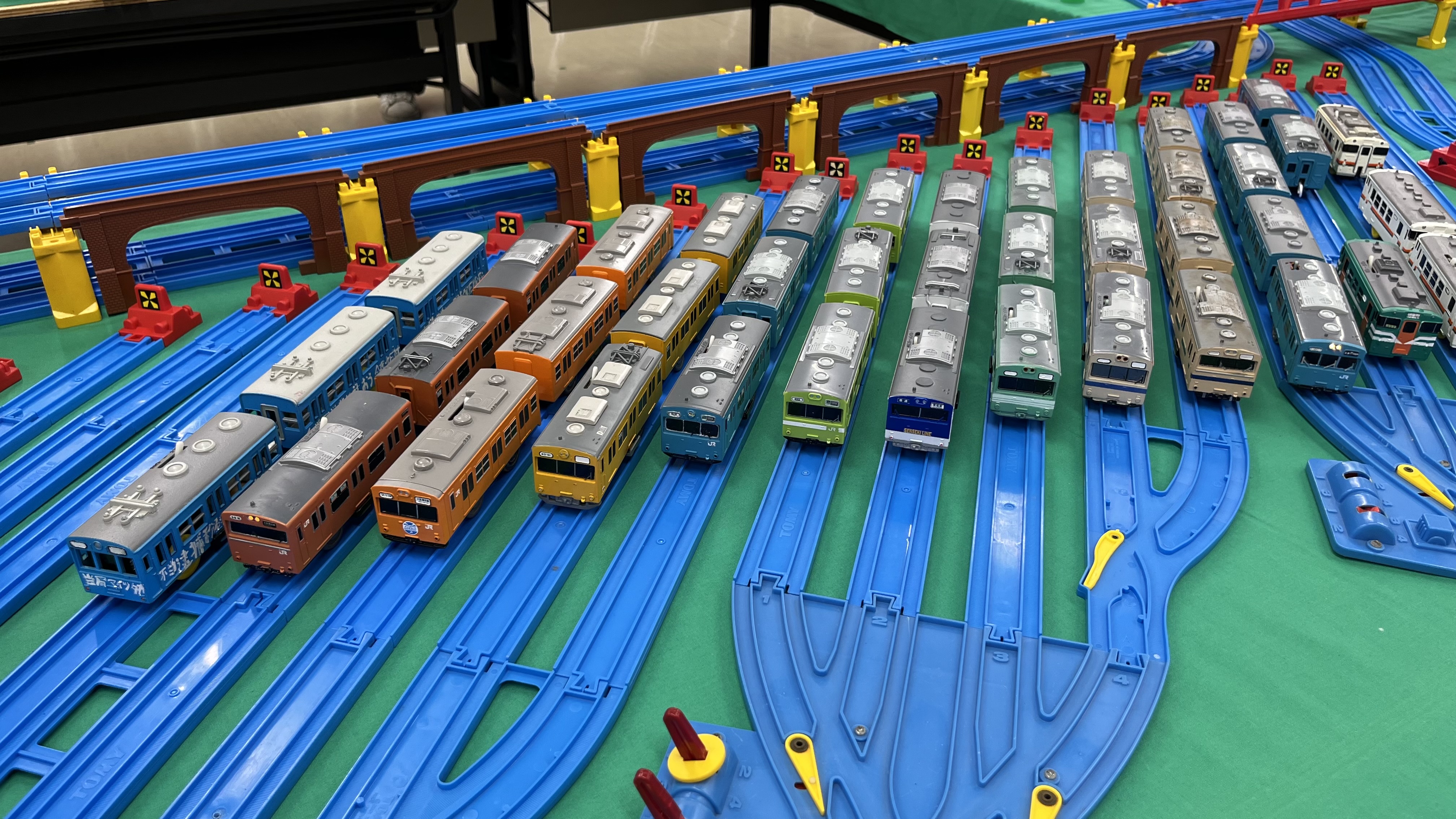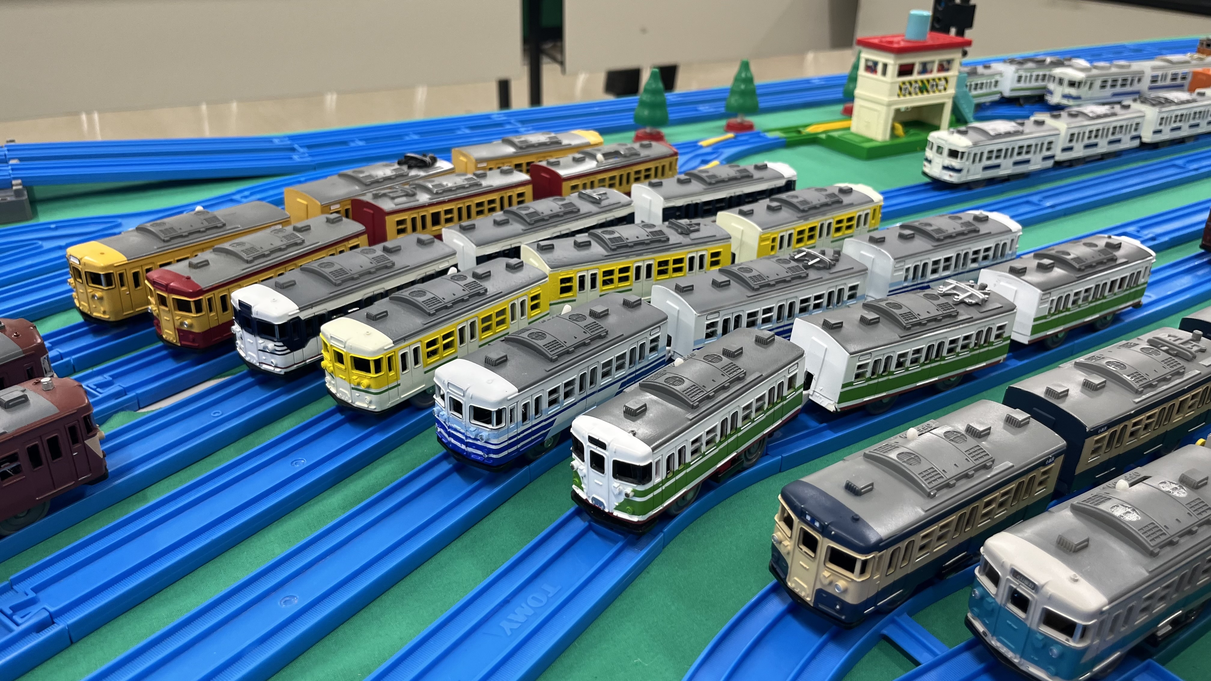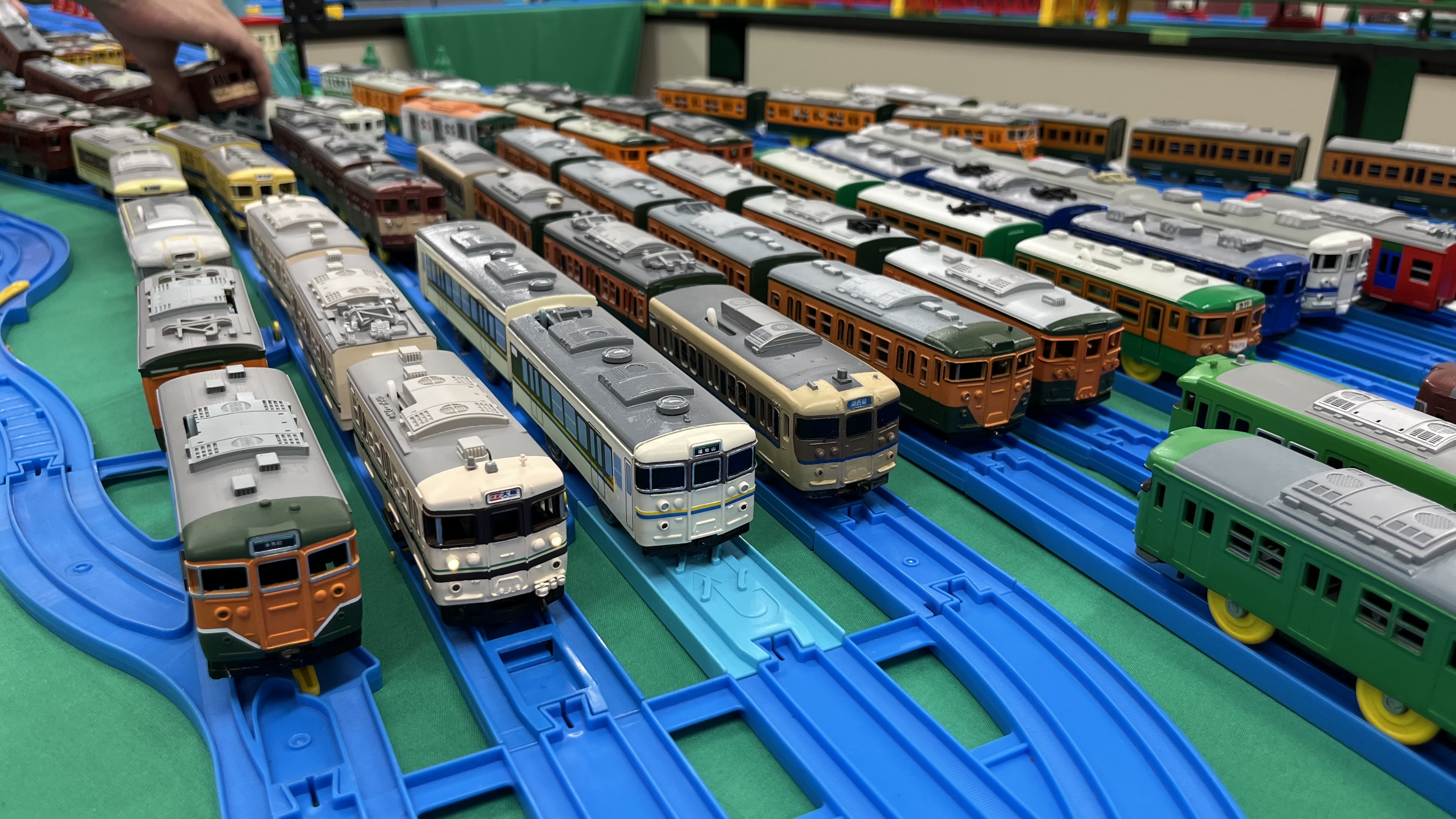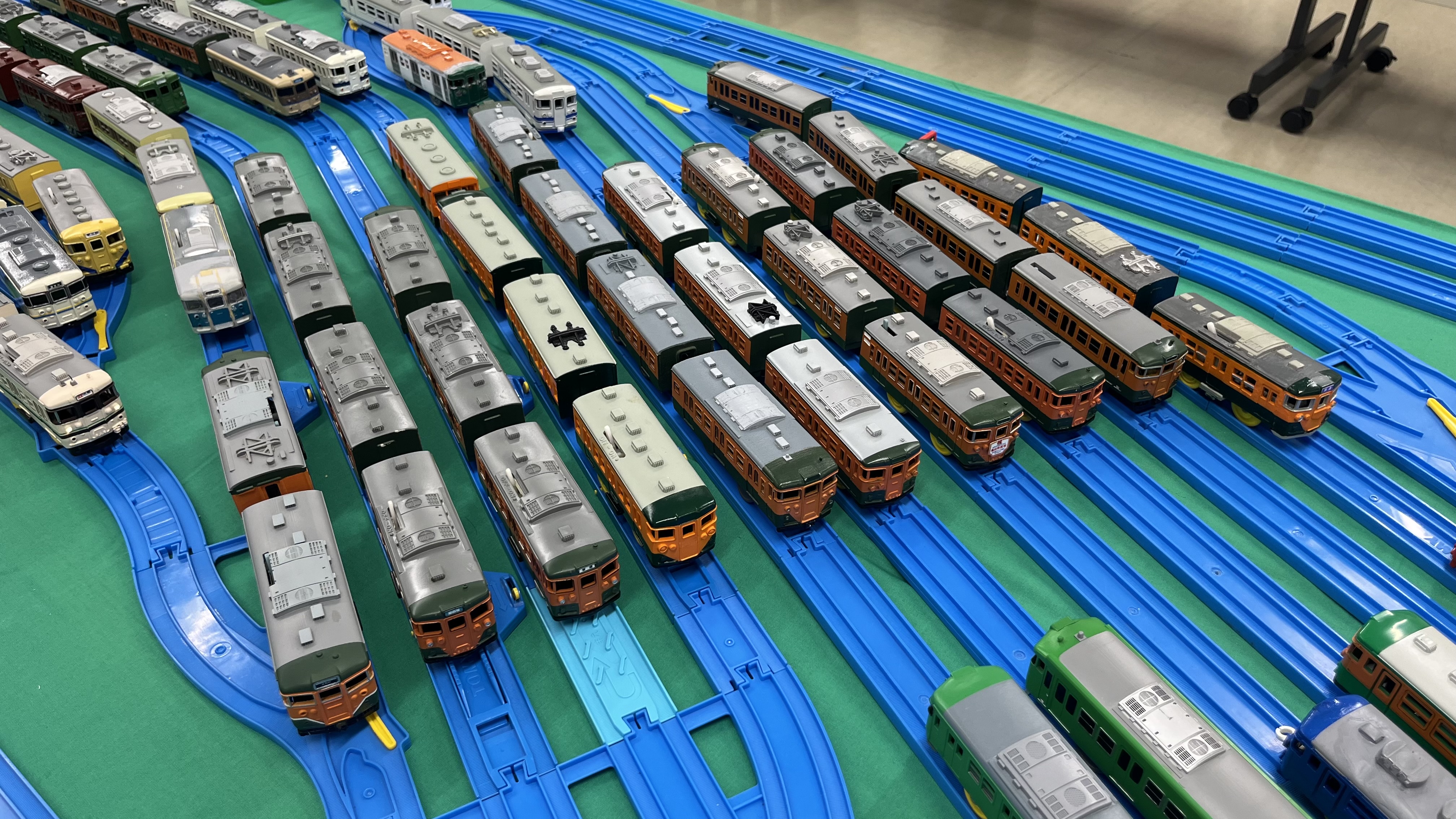 お馴染みの東海型急行電車165系から、451系、153系、717系、113系、455系、401系など、同じ顔でも色が違う車両がズラッと並ぶ様子は圧巻です。