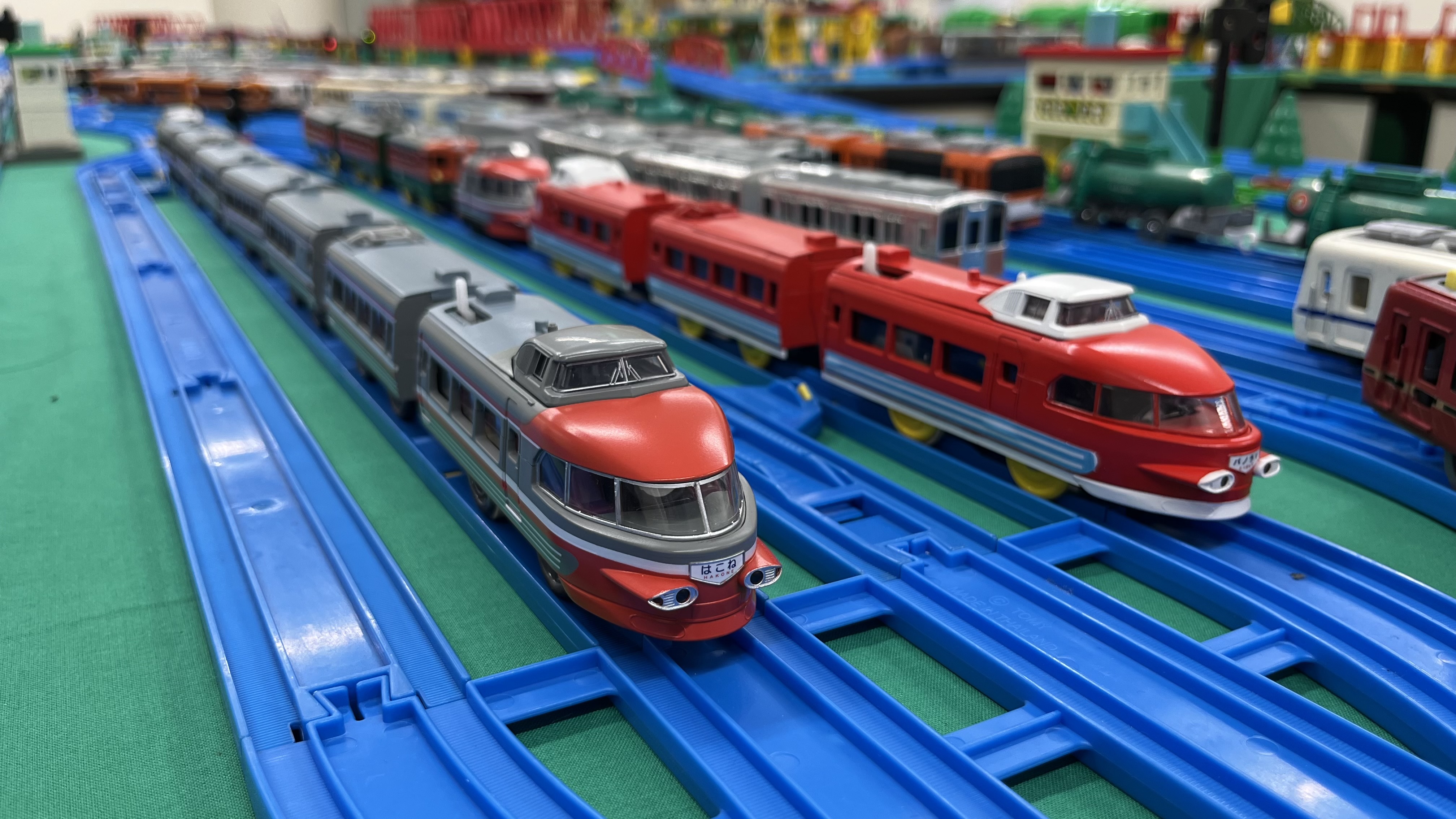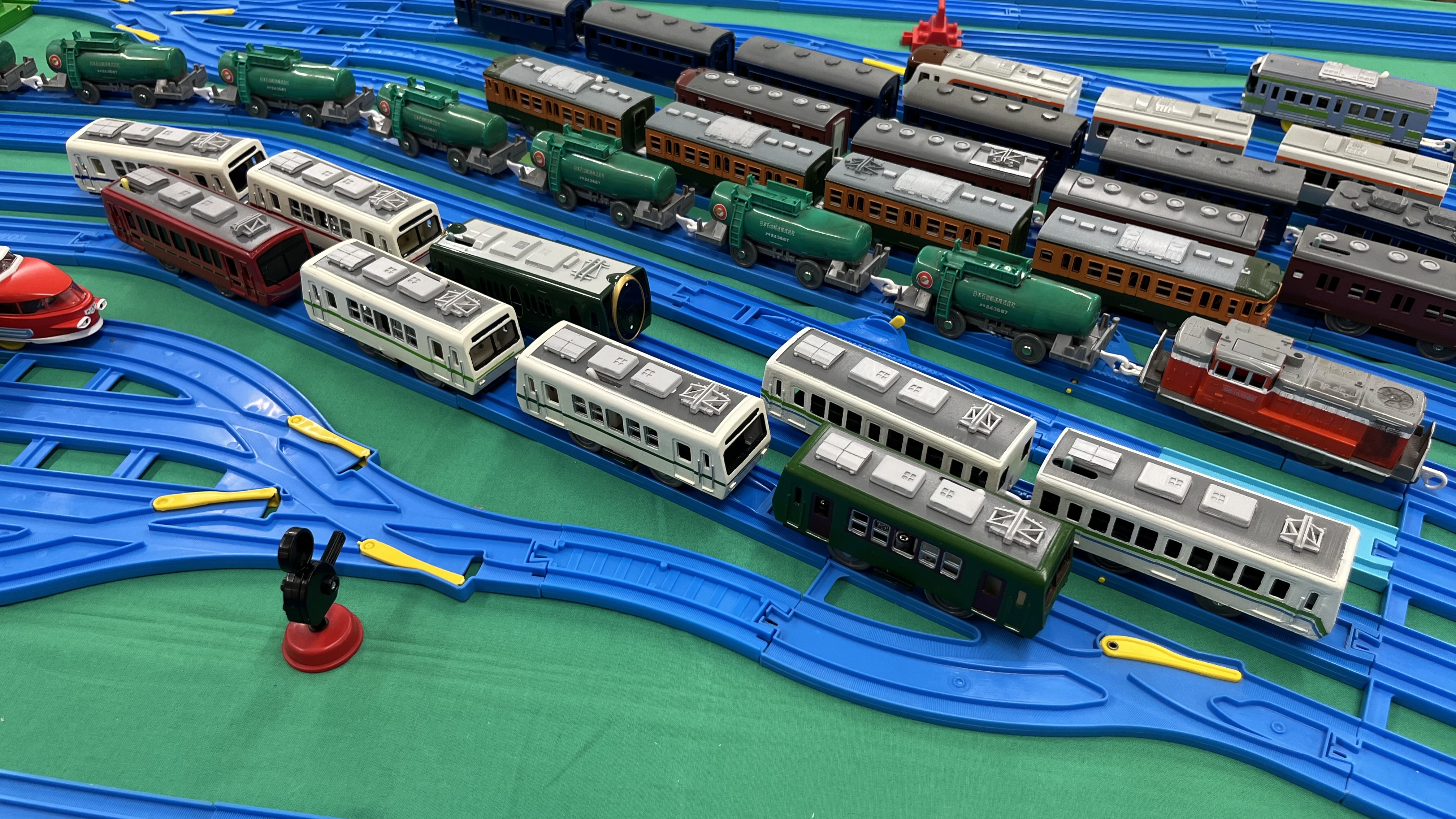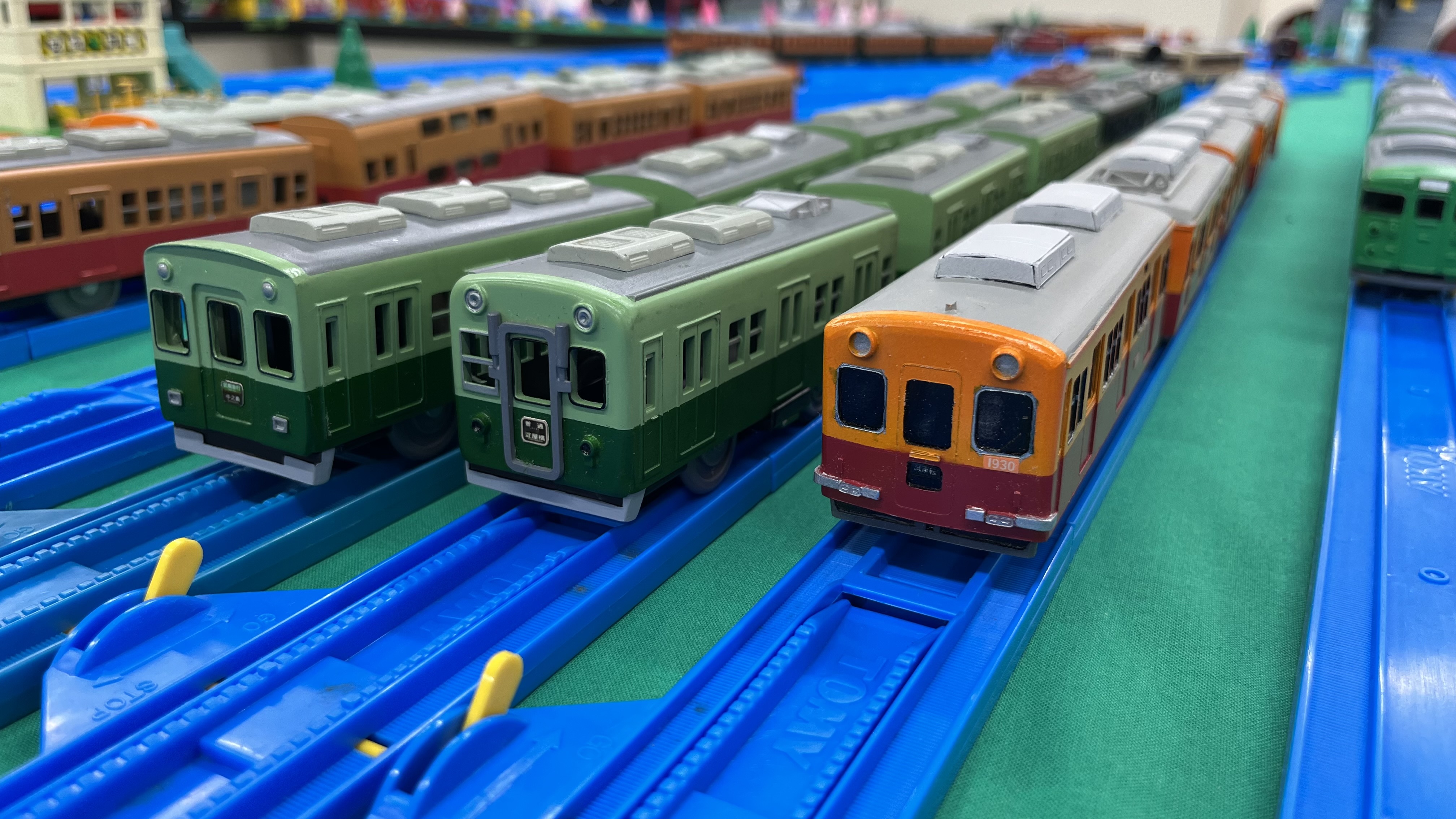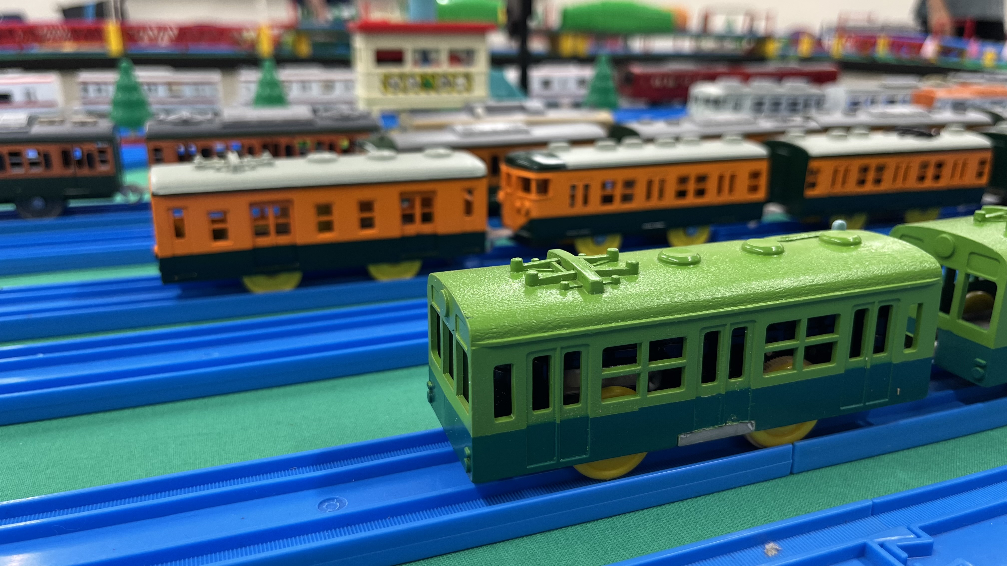 お馴染みの東海型急行電車165系から、451系、153系、717系、113系、455系、401系など、同じ顔でも色が違う車両がズラッと並ぶ様子は圧巻です。