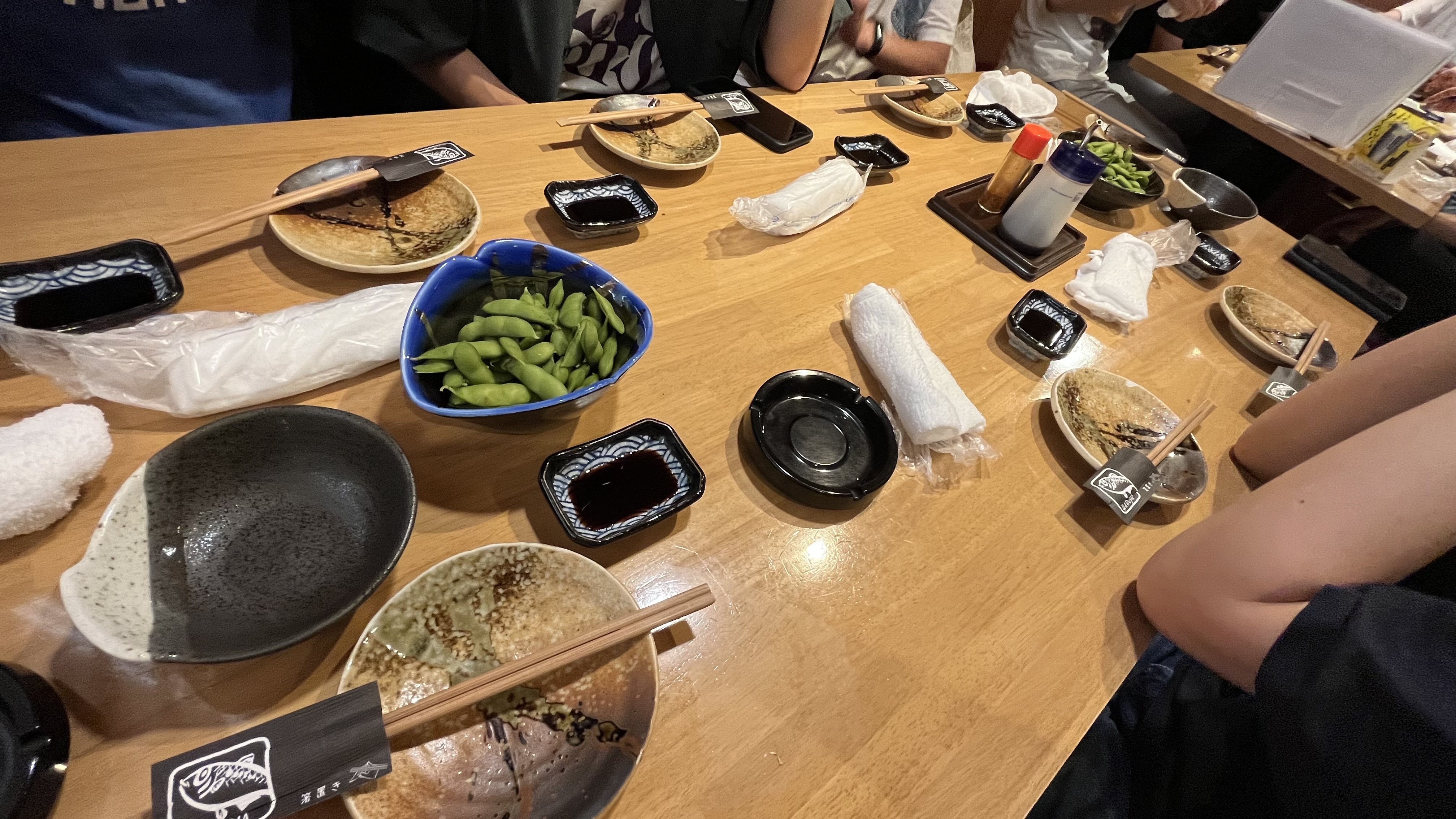 はい、十分プラレールで遊びました。ここからはオトナの時間です。宴会じゃ宴会じゃ!!!いつも使っている中華屋が改装工事中とのことで、今回は会場斜め向かいにある居酒屋に入りました。
