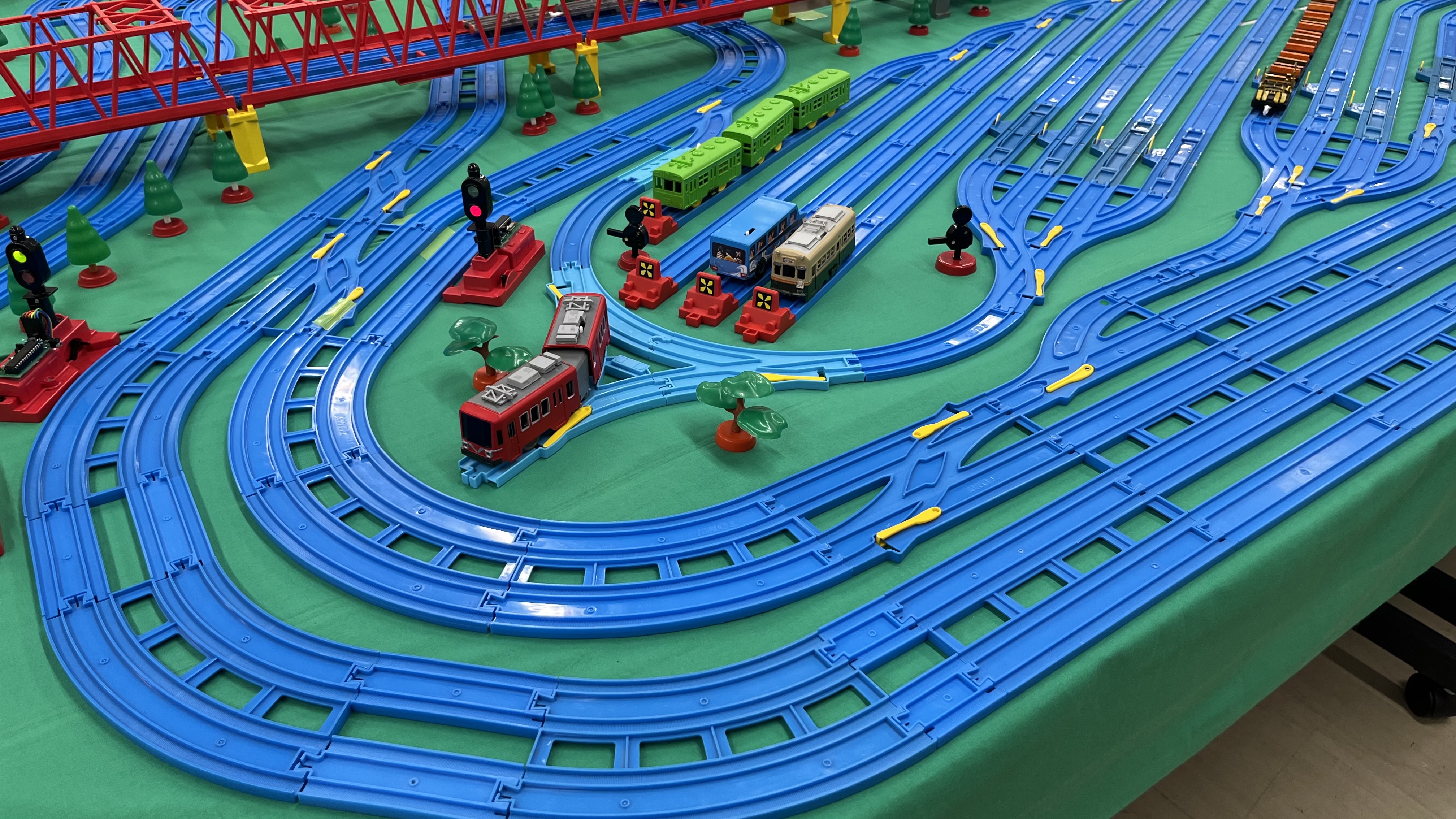 いや〜、濃い宴会でした。ここからは2日目の様子です。すっかり閑散としてしまった車庫には名鉄の路面電車が停まっています。なるほど、三角ポイントレールってこう使うんですね。