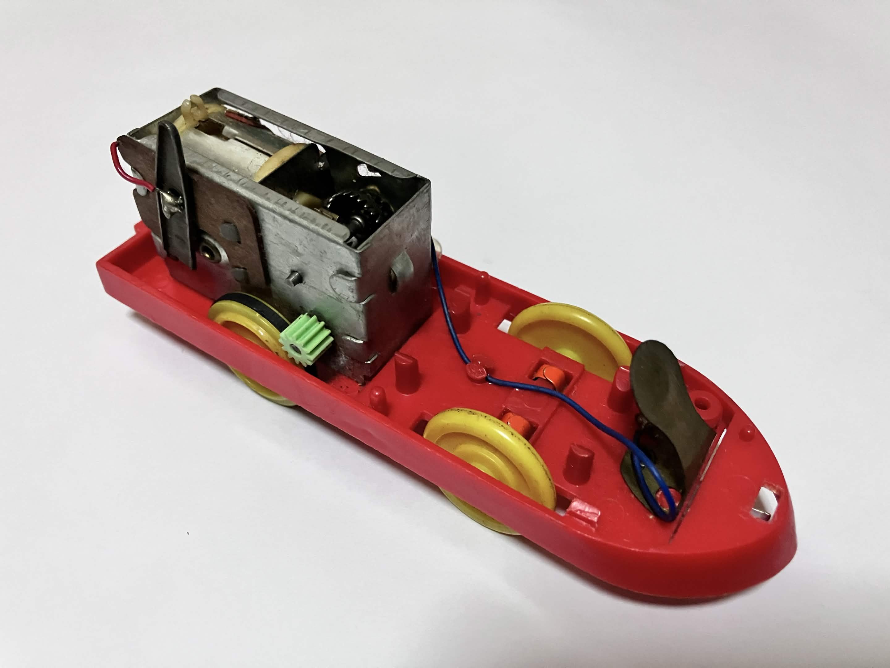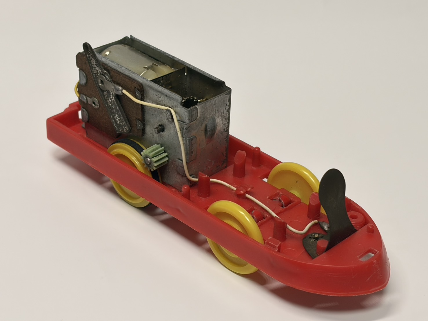「電動超特急ひかり号」の動力シャーシ。モーターユニットは「電動プラ汽車」のものと同様。スイッチは先頭部に付いており、車輪はブリキ製。