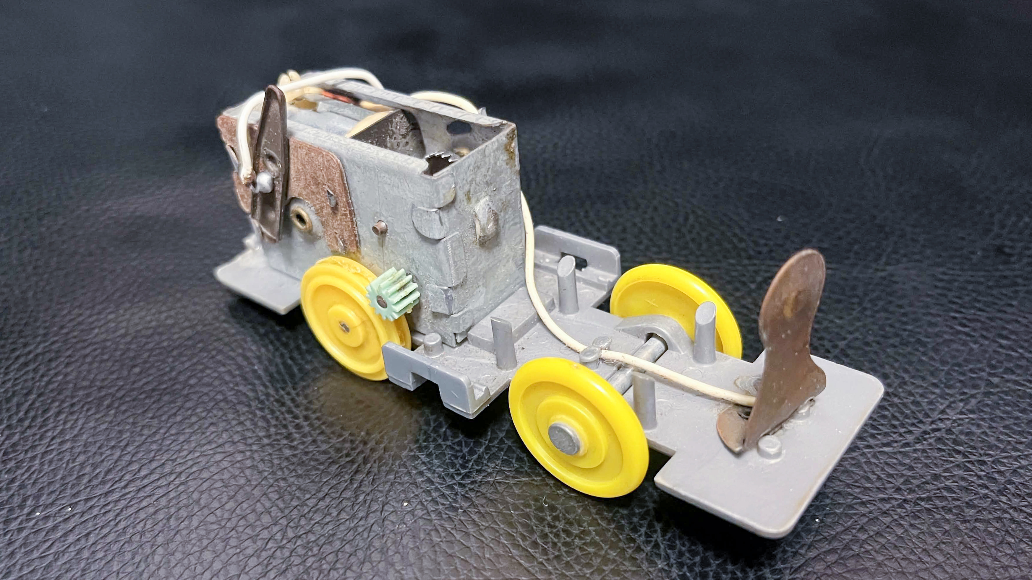 「スカイライナー」の動力ユニット。旧動力としては最も後期に当たるもので、丸みを帯びたユニットが搭載されている。モーターの電極は前向き。通電用の鉄板がユニットに内蔵されるようになった。