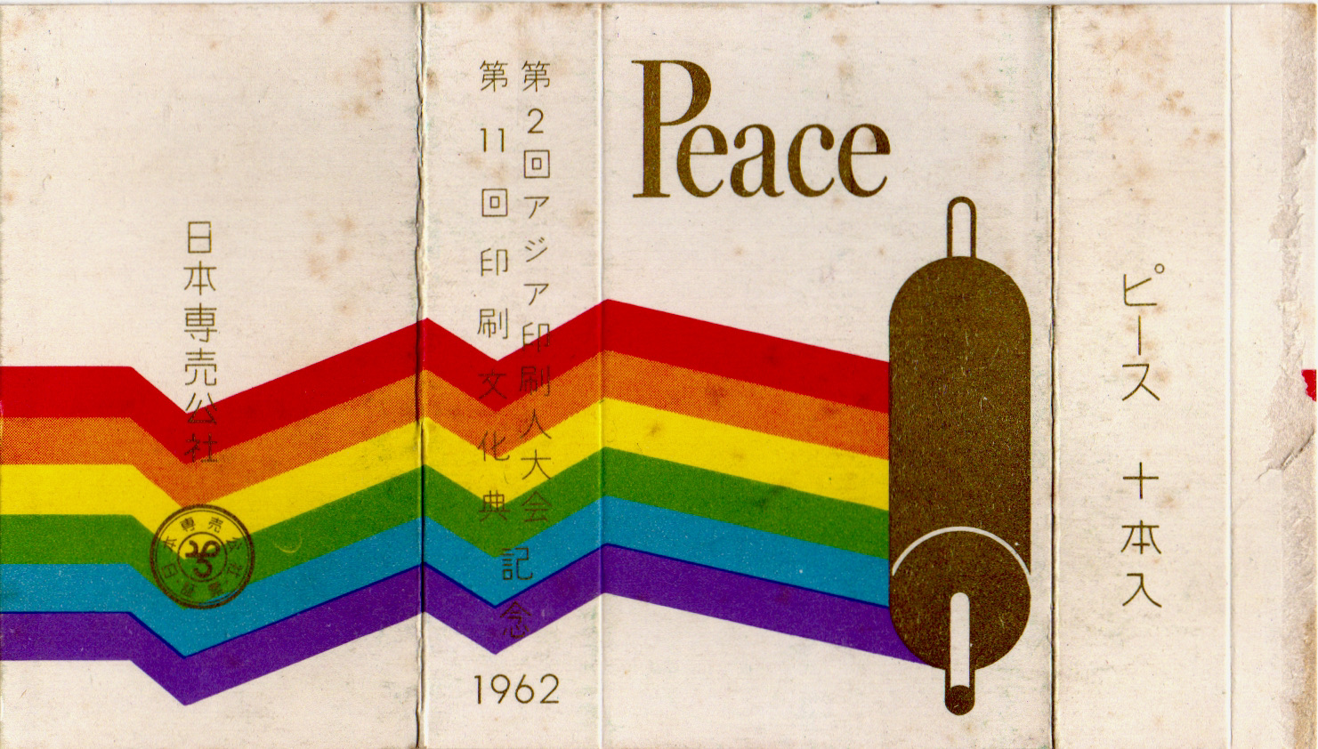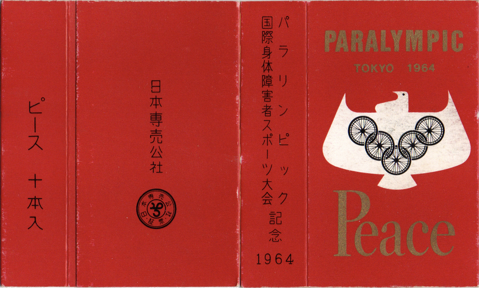 東京オリンピックに続いて開催された東京パラリンピック1964年大会の開催記念パッケージ。五色ピースの赤よりも赤みが強い地色が眩しいですね。