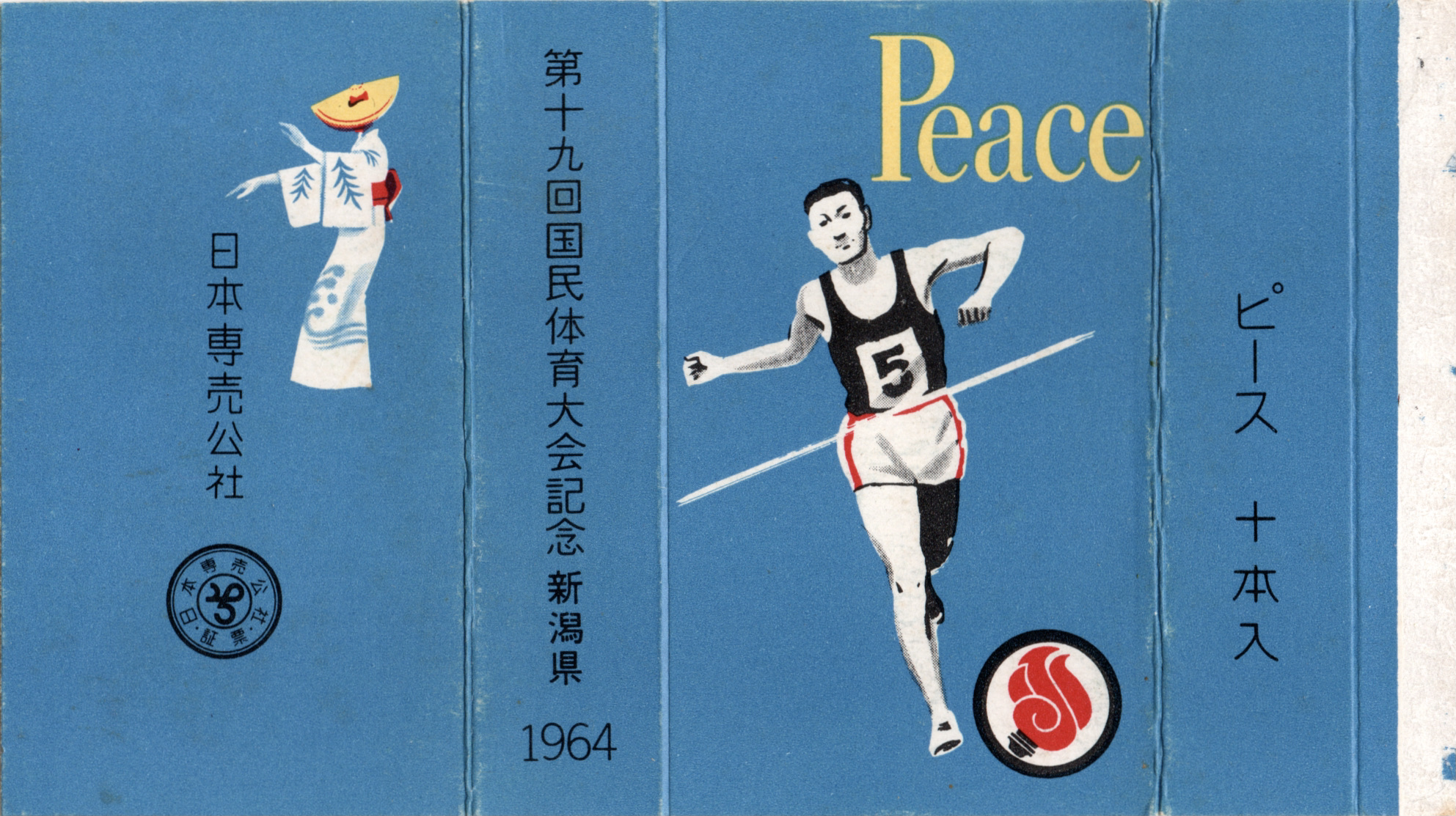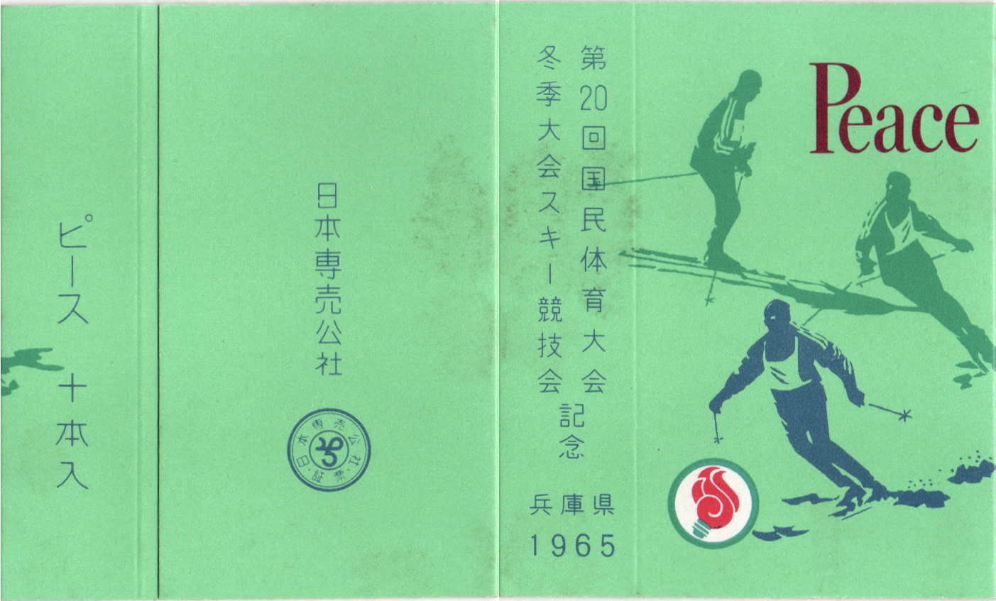 第20回国民体育大会の冬季大会でスキー競技が行われた記念のパッケージ。デザインは前年の東京オリンピック記念パッケージの意匠を踏襲しています。