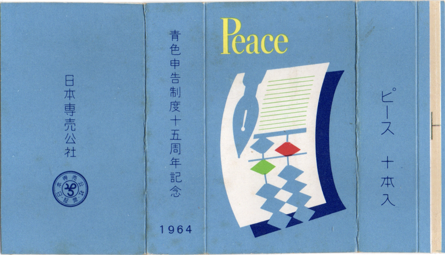 1949年に施行された青色申告制度の15周年記念パッケージ。万年筆とそろばんと青色申告制度の記念なので青い地色。シンプルですが、濃い青で影を表現しているのが良いアクセントです。