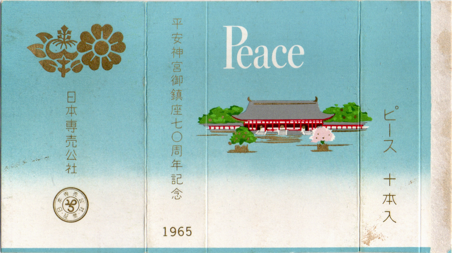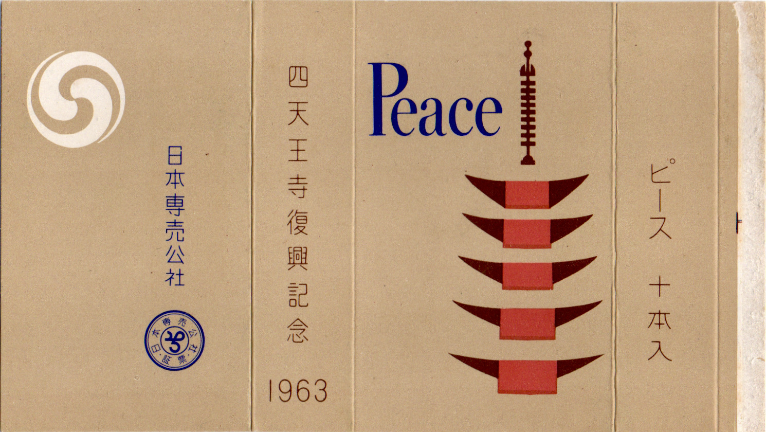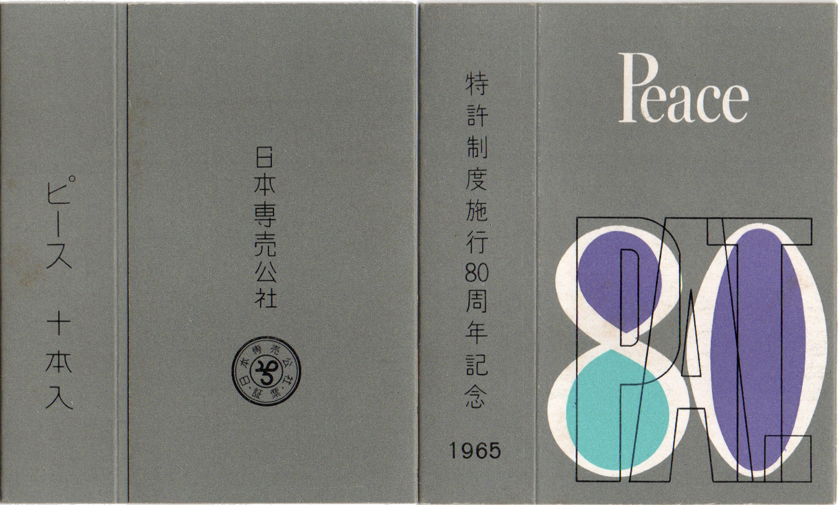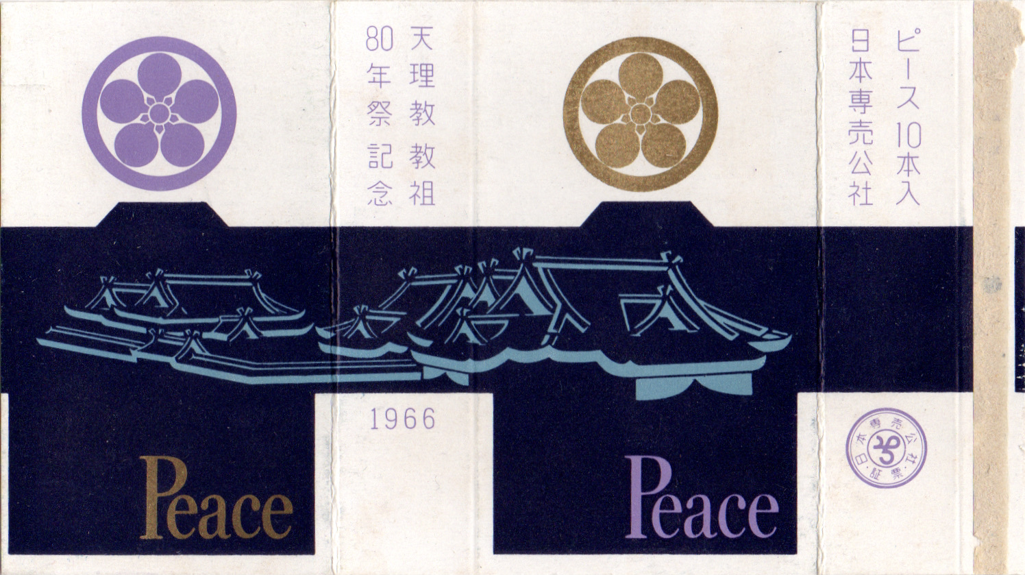 1966年1月26日〜2月18日に行われた教祖80年記念祭の記念パッケージ。表裏でピースのロゴと天理教の紋の配色が反転しているのが特徴です。