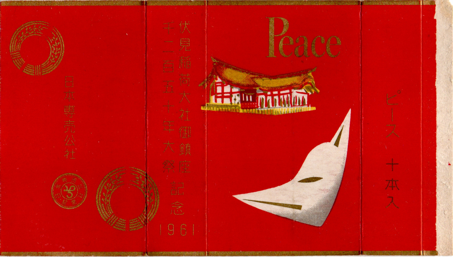 伏見稲荷大社の御鎮座1250年を記念して開催された大祭の記念パッケージ。千本鳥居の中にいるような真っ赤な地色に狐の面と内拝殿というデザインです。