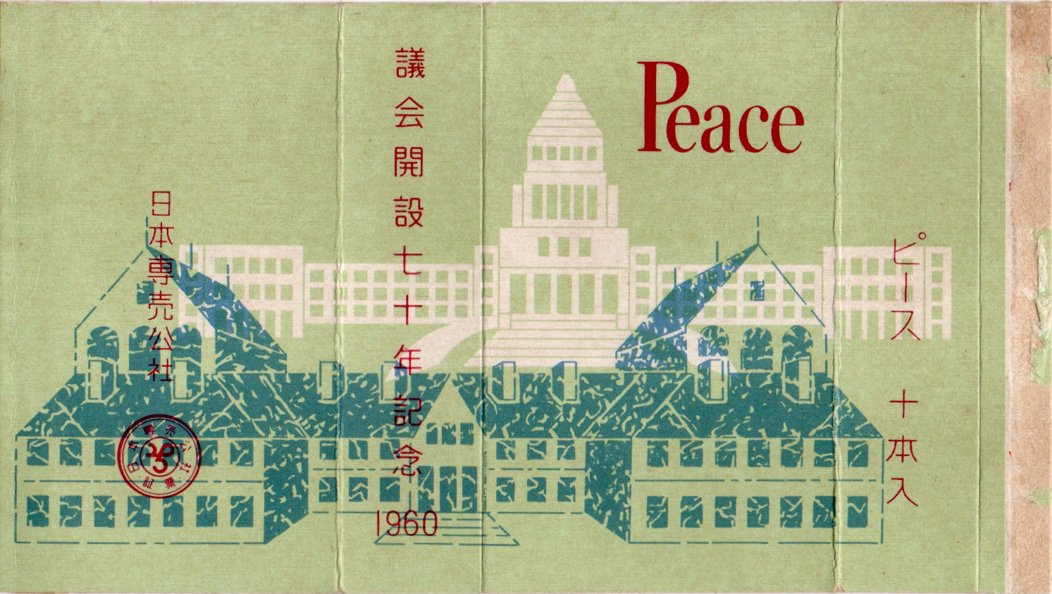 1890年の帝国議会開設から数えて70周年を迎えた記念のパッケージ。手前に初代の国会議事堂「第一次仮議事堂」、奥に現在の「現議事堂」が描かれており、木造から鉄筋へと移り変わった70年の歳月が表現されています。
