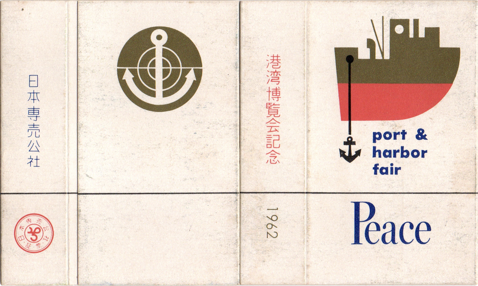 東京の晴海埠頭で行われた港湾博覧会開催記念のパッケージ。デフォルメされた船舶と博覧会のロゴマークが描かれています。