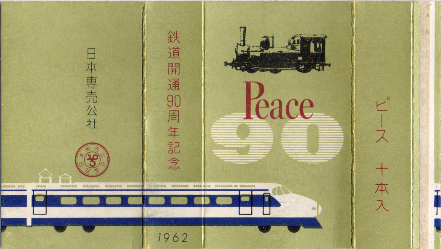1872年に日本で初めての鉄道が開通してから90周年を迎えたことを記念したパッケージ。日本初の機関車「1号機関車」と当時の最新電車「新幹線1000形B編成」が描かれています。