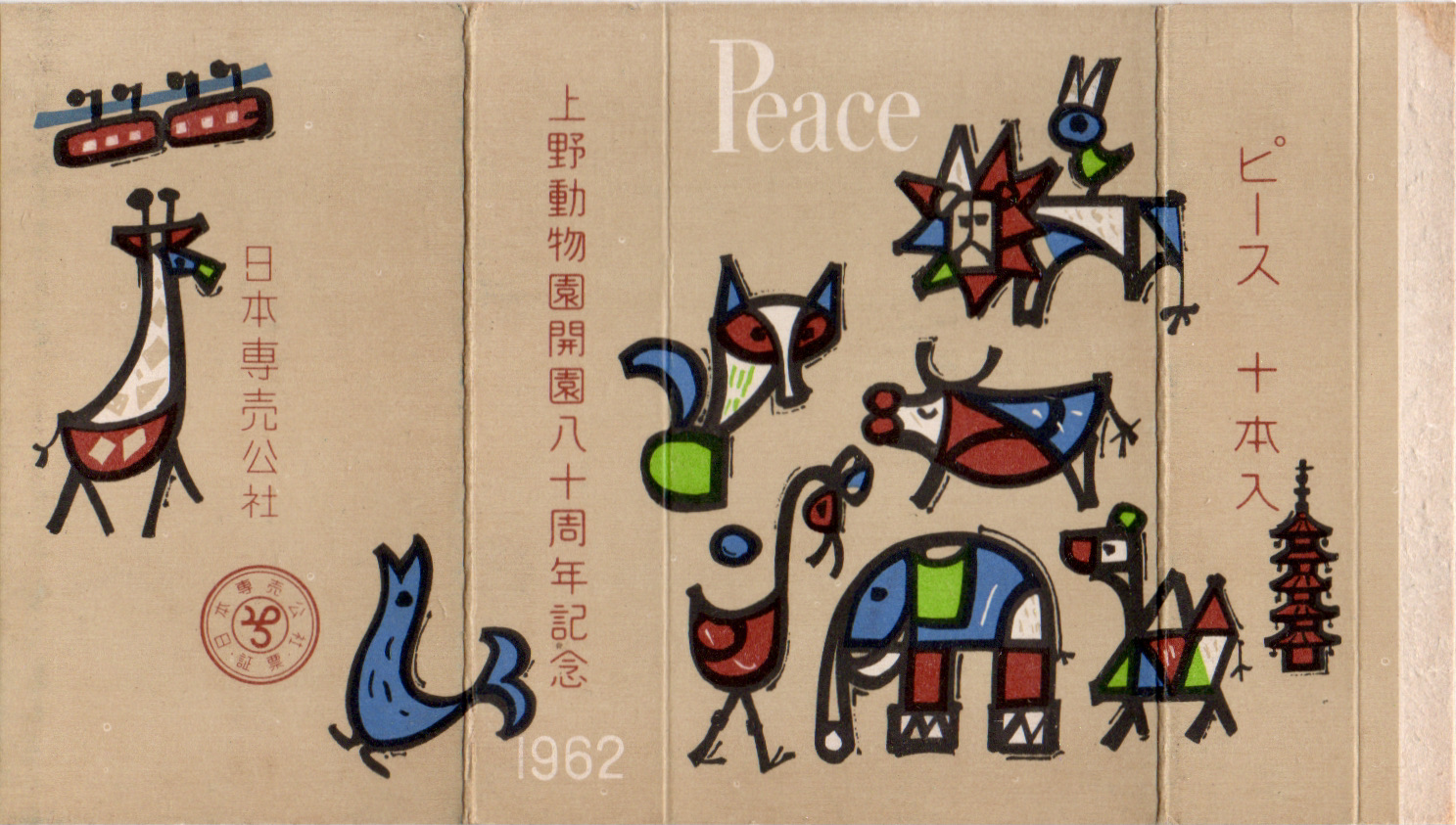1882年に開園した上野動物園の80周年記念パッケージ。独特な色使いのライオンやゾウなどの動物に、上野動物園の敷地内にある寛永寺五重塔、そしてモノレールが描かれています。