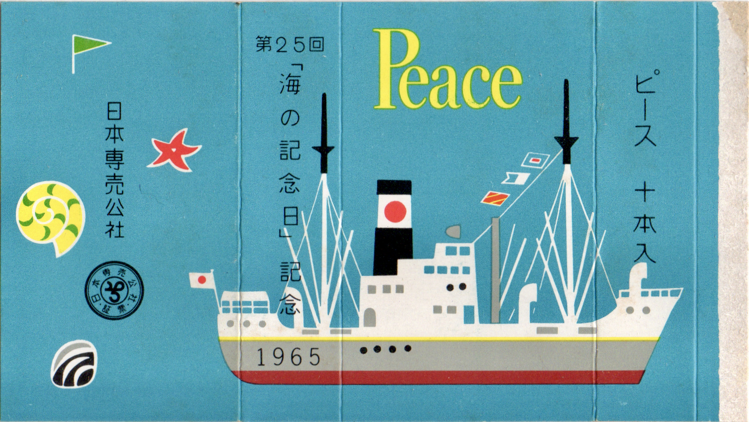 その海の記念日が1941年に制定されてから25回目を迎えた記念のパッケージです。デフォルメされた船に、貝殻や巻貝、ヒトデ、旗が描かれています。