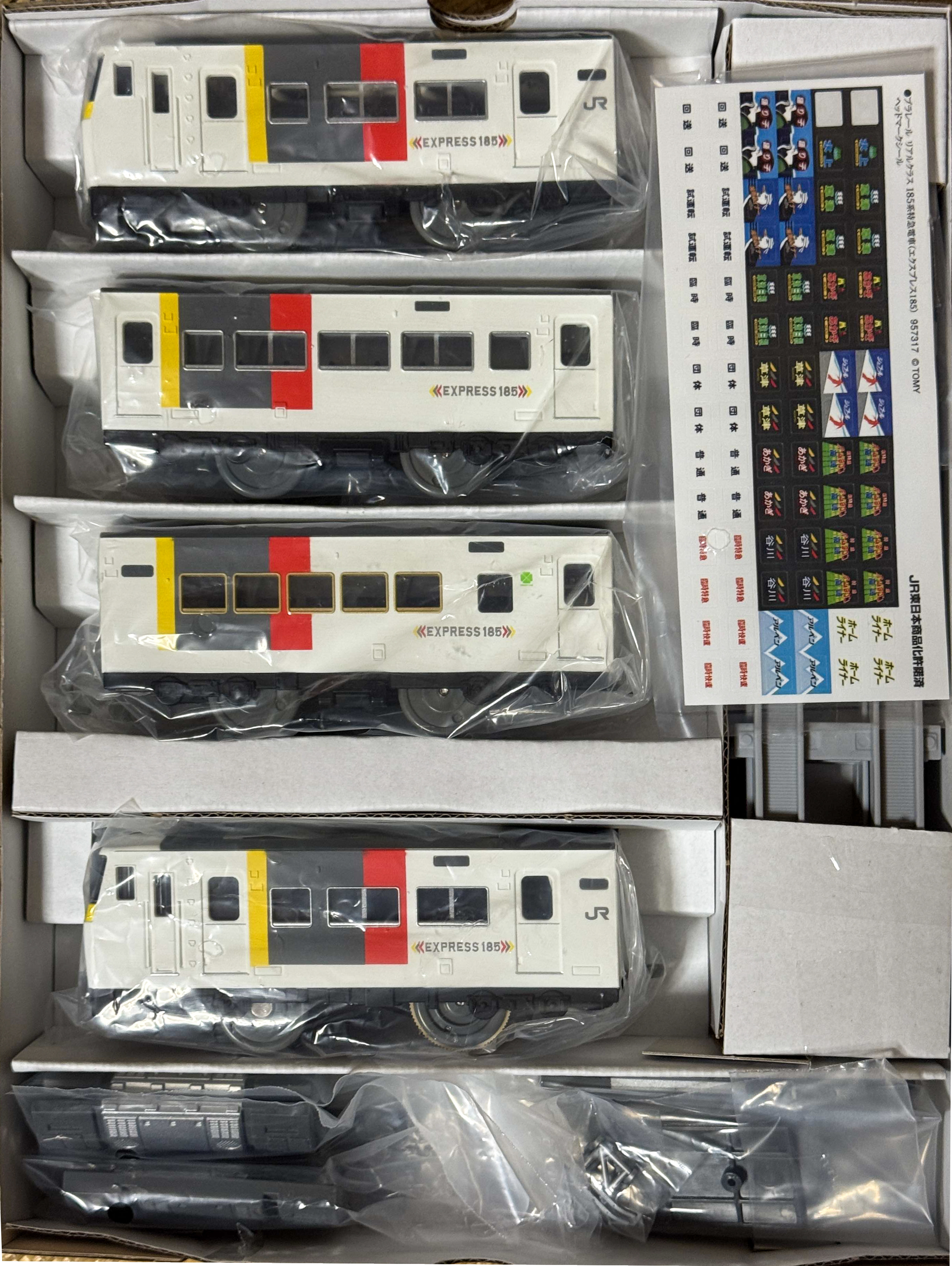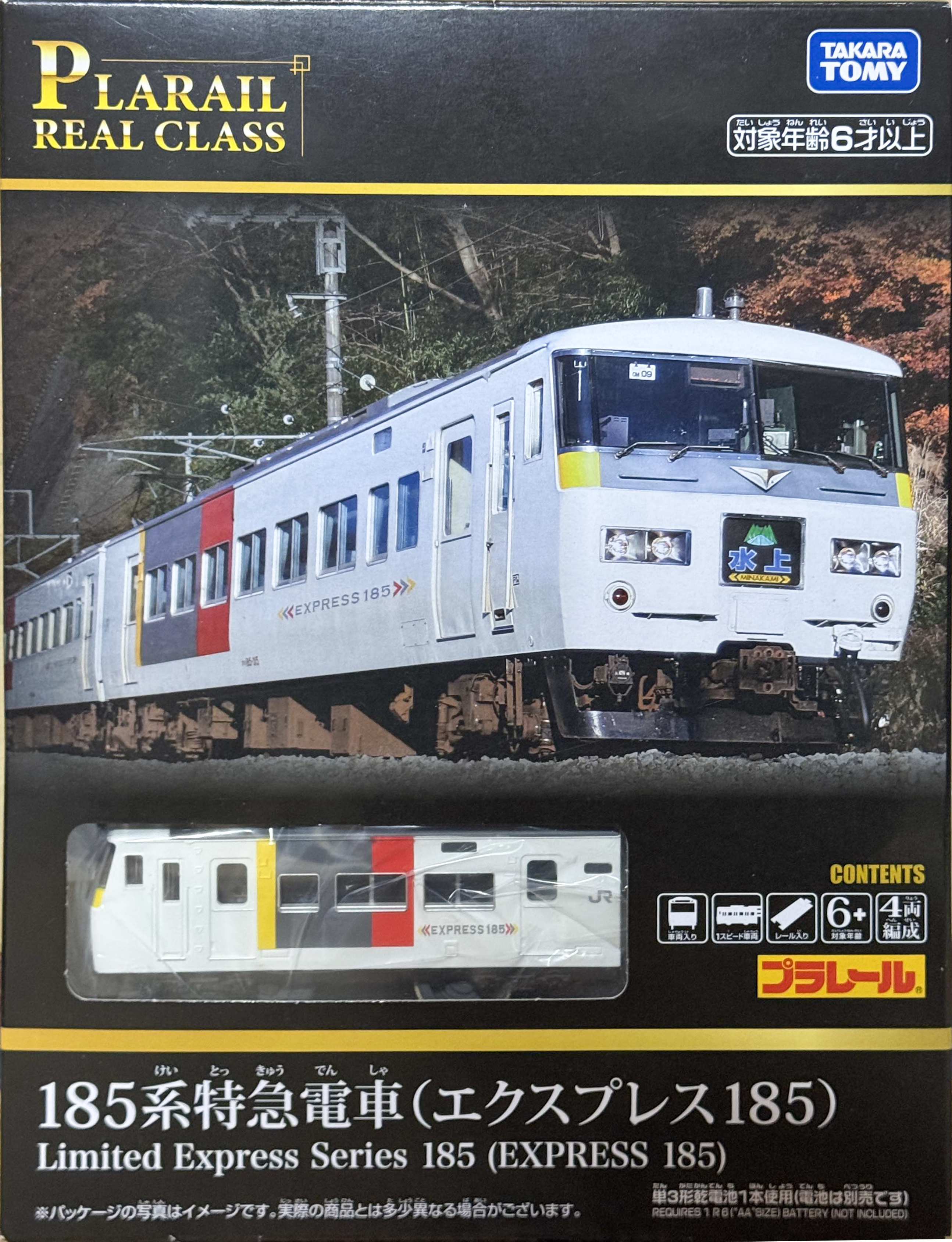 編成はクハ185(動力車) - サロ185 - モハ184 - クハ185。サロ185にはグリーン車のマークが印刷で表現されています。全体的には高評価ですが、屋根パーツの「ロータイプ」がまるで縁日の型抜きみたいに筋彫りされているだけなのがかなり残念な印象です。走らせるなら情景部品に気をつけた上で「ハイタイプ」を装備した方が良さそうです。また、グリーン車の窓枠は実車では金色なんですが、リアルクラスでは何故か銀色で塗装されています。