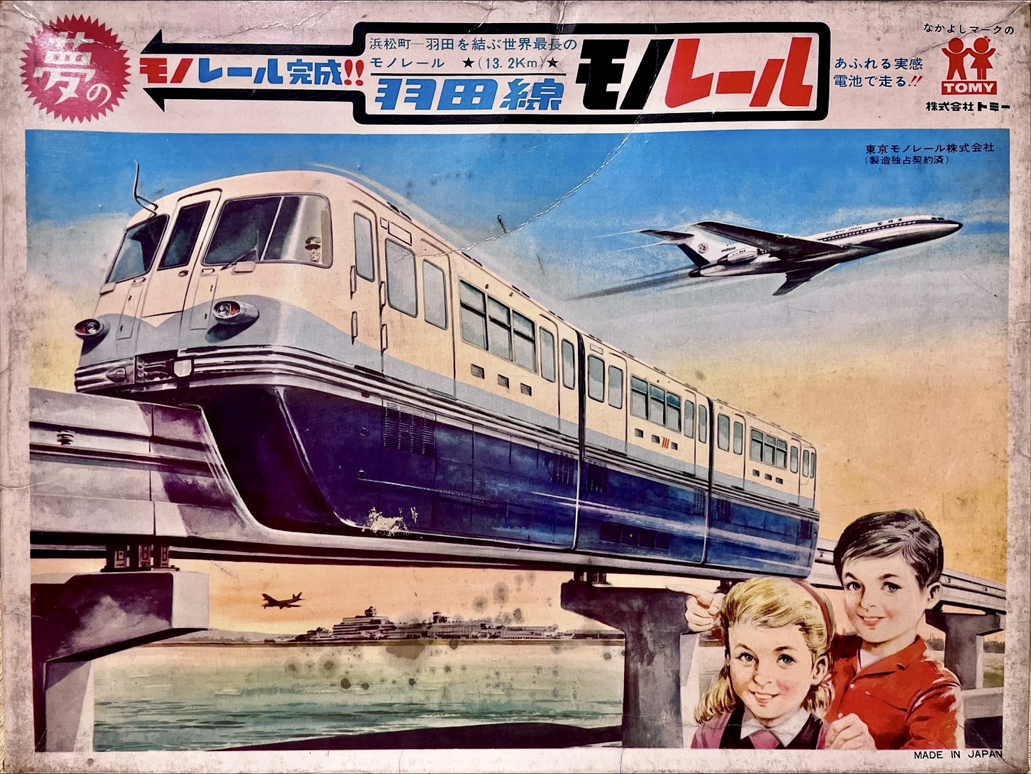 箱はフルカラー印刷のイラストメインです。羽田空港を背景に、300形が先頭の3両編成が真新しいレールの上を疾走し、その上には1964年5月にデビューした全日空の新鋭機、ボーイング727型が飛んでいます。そして海外と日本を結ぶ東京モノレールだからこそという感じで白人の兄妹が描かれているのが微笑ましいです。
