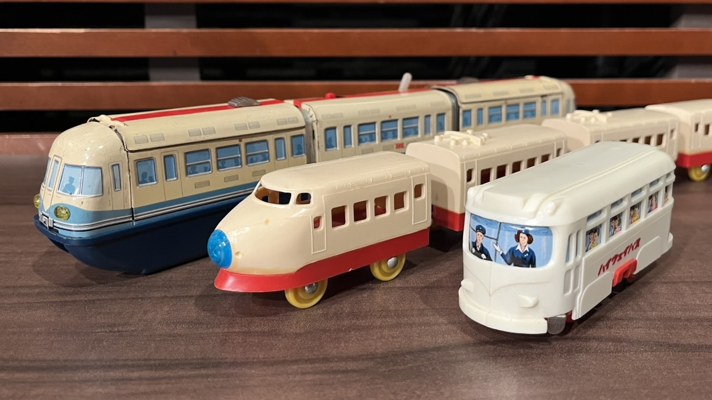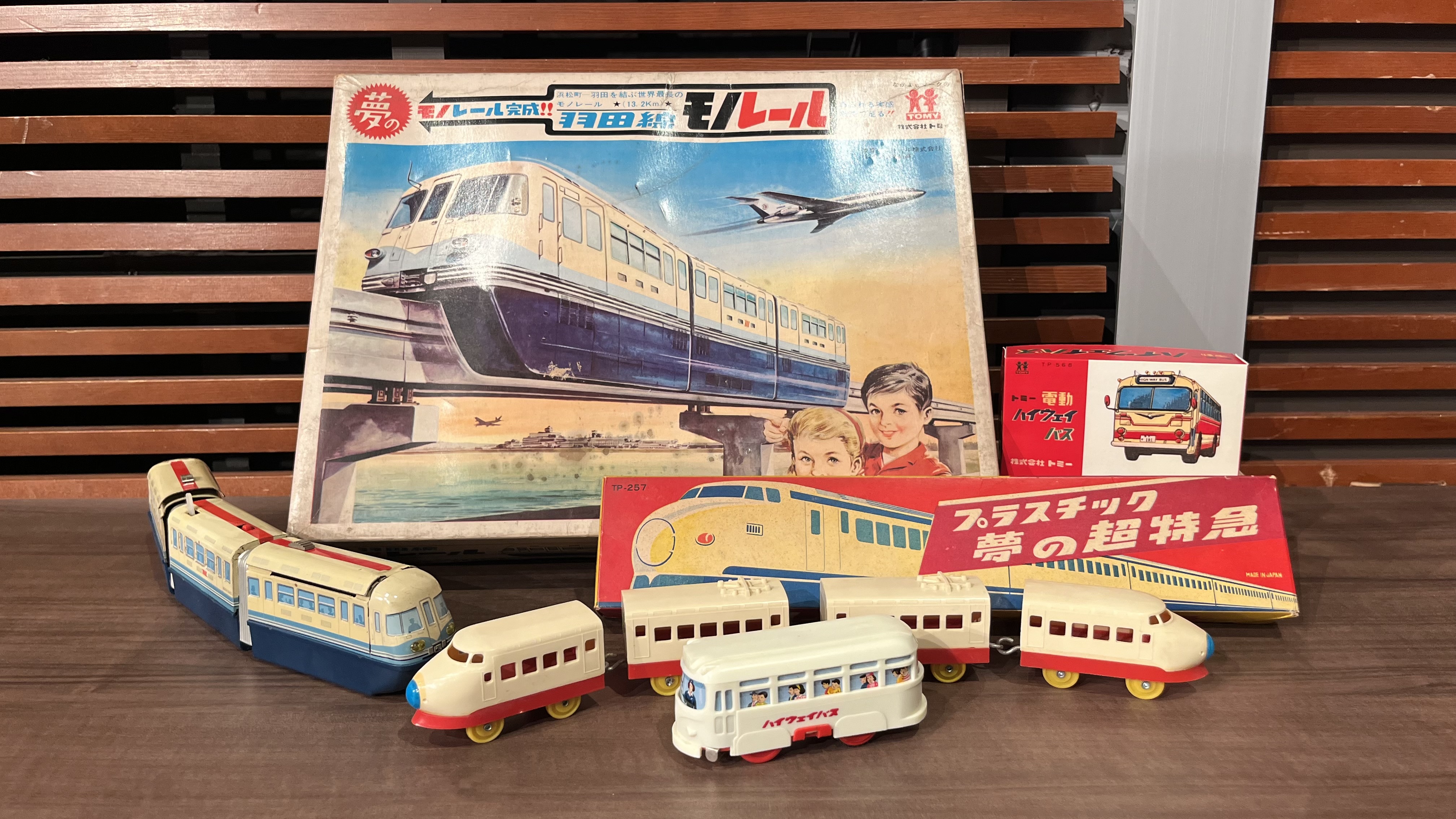 同世代の製品ながら、デフォルメの手法に大きな差がある「羽田線モノレール」「プラスチック夢の超特急」「ハイウェイバス」の1960年代トミー製品組。プラレールだけを見ると「昔のおもちゃはいい加減だった」と思う方もいるかもしれませんが、当時のトミーがブリキに強く、プラスチックではまだ試行錯誤を行っていたことが伺える一品です。