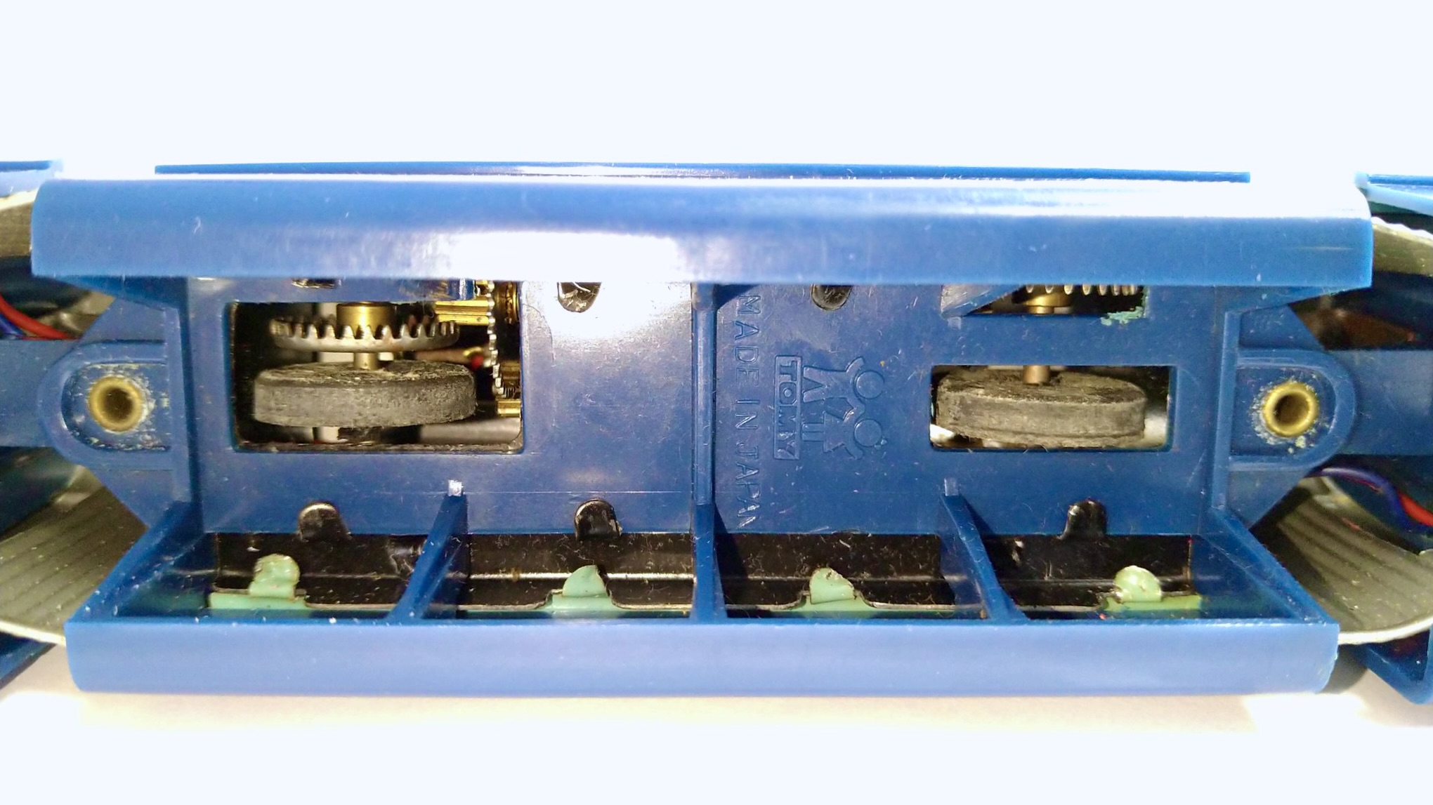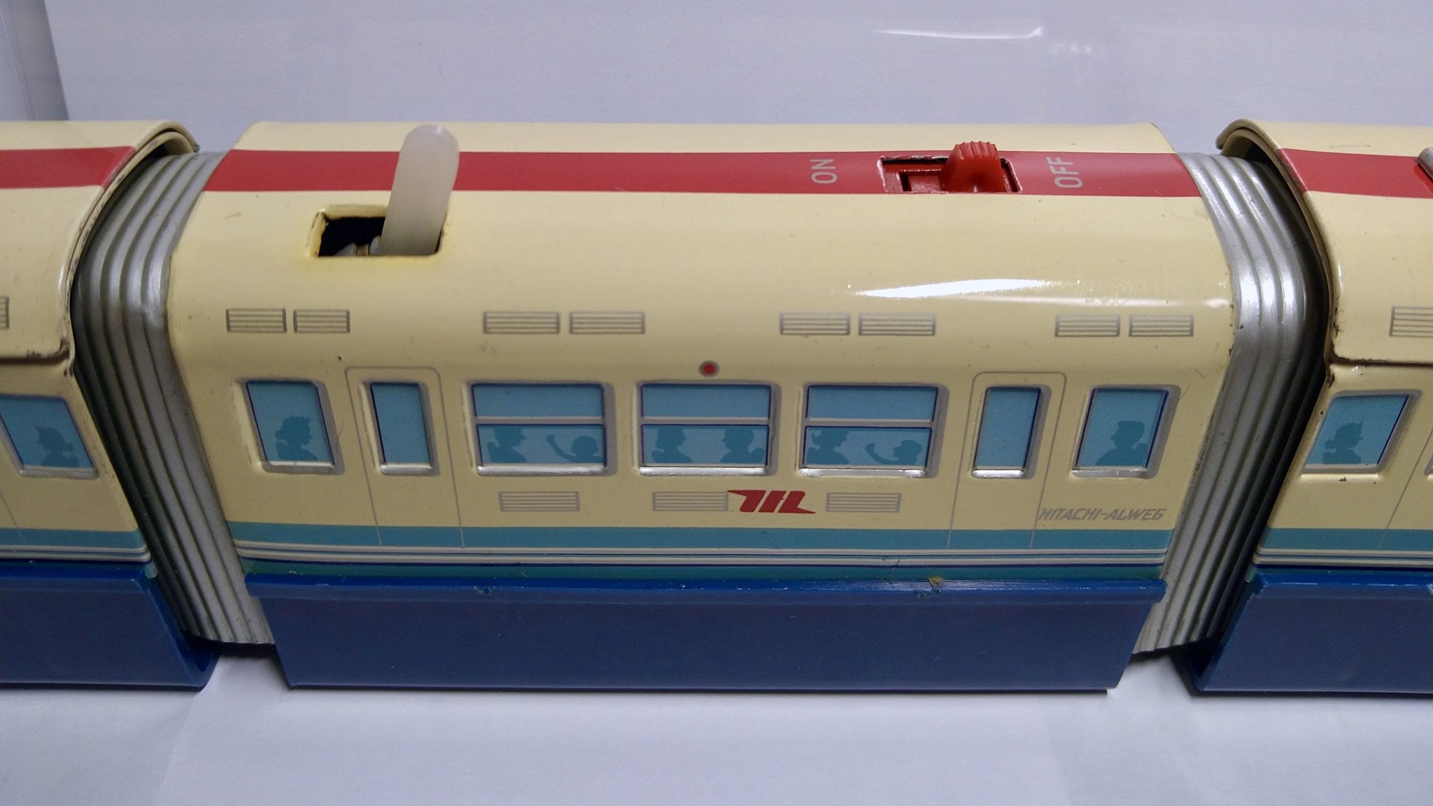 車両は車体がブリキ製、足回りはプラスチック製です。当時のブリキ鉄道玩具に倣い、窓には乗客の姿も描かれていますが、ハイウェイバスのように一人ずつ表情を付けているわけではなく、シルエットで表現されています。動力は中間車に積まれており、単1形乾電池2本を使用するというなかなかの高コスト仕様です。先頭・後尾が電池ボックスとなっています。
