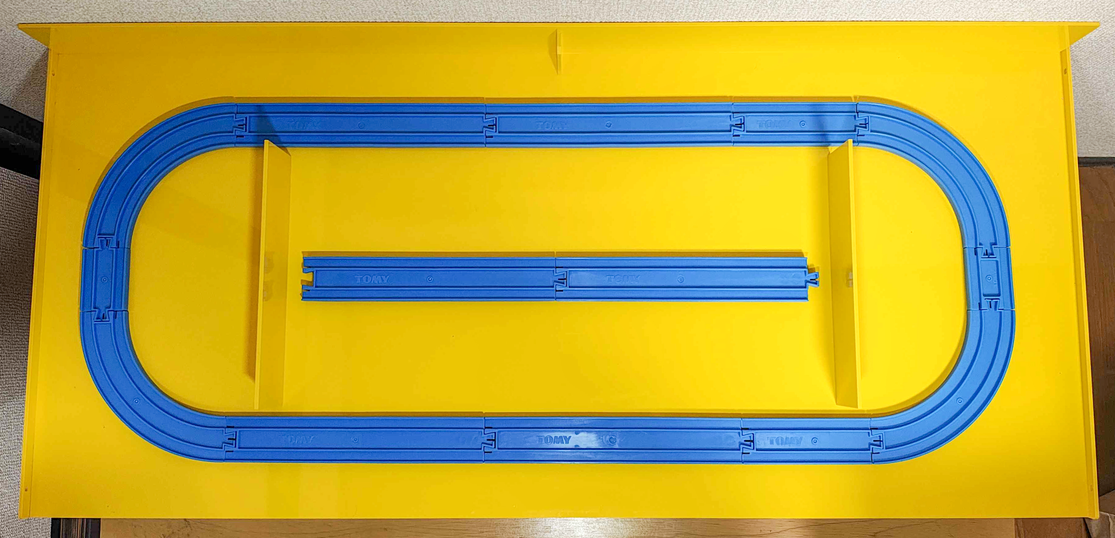 一昔前はよく量販店などのおもちゃ売り場で見られた車両単品用のディスプレイケース。下段に箱を収納でき、上段にはエンドレスが組まれ、車両を走行展示できるようになっています。エンドレスのレイアウトには何故か通常のセットでは1976年の「ちかてつふくせんセット」を最後に姿を消した90°小曲線レールが使われてます。これはしっかり日本製だそうで、ケース制作時に在庫が見つかったのかもしれません。
