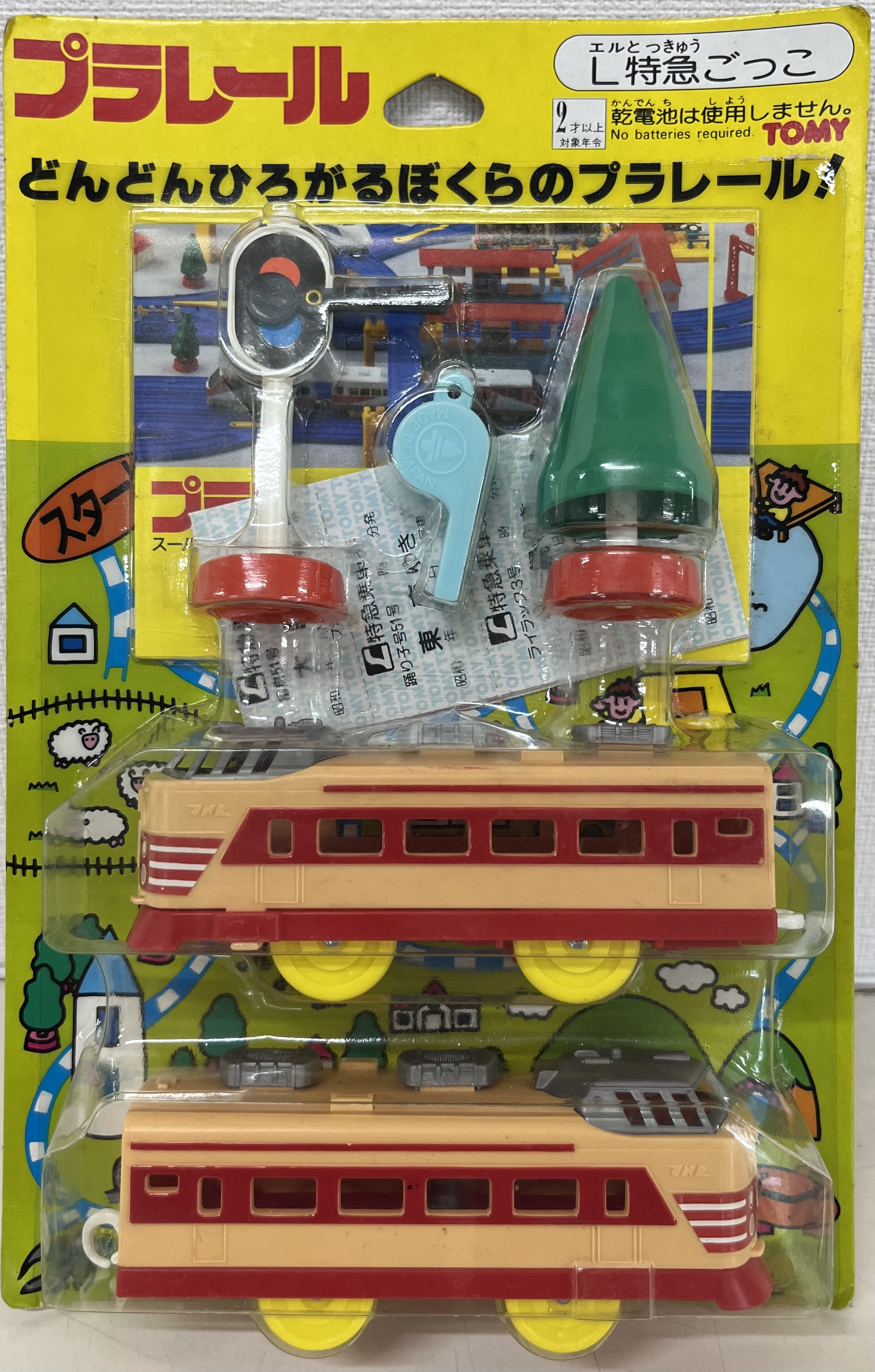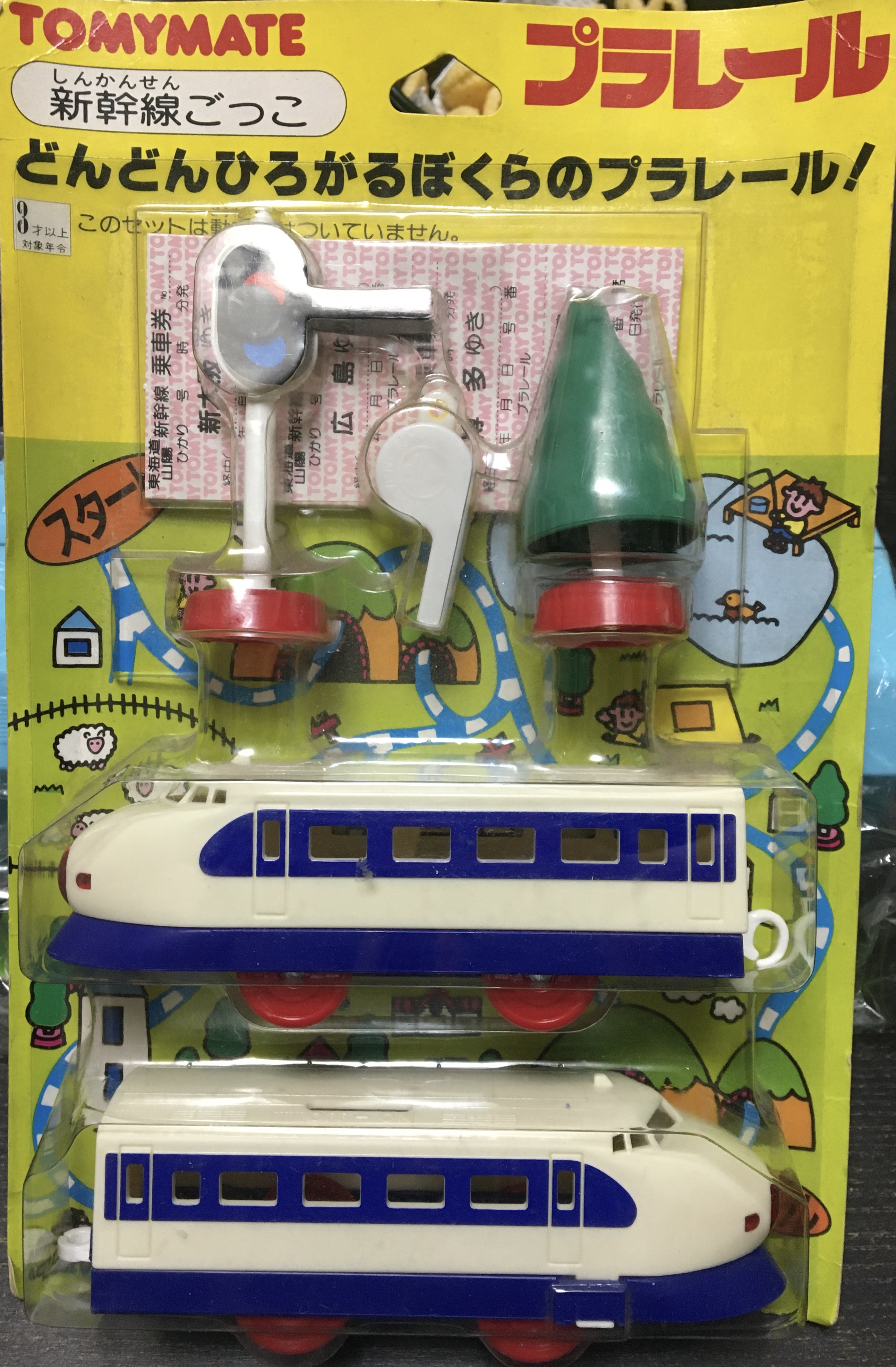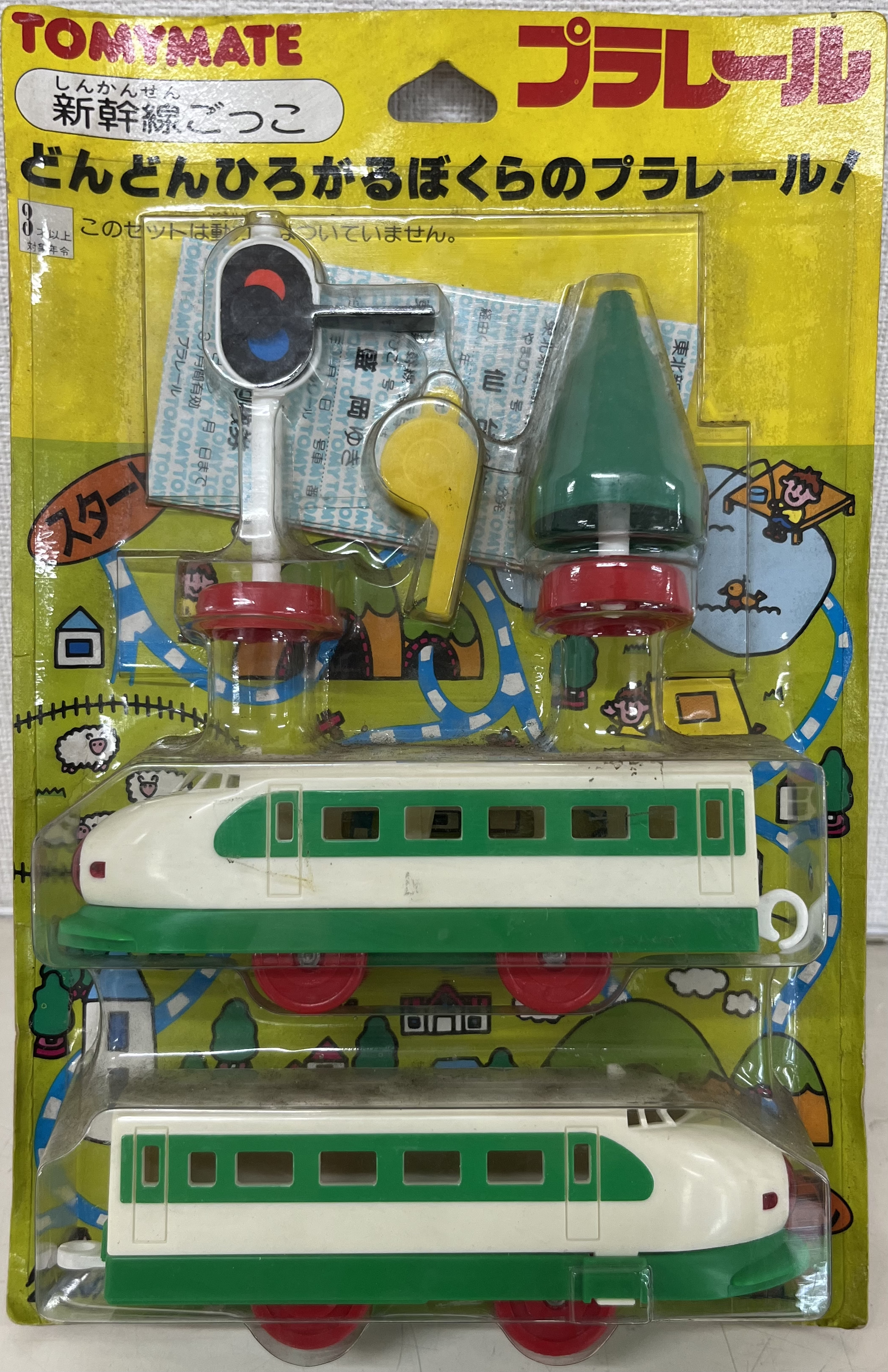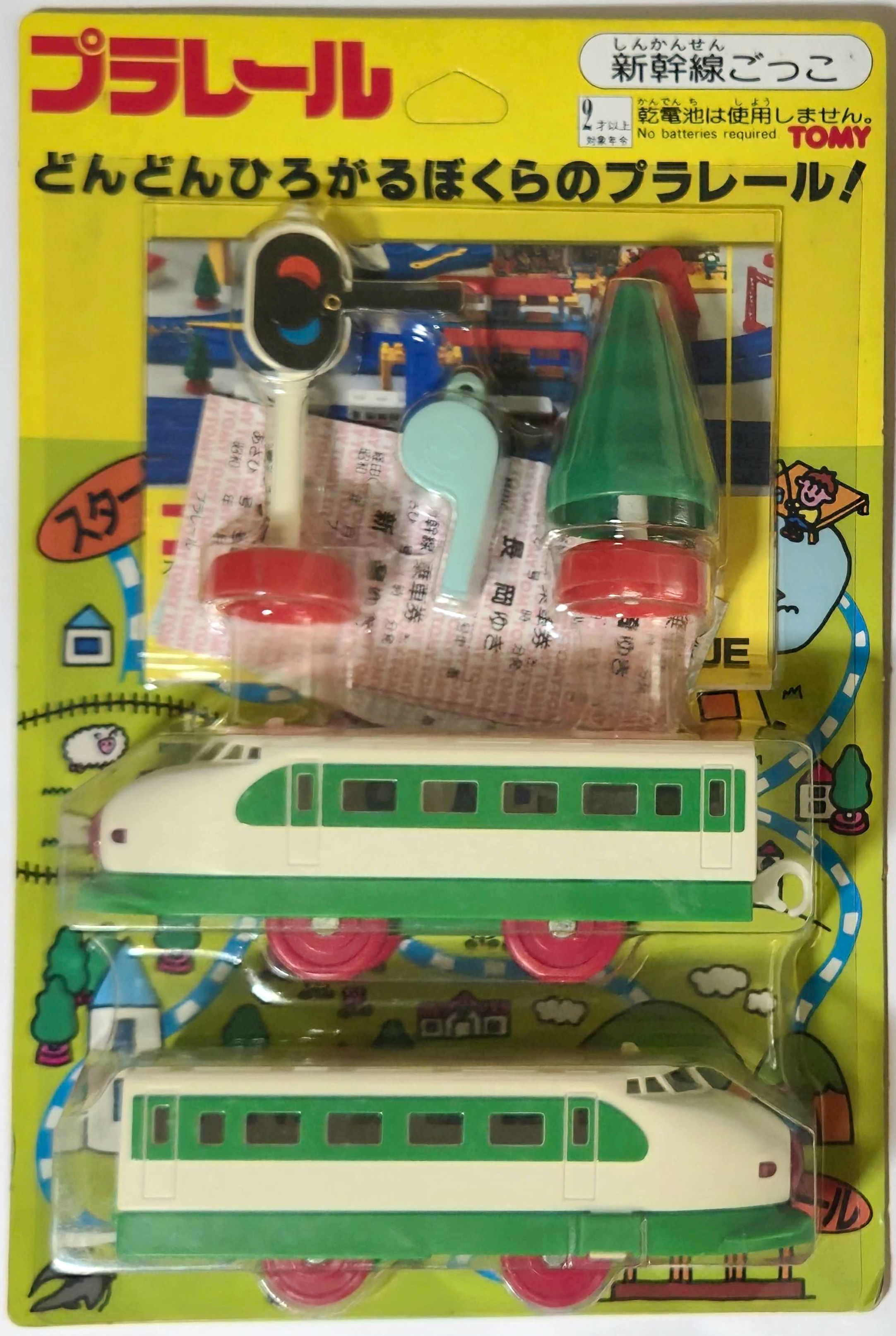 プラレール入門用の無動力2両編成のセット。新幹線ごっこ(ひかり号と東北上越新幹線の二種)、L特急ごっこ、D51ごっこの計4種類がありました。