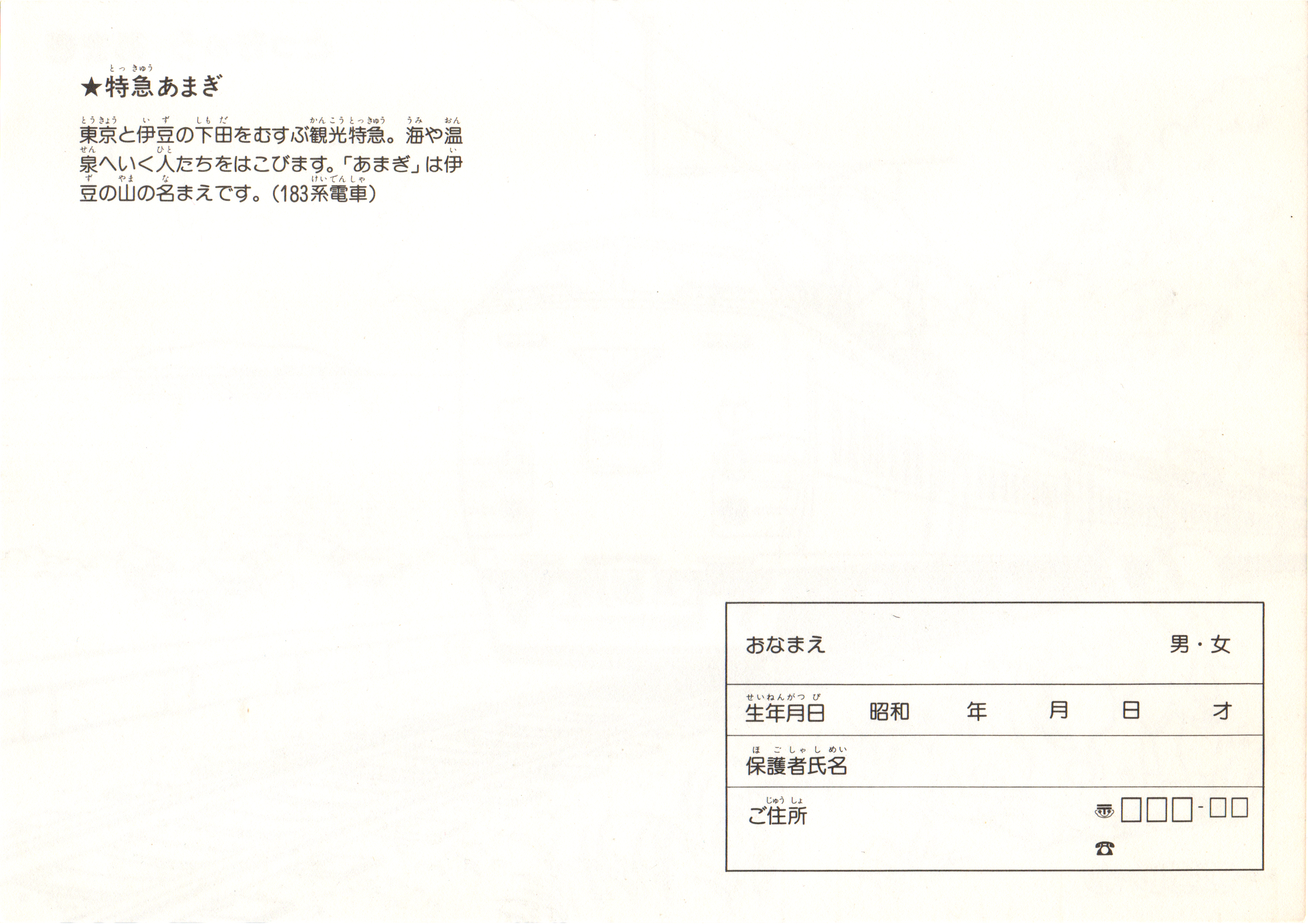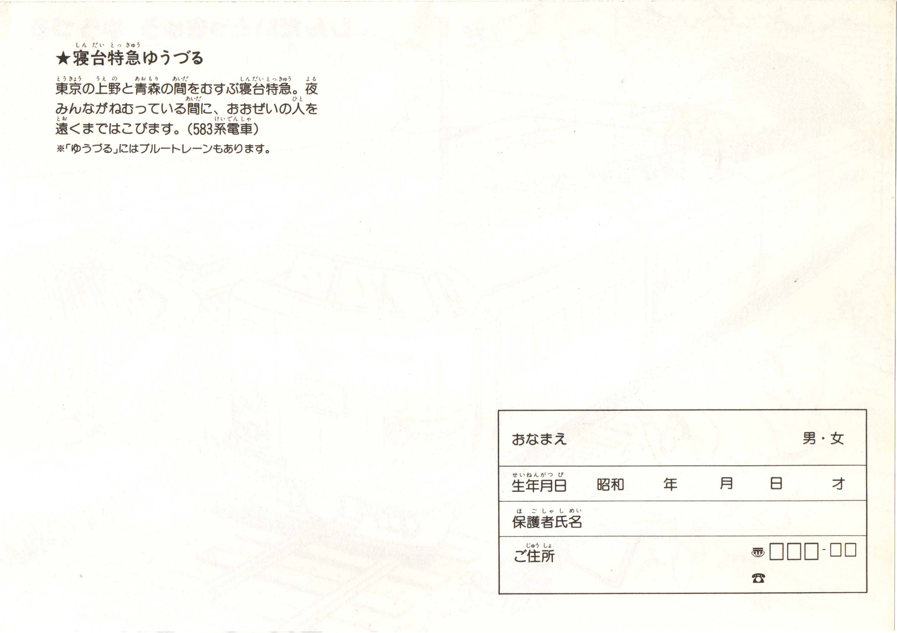上の塗り絵と同時に配布されたと思われる下敷き。表にはブルートレイン「さくら」の写真がデカデカと載っています。ブルートレインさくら、懐かしい響きですね。東京を発着するブルートレインの一つという印象が今なお強いですが、廃止から約20年が経過し、「さくら」の愛称も九州新幹線の列車名になってから既に10年以上です。