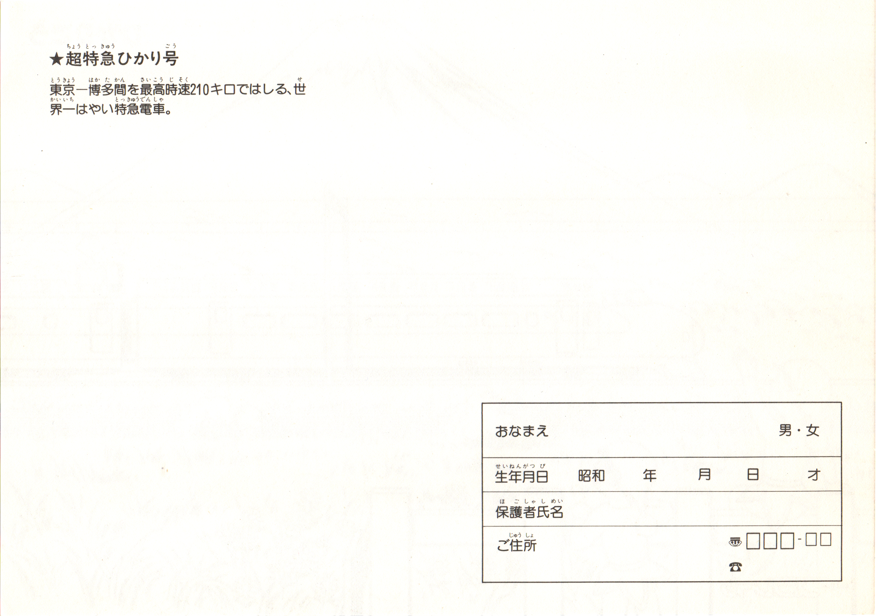 プラレールの塗り絵はたびたび内容が更新されて配布されていたようです。こちらは上のものの「ひかりごう」を、1985年にデビューした100系「ニューしんかんせん」に置き換えた3枚組。D51とブルートレインは20周年ロゴが削除されただけでそのまま引き継がれているので、ここでは割愛します。