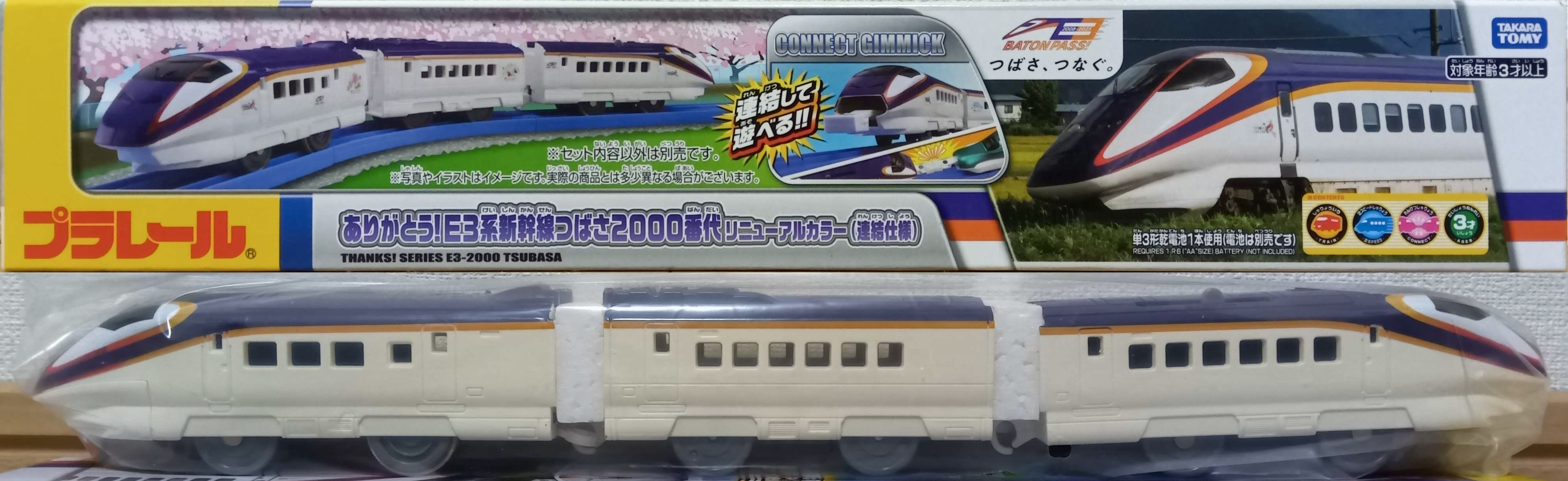 2026年3月14日に発売された「ありがとう!E3系新幹線つばさ2000番代リニューアルカラー(連結仕様)」は、なんと側面の装飾を付属のステッカーで全て自分で貼る方式での発売となりました。自分で貼れば通常仕様にもさよなら仕様にも出来るということでしょうか?しかし「S-09 E3系新幹線つばさ2000番代(連結仕様)」は現行品でありますし、今回発売されたものと通常品とでは特に差異があるわけでもなく... 不思議です。