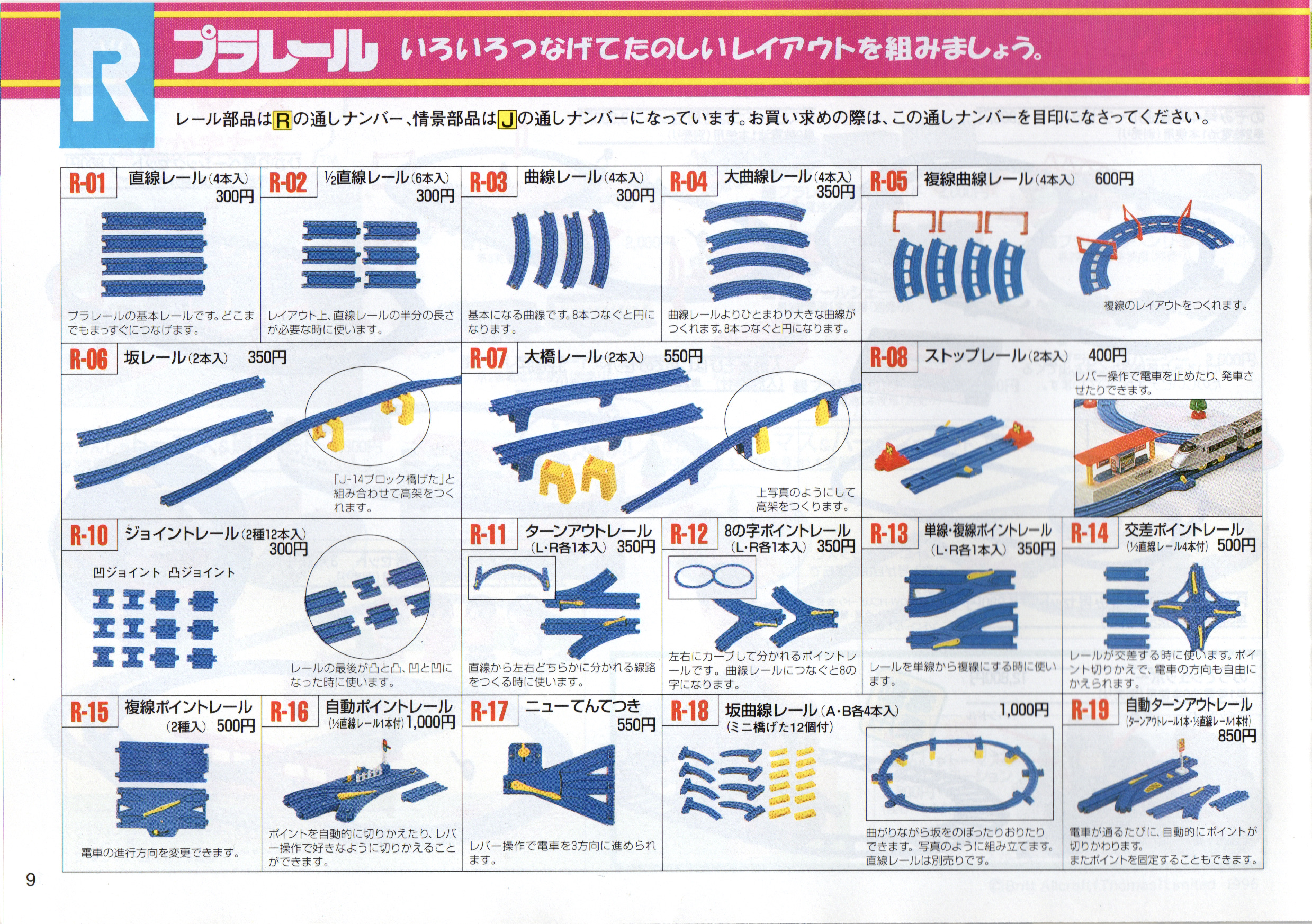 情景部品の「J-12 こせんきょう」の写真が「ドア開閉通勤電車セット」のものとなっていますが、みなさんご存知の通りこの頃の単品の跨線橋は水色のベースに白い本体のものです。R-09, J-06, 15, 16, 22, 24, 27は欠番です。
