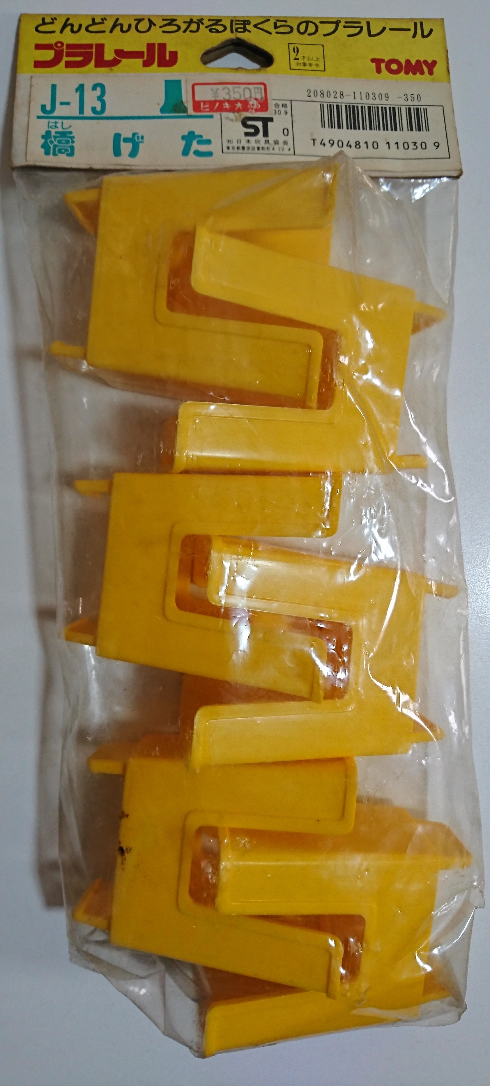 上の「はしげた」の発展版として、1972年頃に発売された爪が無い旧タイプの橋桁。当初は黄色成型でしたが、後にオレンジ成型になっています。3代目タグで黄色成型のものは生産期間が短く、珍しいです。