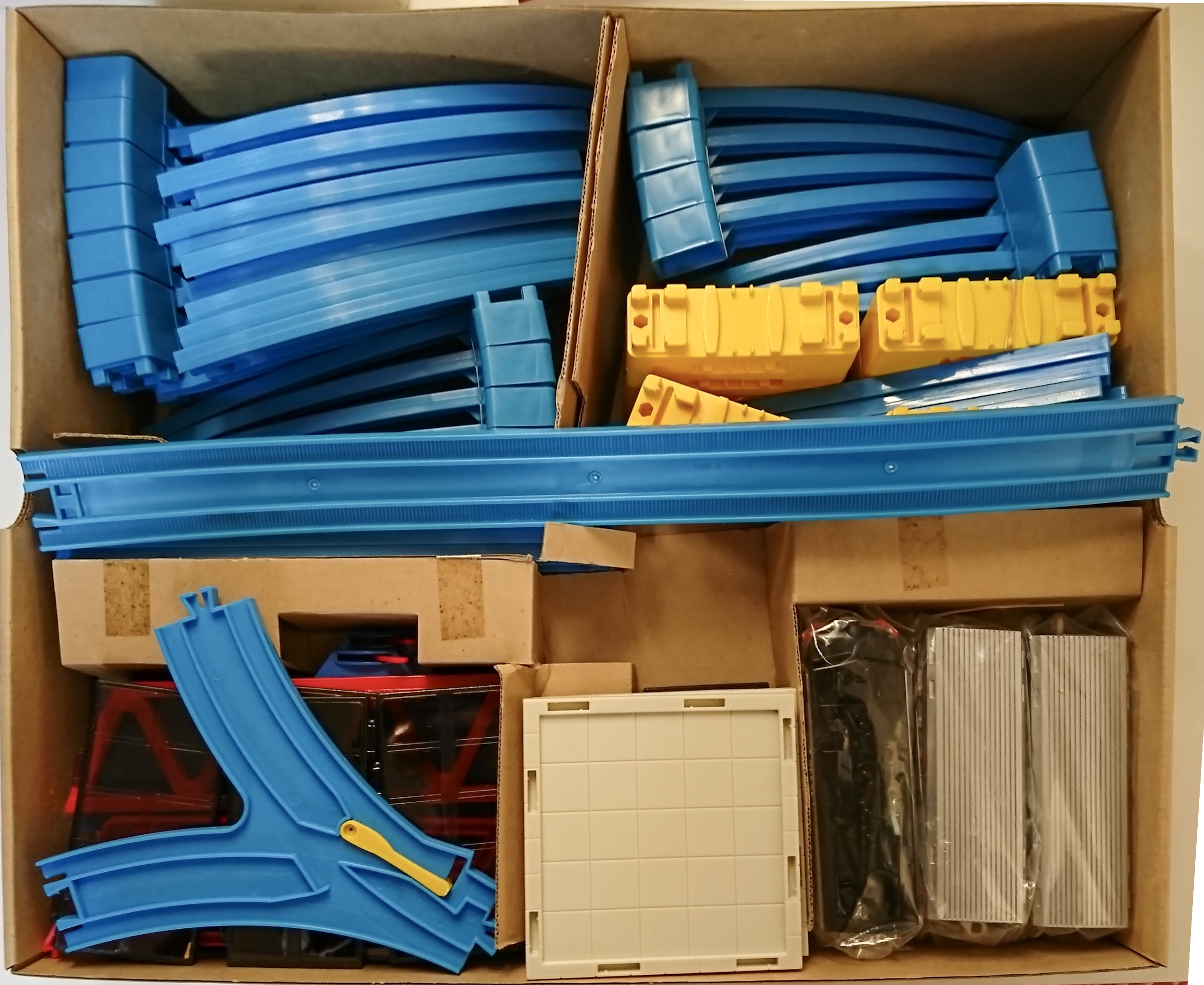 動感號の高級セット。昔から受け継がれる半地上・半高架・分岐ありのレイアウトですが、Y字ポイントを使っての分岐や留置線が組み込まれているところが日本国内で見るセットとは少し趣きが異なります。他に「都会の駅」「ブロックトンネル」「ニュー踏切」「大きな鉄橋」も入っており、その名の通りなかなか「高級」です。