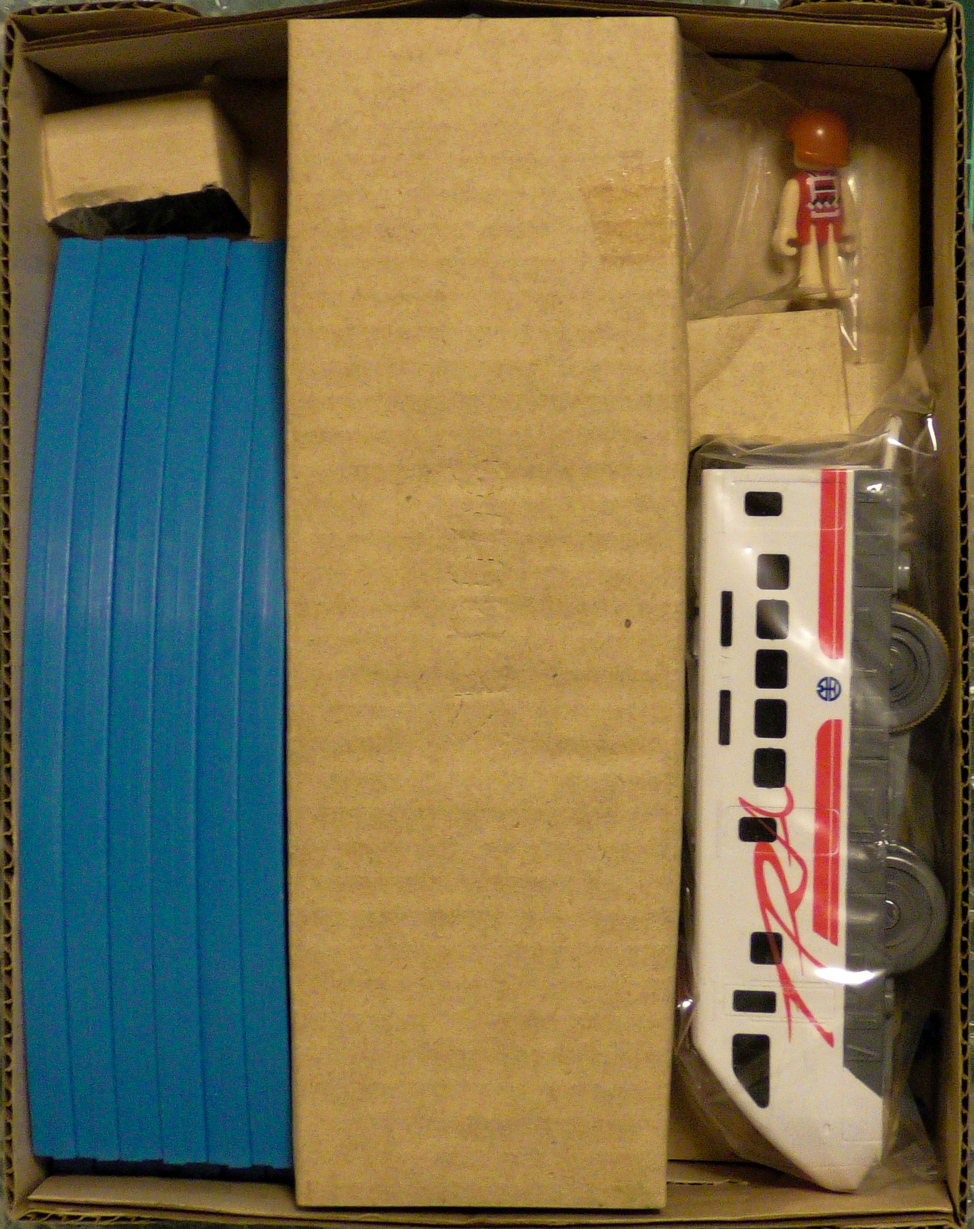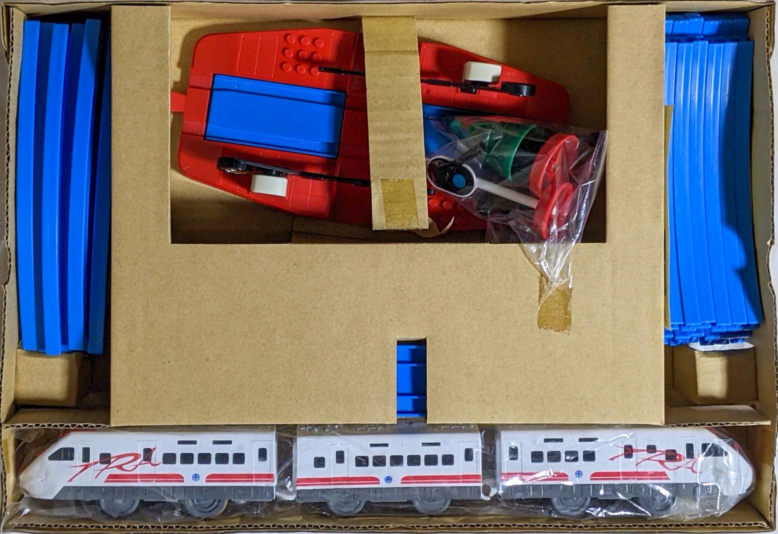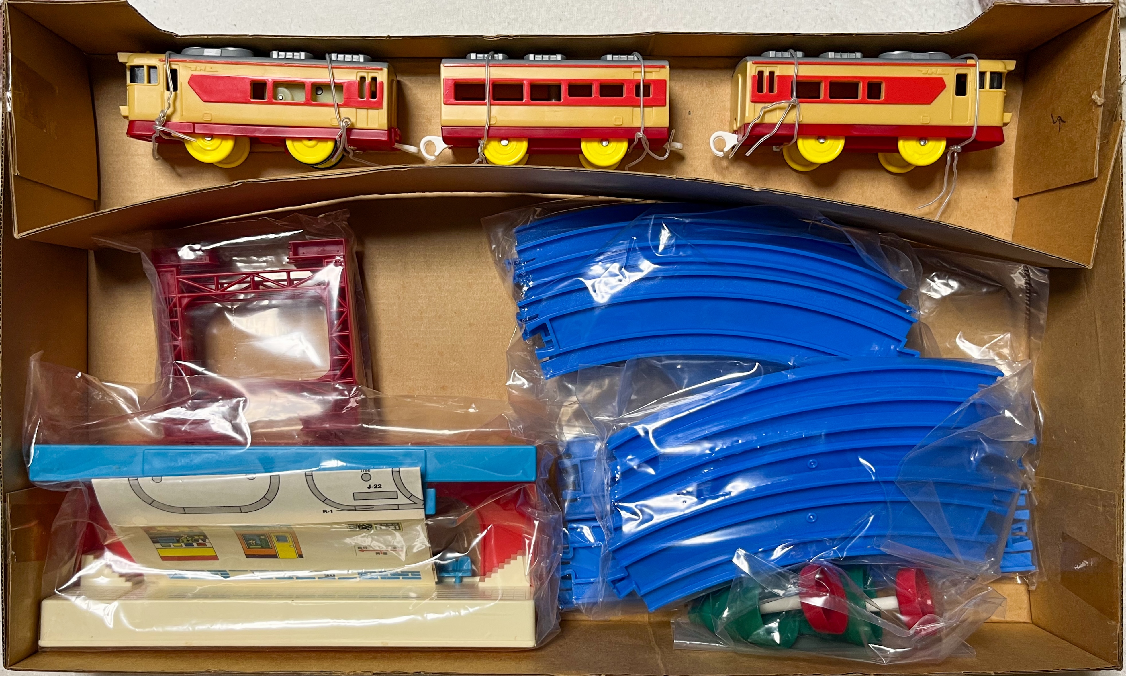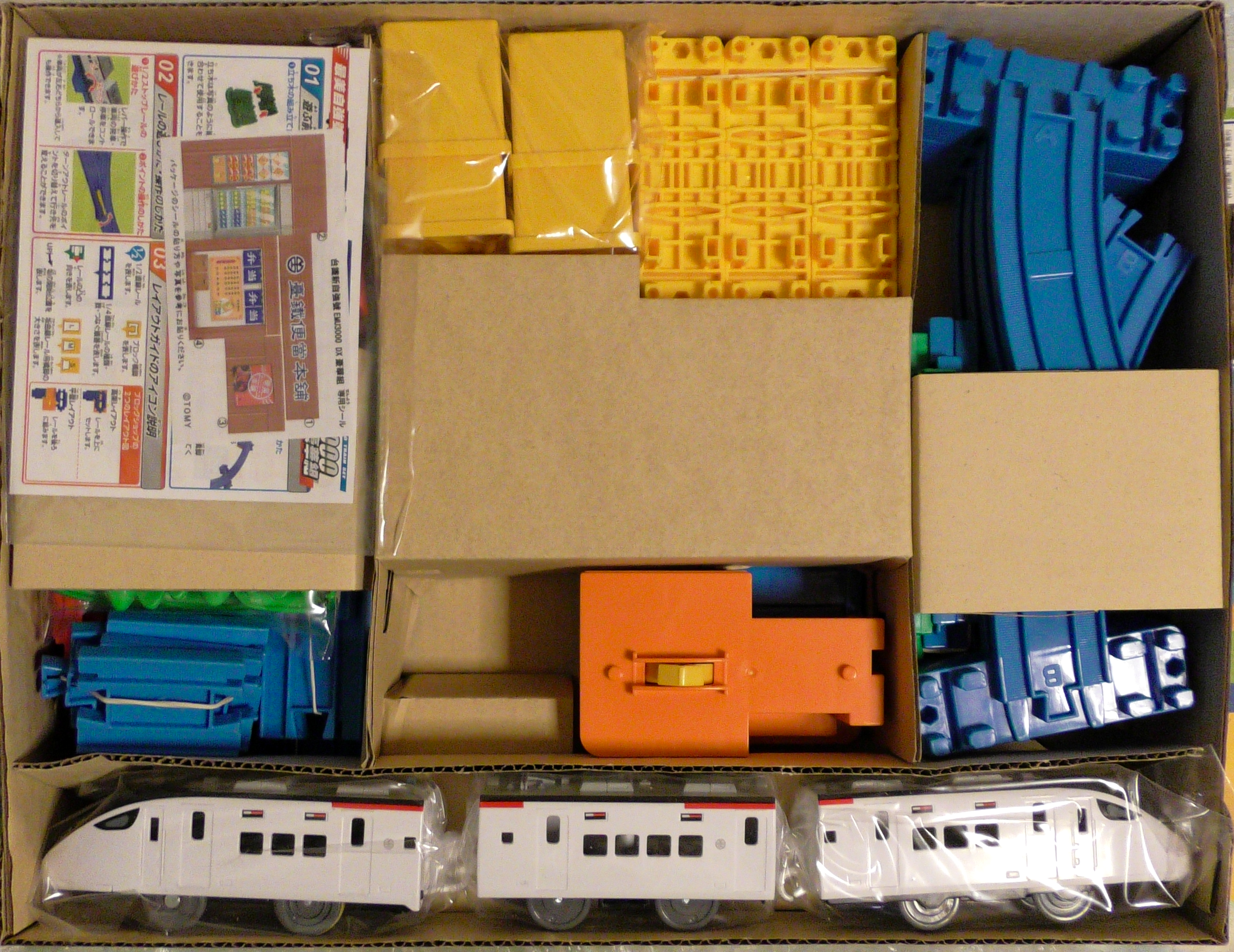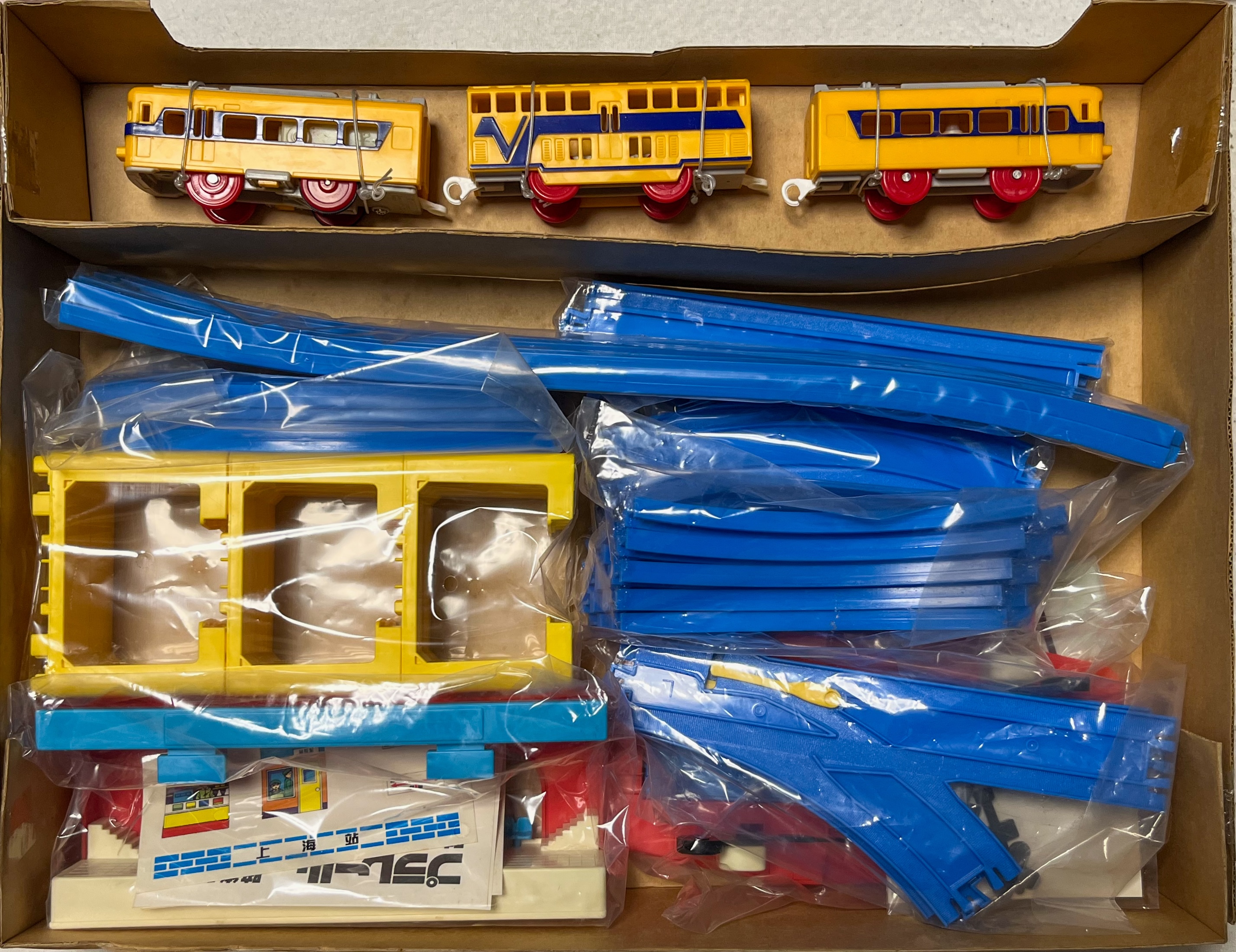 立体交差セットに準じています。駅は「ちかてつの駅」の色変え品である「上海站」が付属します。外箱と内箱は独自のものとなっており、外箱は上部に3両全てが見える窓付き、内箱は薄手の段ボールに車両のみが固定されており、各レール・情景部品は袋に小分けされ雑に入れられているのが特徴的です。