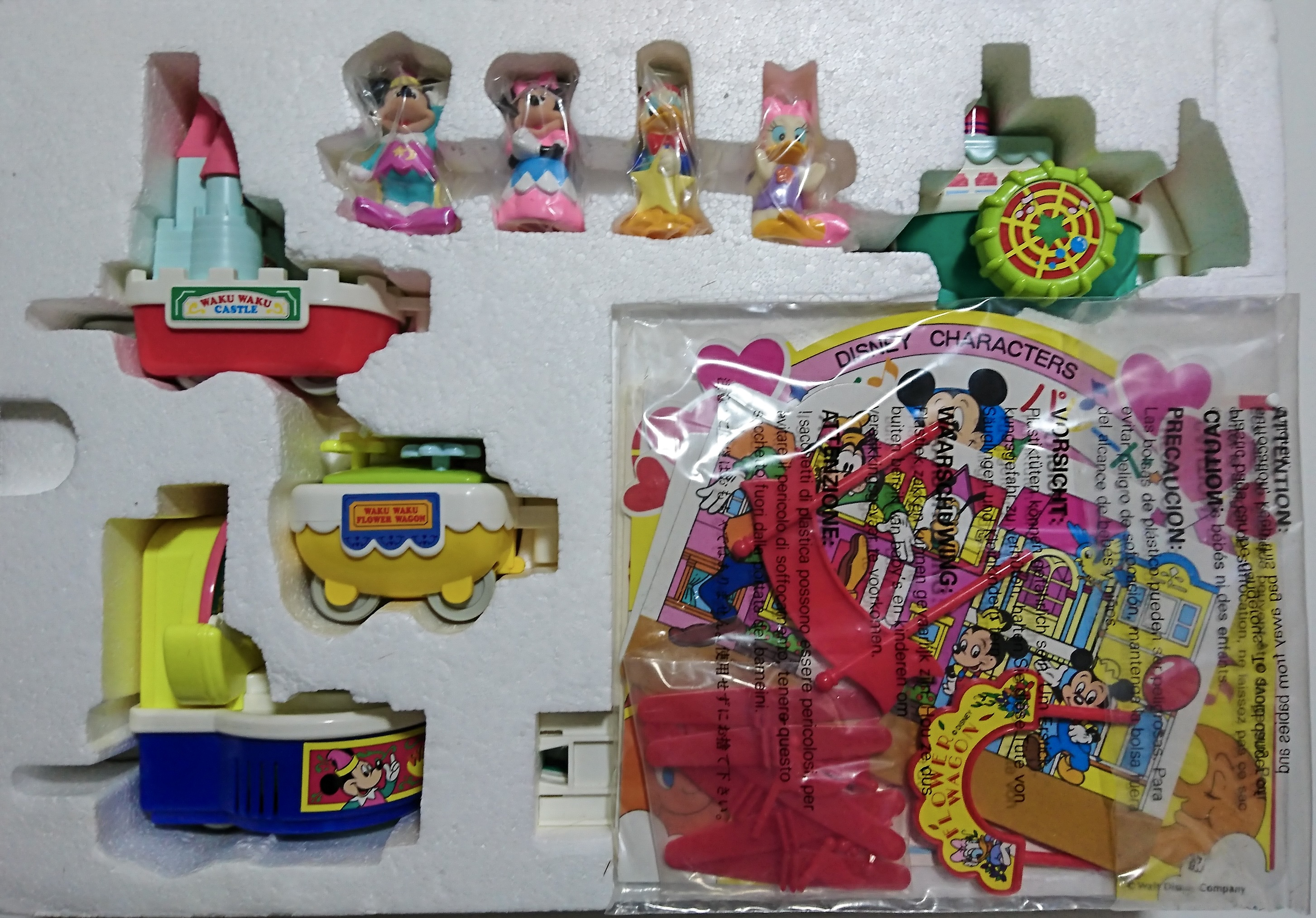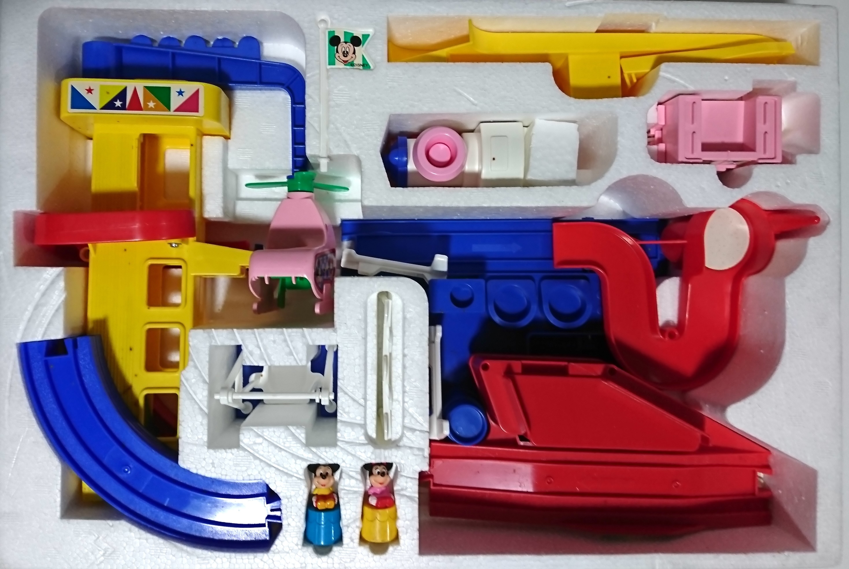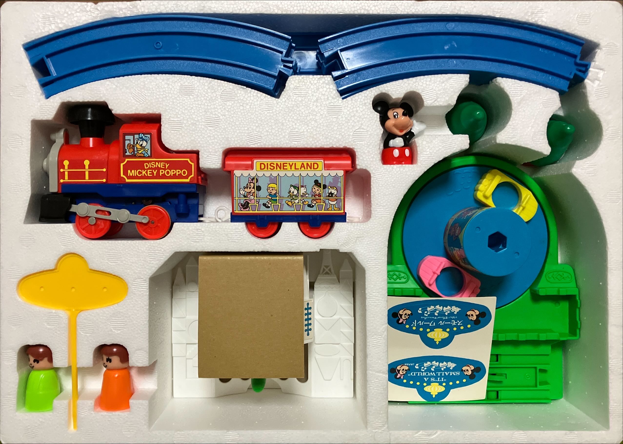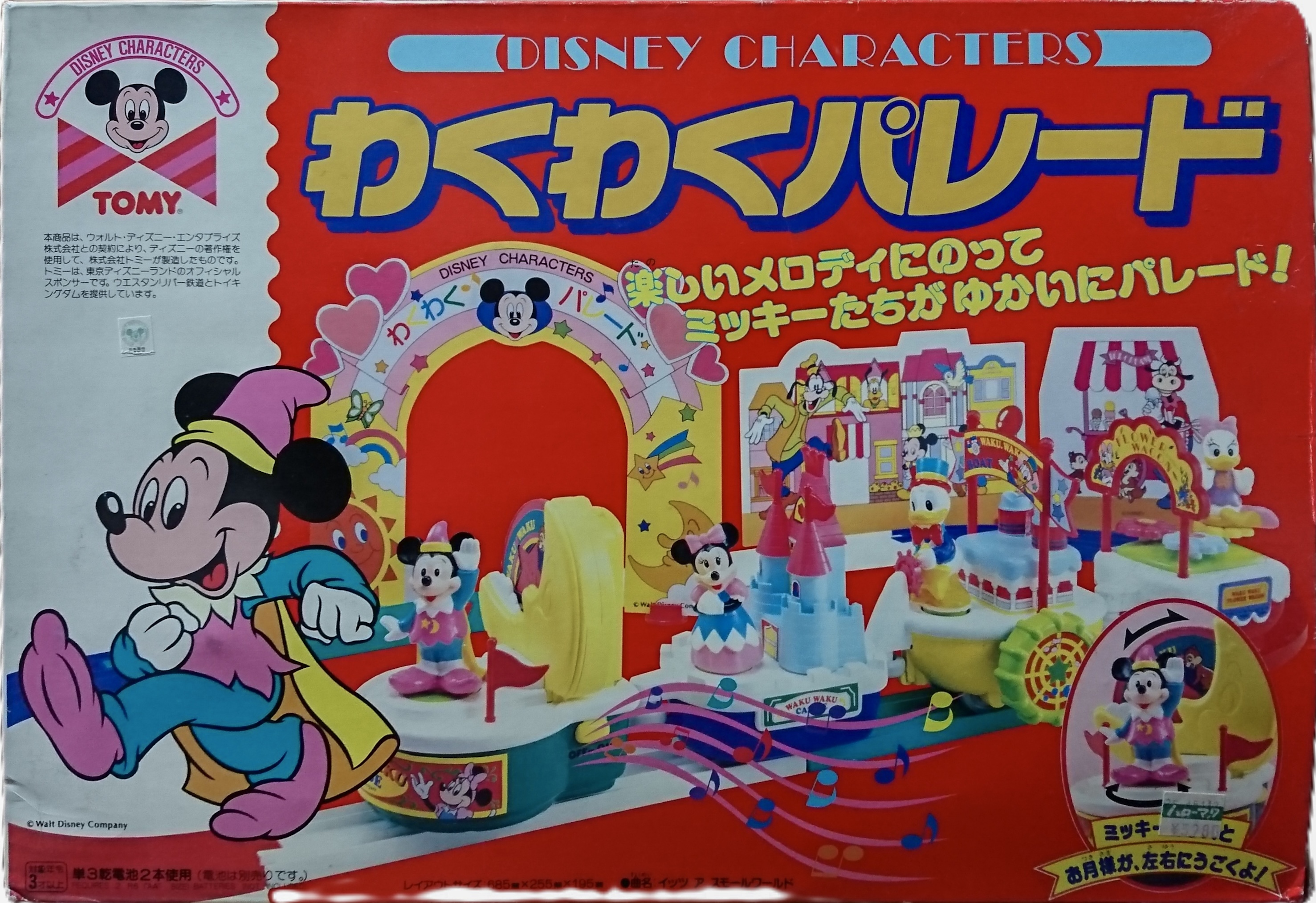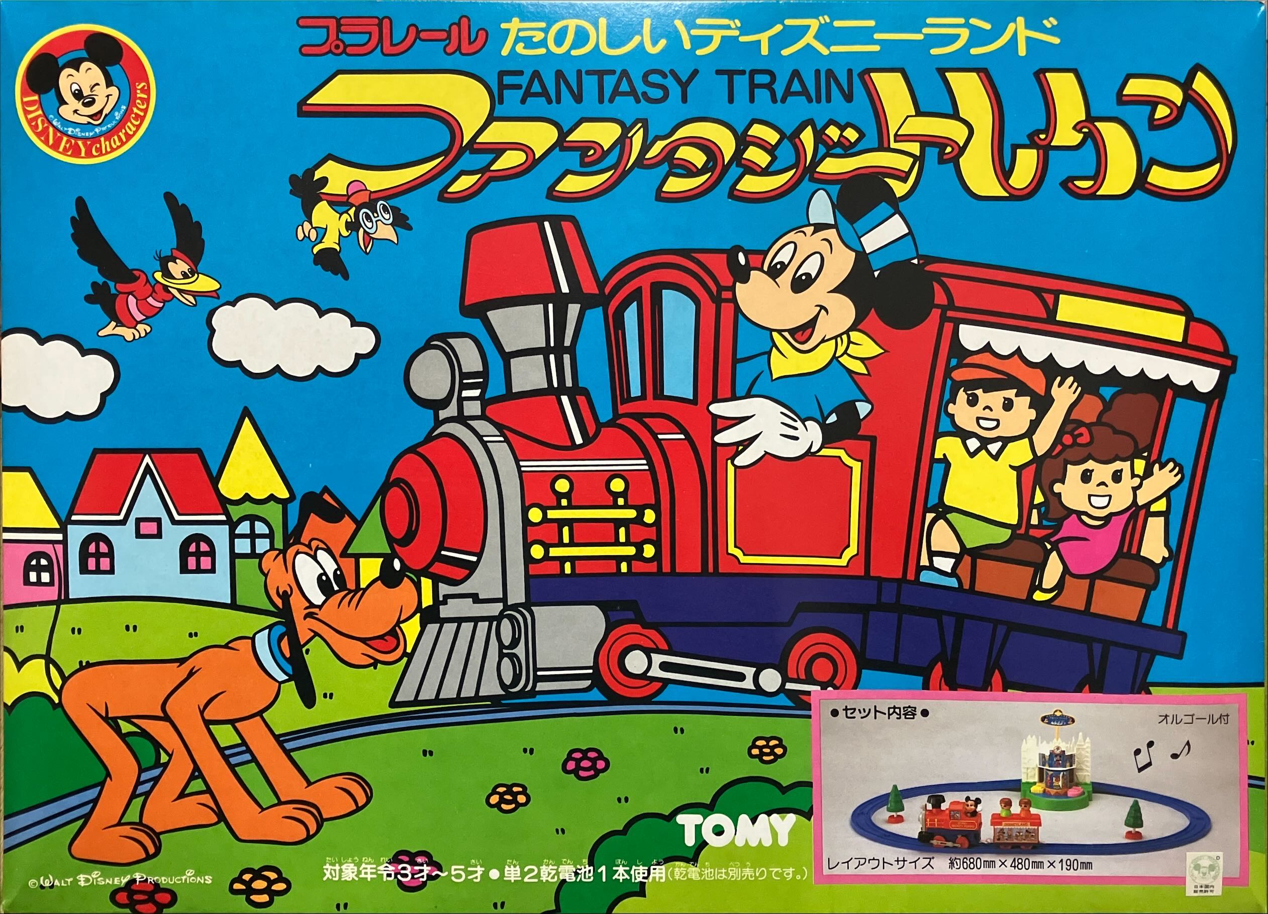 ディズニーランドでのパレードをモチーフとしたセットです。車両、もといパレードのカートは先頭からミッキーと月・ミニーとお城・ドナルドと船・デイジーと花の4両編成で構成されています。レールは曲線が赤と青、直線が白と緑の4色。後年のジャスコ限定レールに似ていますが、緑と青の色味が若干異なります。